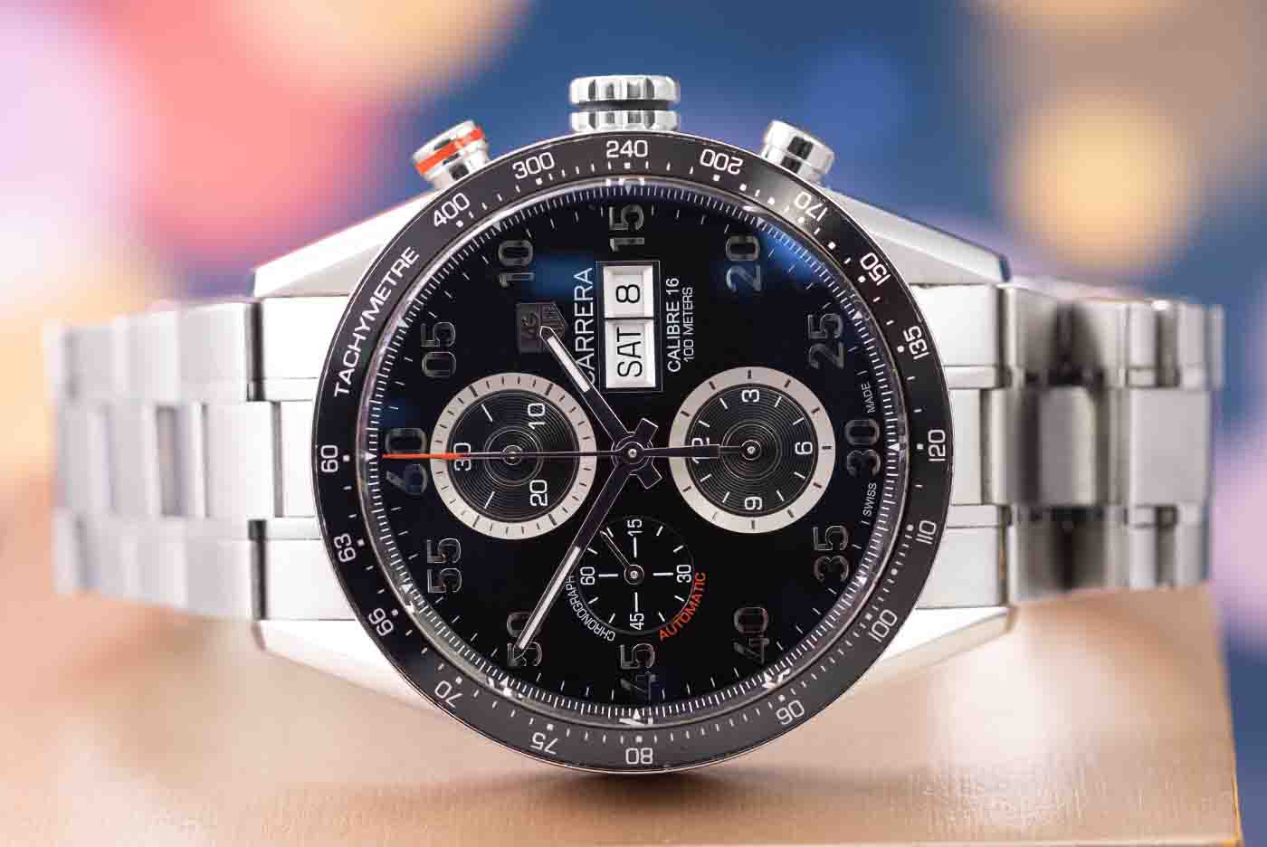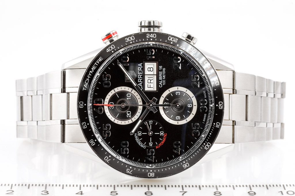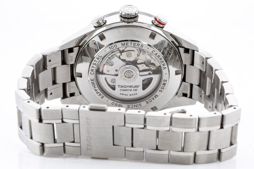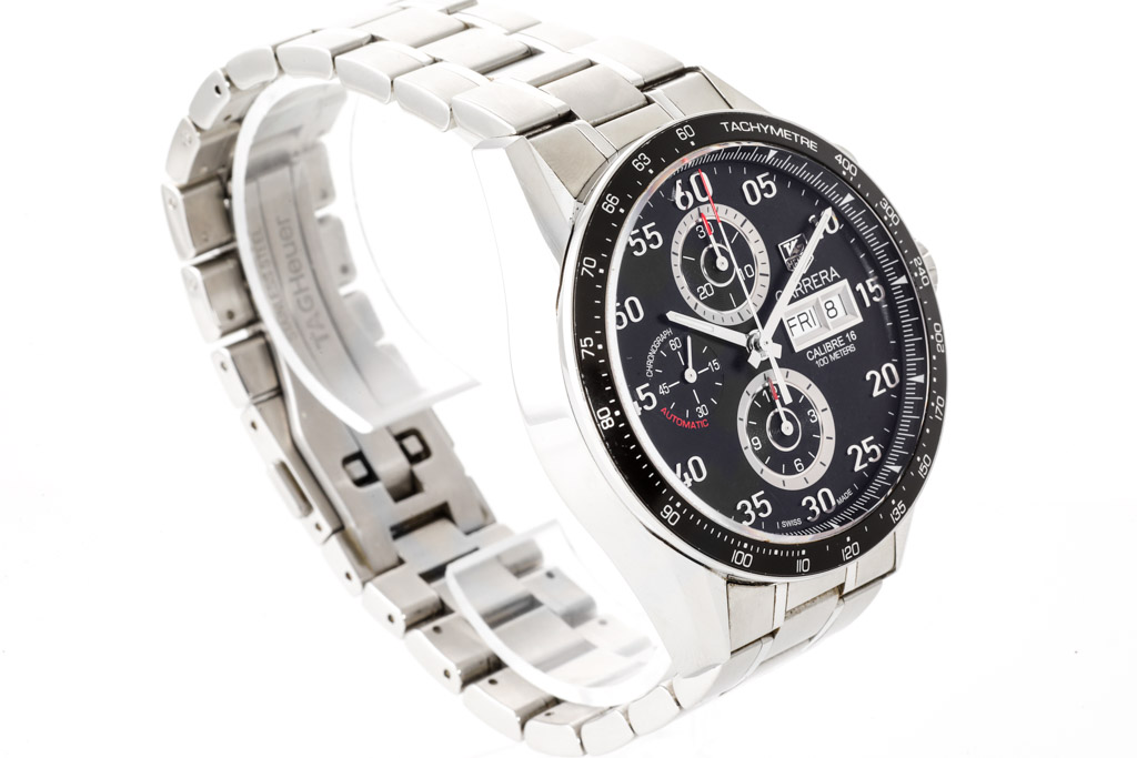 TAG Heuer Carrera stainless steel automatic mens watch. Black chronograph dial, day & date, case diameter: 43mm, wrist size: 20cm, Swiss made. Ref# CV2A10.BA0796. With TAG Heuer stainless steel bracelet and clasp. With Certificate of Authenticity, TAG Heuer International Guarantee card dated 12/01/2011 and TAG Heuer box. 3 month FSA warranty. (Pre-owned)