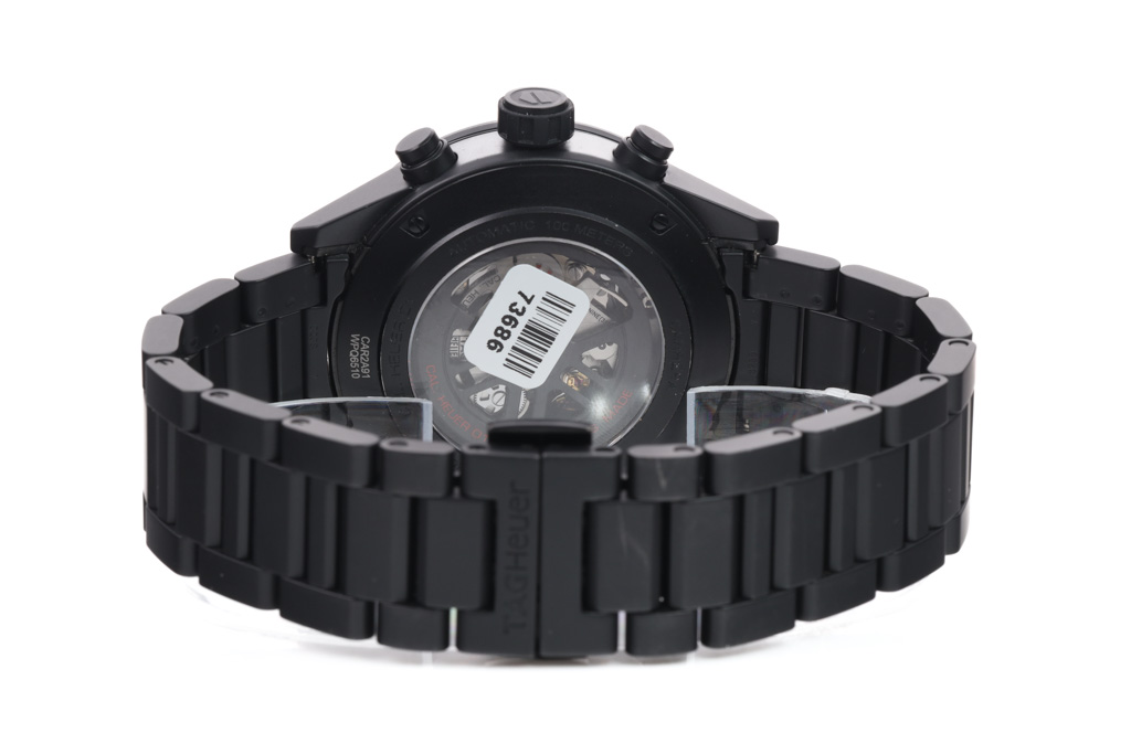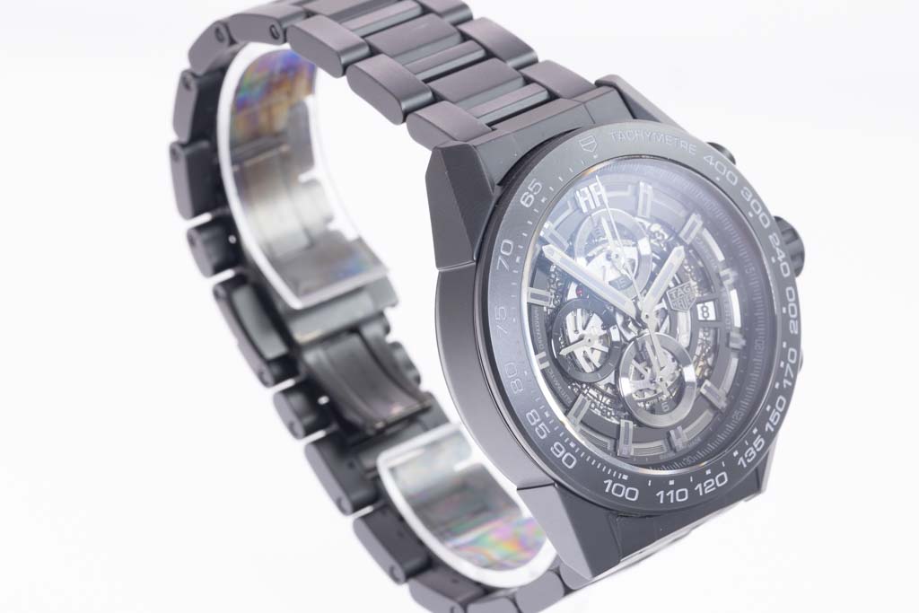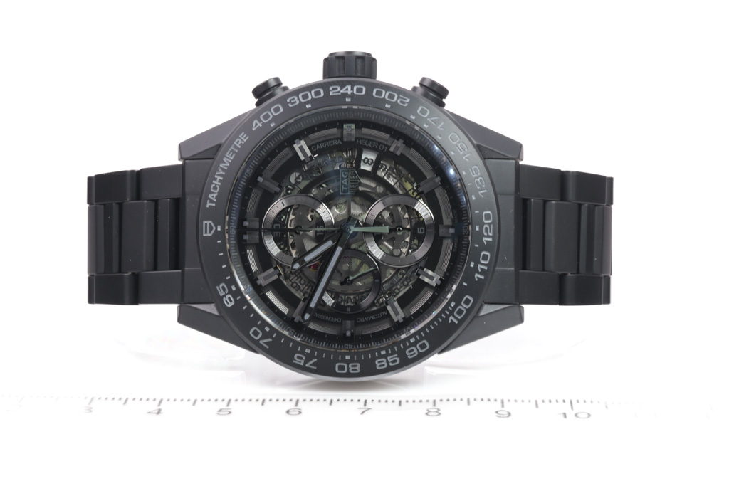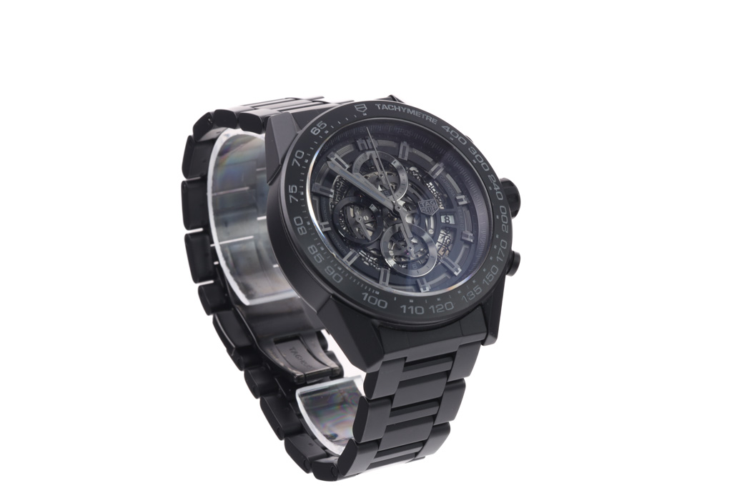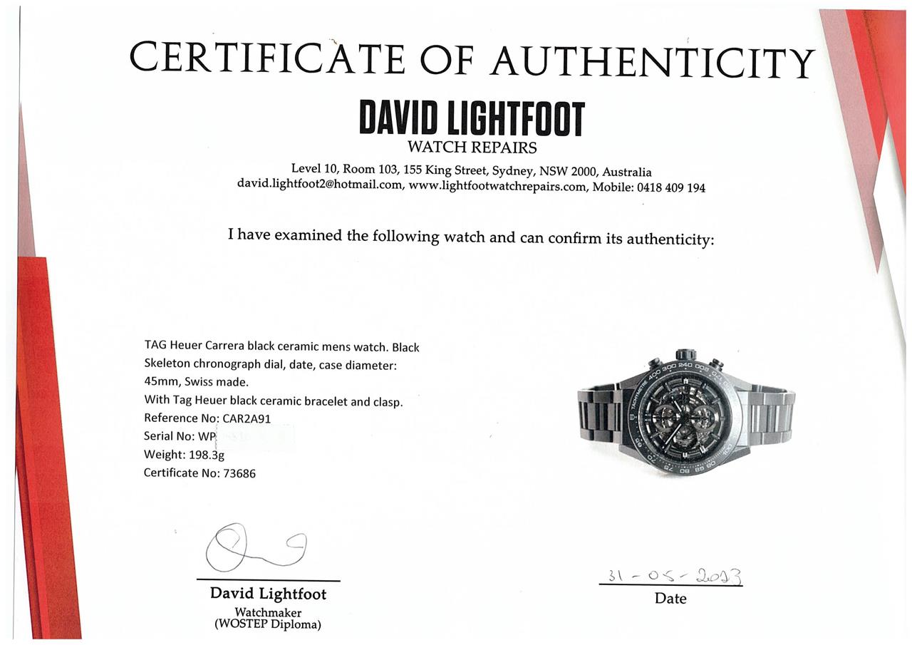 TAG Heuer Carrera black ceramic mens watch. Black Skeleton chronograph dial, date, case diameter: 45mm, wrist size: 20.5cm, Swiss made. Ref# CAR2A91. With Tag Heuer black ceramic bracelet and clasp. With Certificate of Authenticity, TAG Heuer International Warranty card dated 29/03/2018 and TAG Heuer box. 3 month FSA warranty. (Pre-owned)