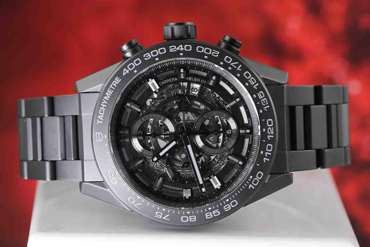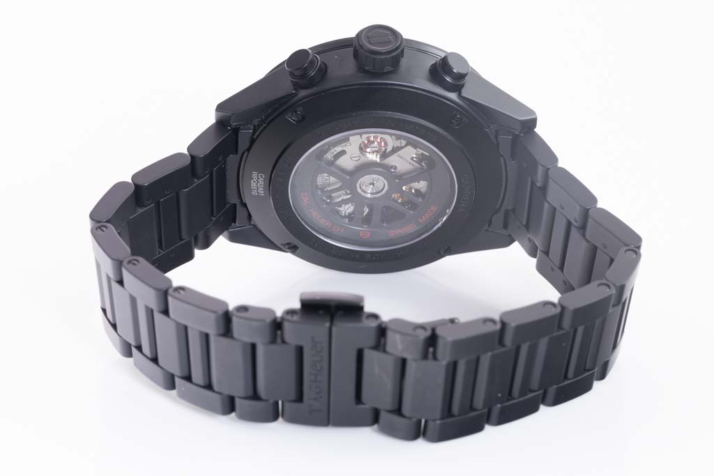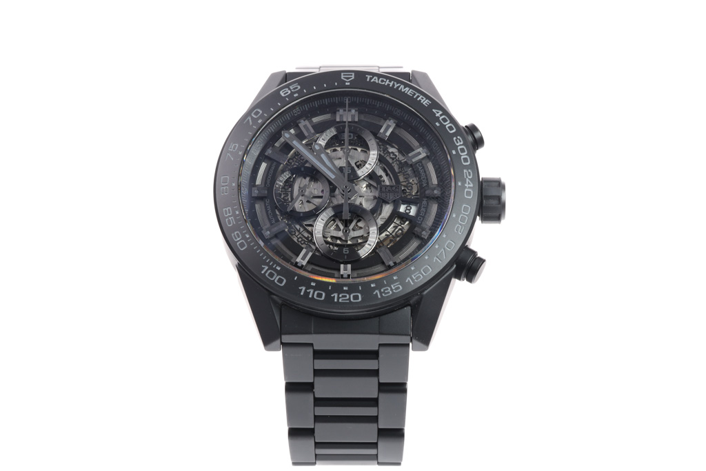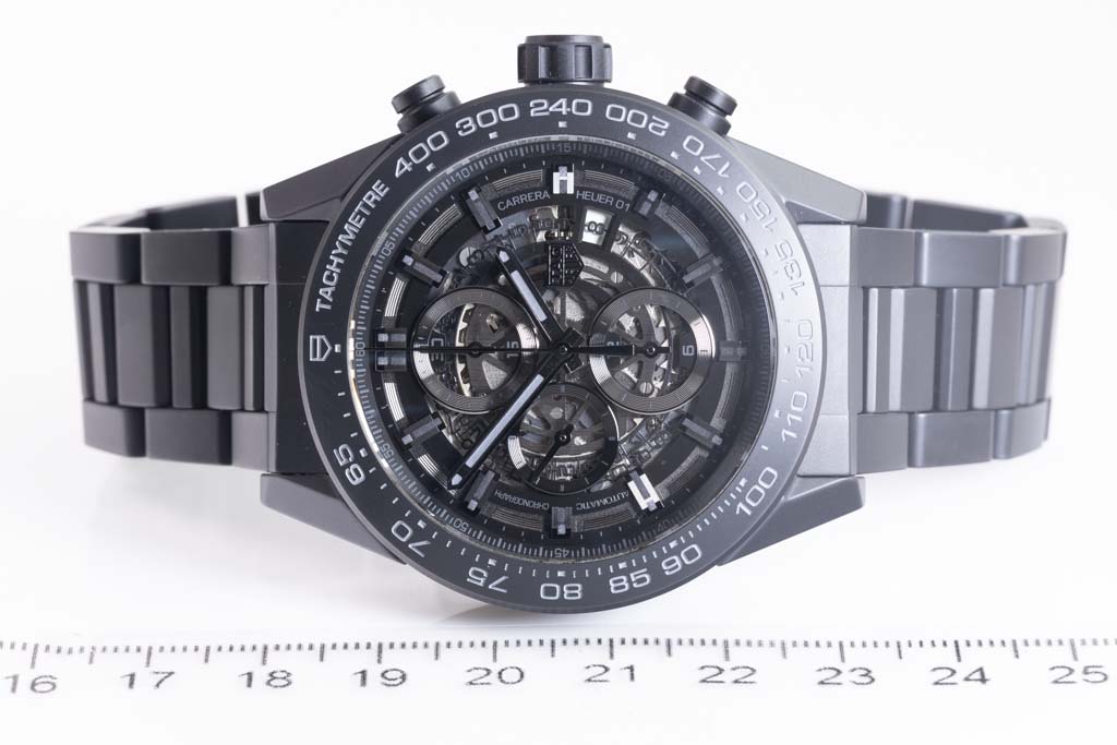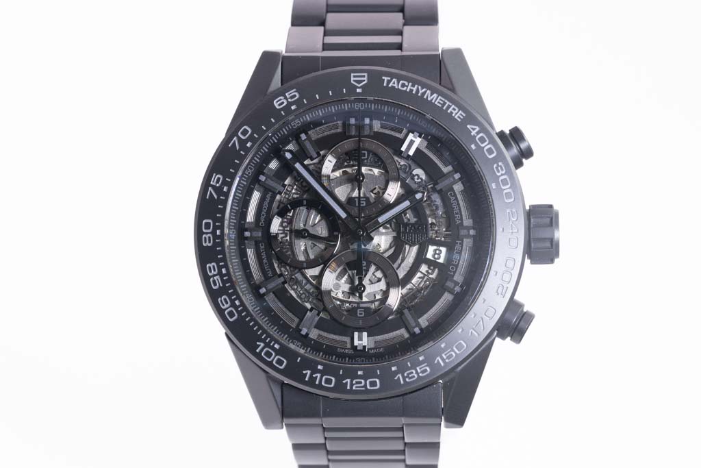 TAG Heuer Carrera black ceramic mens watch. Black Skeleton chronograph dial, date, case diameter: 45mm, wrist size: 20.5cm, Swiss made. Ref# CAR2A91. With Tag Heuer black ceramic bracelet and clasp. With Certificate of Authenticity, TAG Heuer International Warranty card dated 29/03/2018 and TAG Heuer box. 3 month FSA warranty. (Pre-owned)