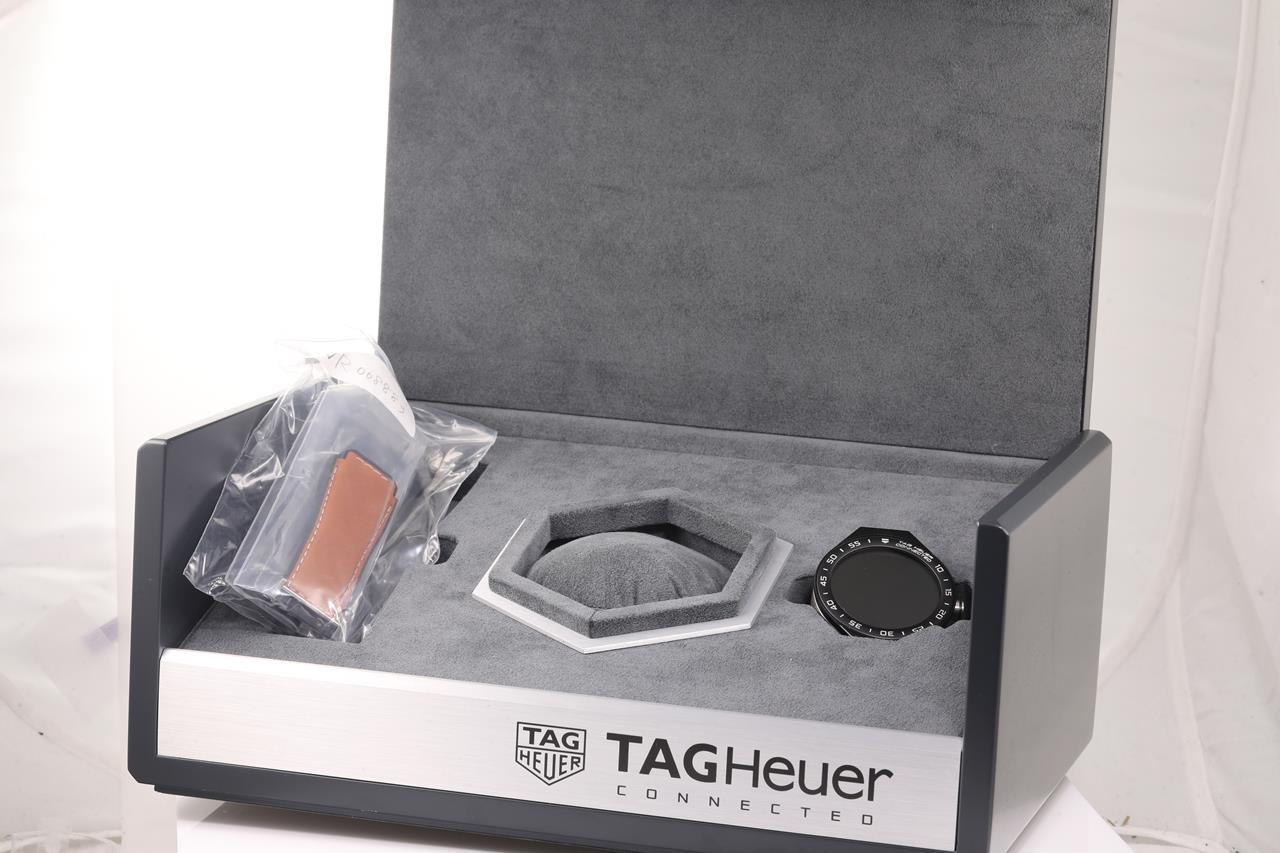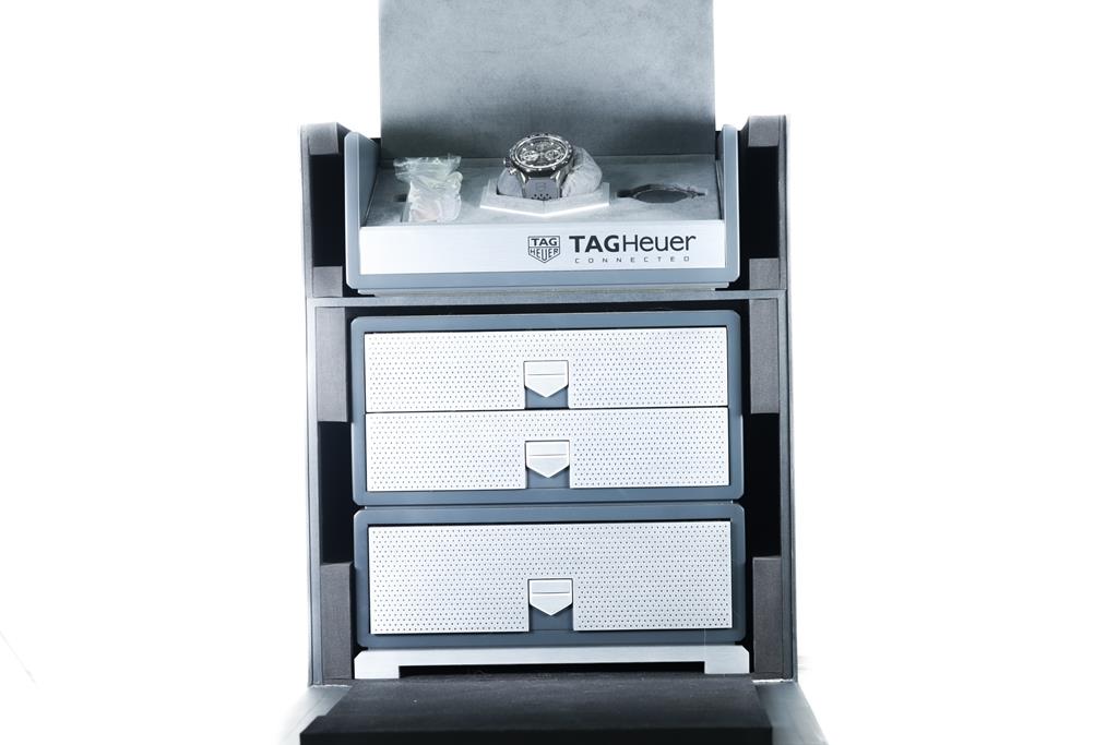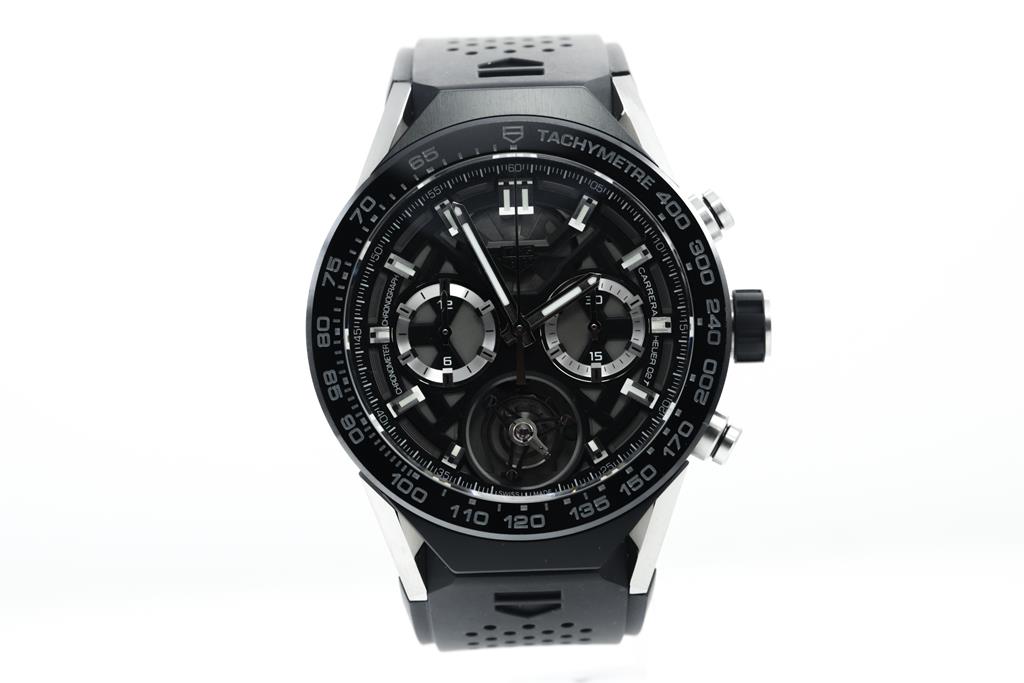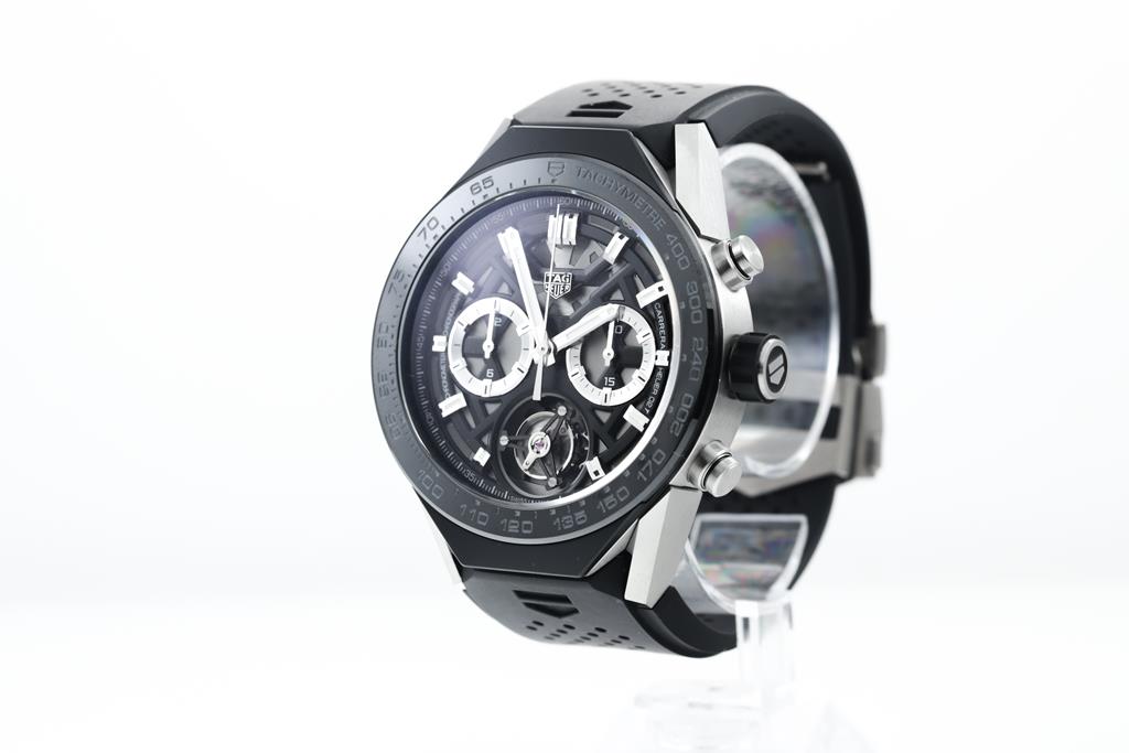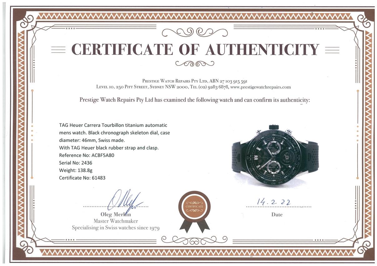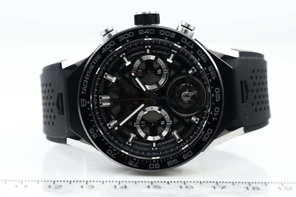 TAG Heuer Carrera Tourbillon titanium automatic mens watch. Black chronograph skeleton dial, case diameter: 46mm, wrist size: 20cm, Swiss made. Ref# ACBF5A80. With TAG Heuer black rubber strap and clasp. With Certificate of Authenticity, TAG Heuer Connected Modular watch with Ref# SBF8A8001, 24 months TAG Heuer Repair Warranty, TAG Heuer Limited International Warranty card dated 09/08/2022 and TAG Heuer box. Note: Modular watch, no warranty applies. (Pre-owned)