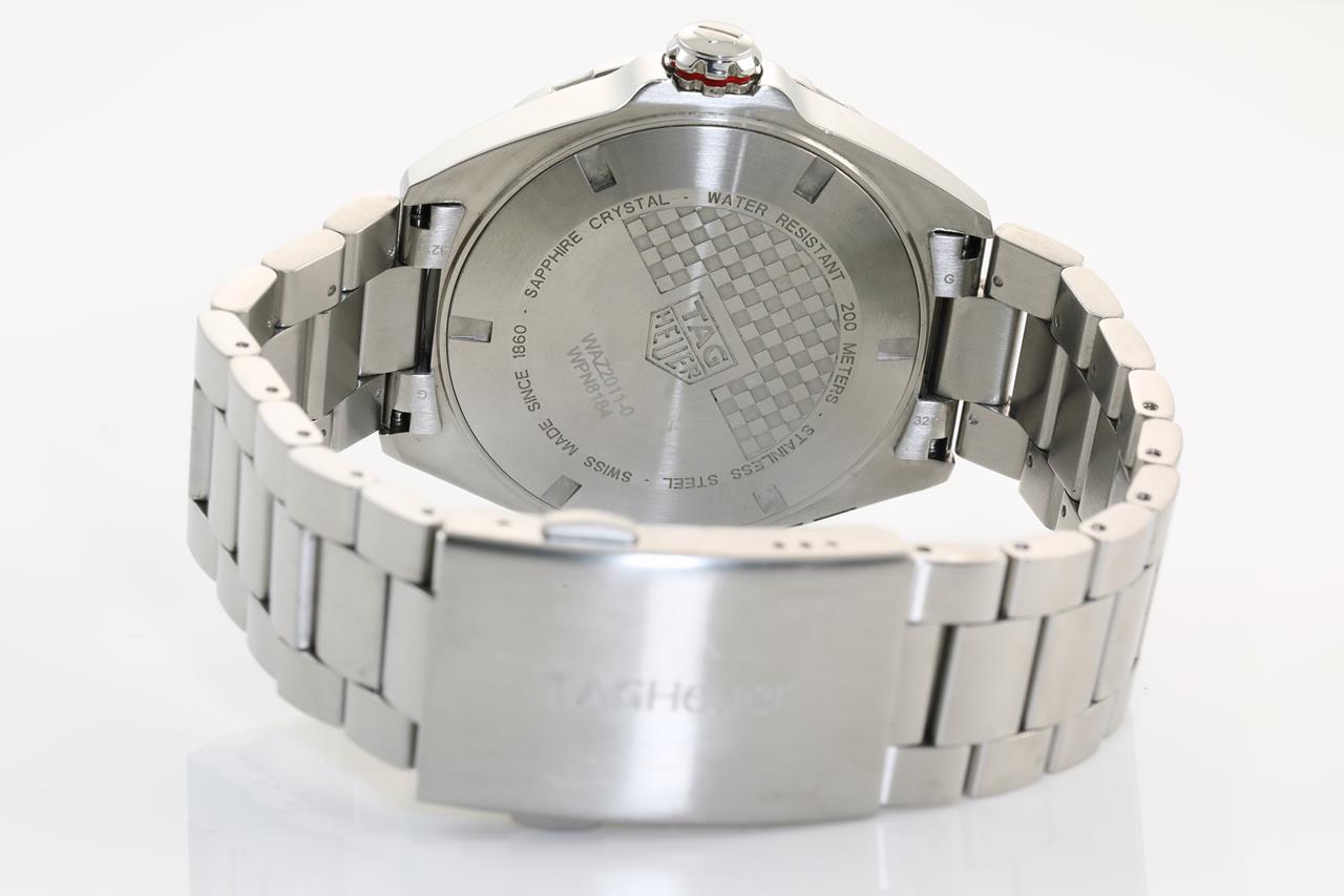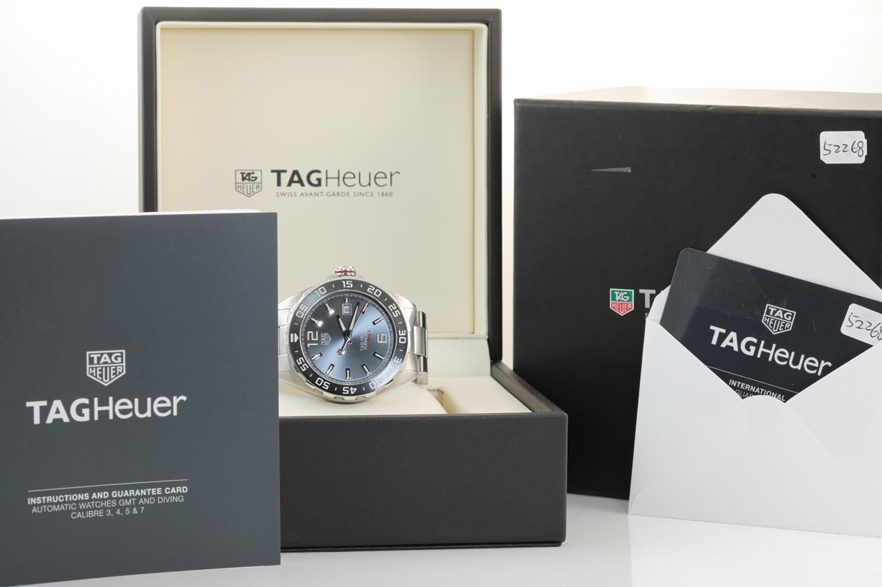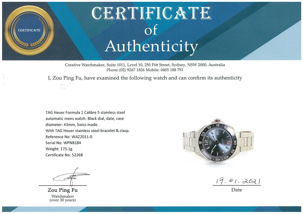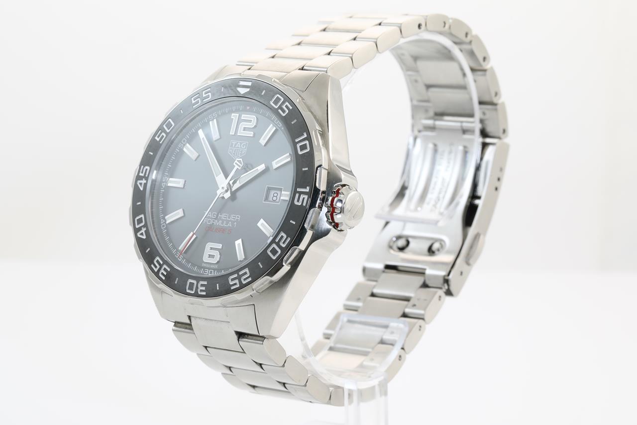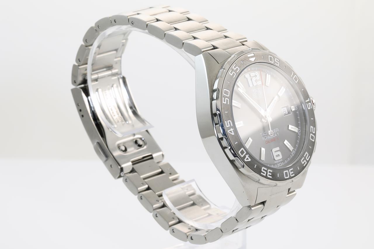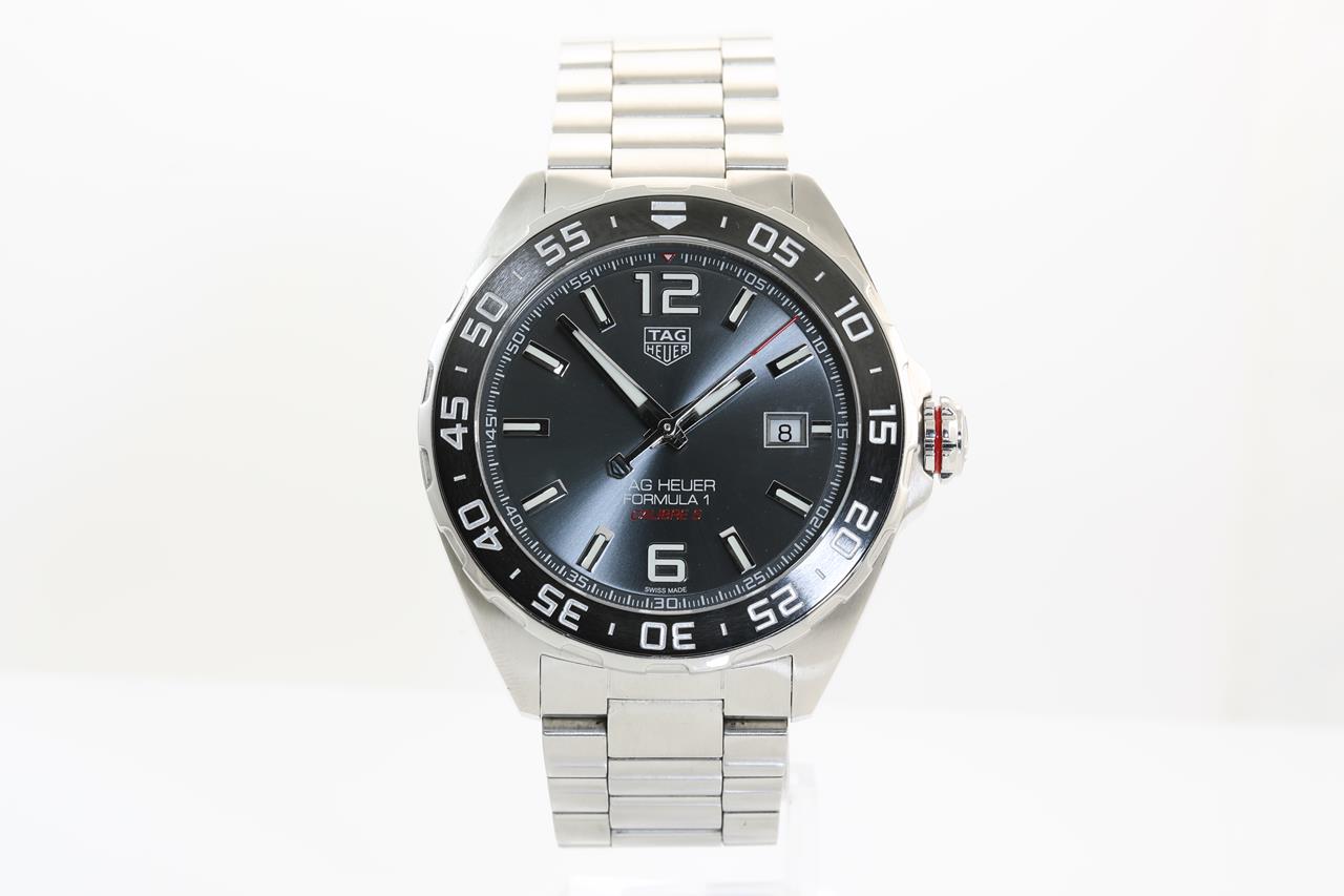 TAG Heuer Formula 1 Calibre 5 stainless steel automatic mens watch. Grey dial, date, case diameter: 43mm, wrist size: 19cm, Swiss made. Ref# WAZ2011-0. With TAG Heuer stainless steel bracelet & clasp. With certificate of authenticity. With TAG Heuer international warranty card inside TAG Heuer box. 3 month FSA warranty. (Pre-owned)