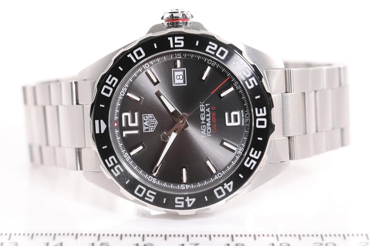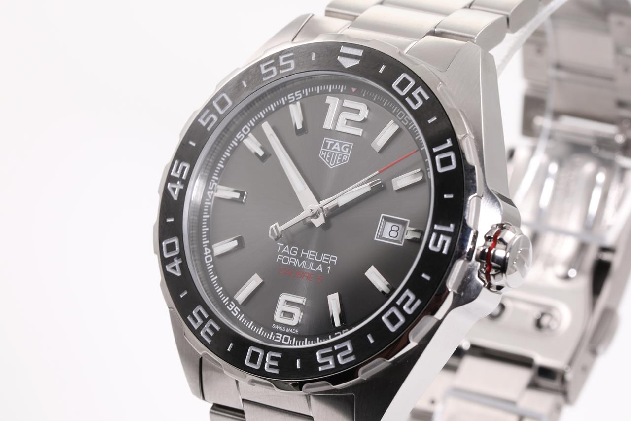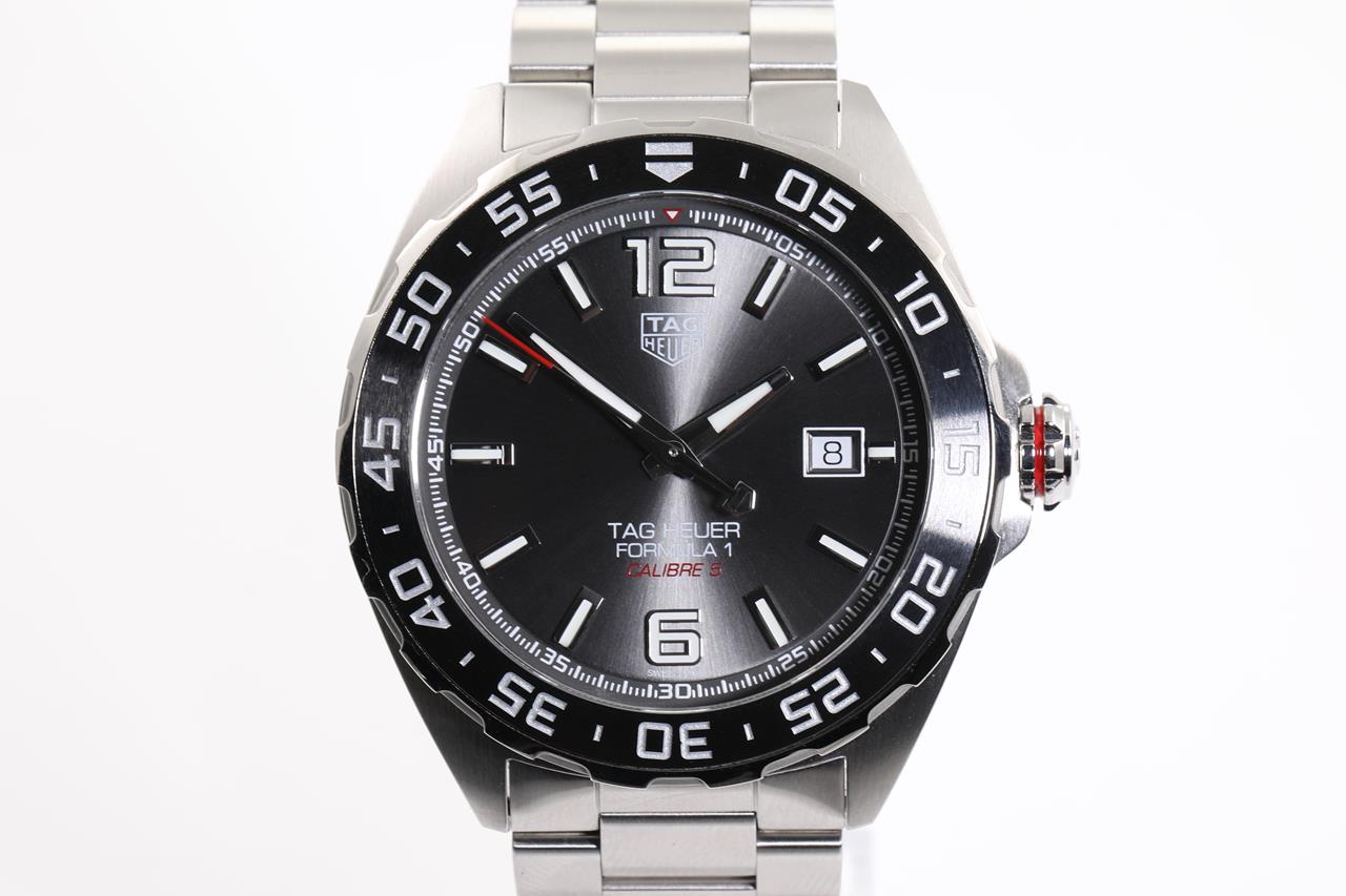 TAG Heuer Formula 1 Calibre 5 stainless steel automatic mens watch. Grey dial, date, case diameter: 43mm, wrist size: 20cm, Swiss made. Ref# WAZ2011. With TAG Heuer stainless steel bracelet & clasp. With Certificate of Authenticity, TAG Heuer International Warranty Card dated 21/10/2021 and TAG Heuer box. 3 month FSA warranty. (Pre-owned)