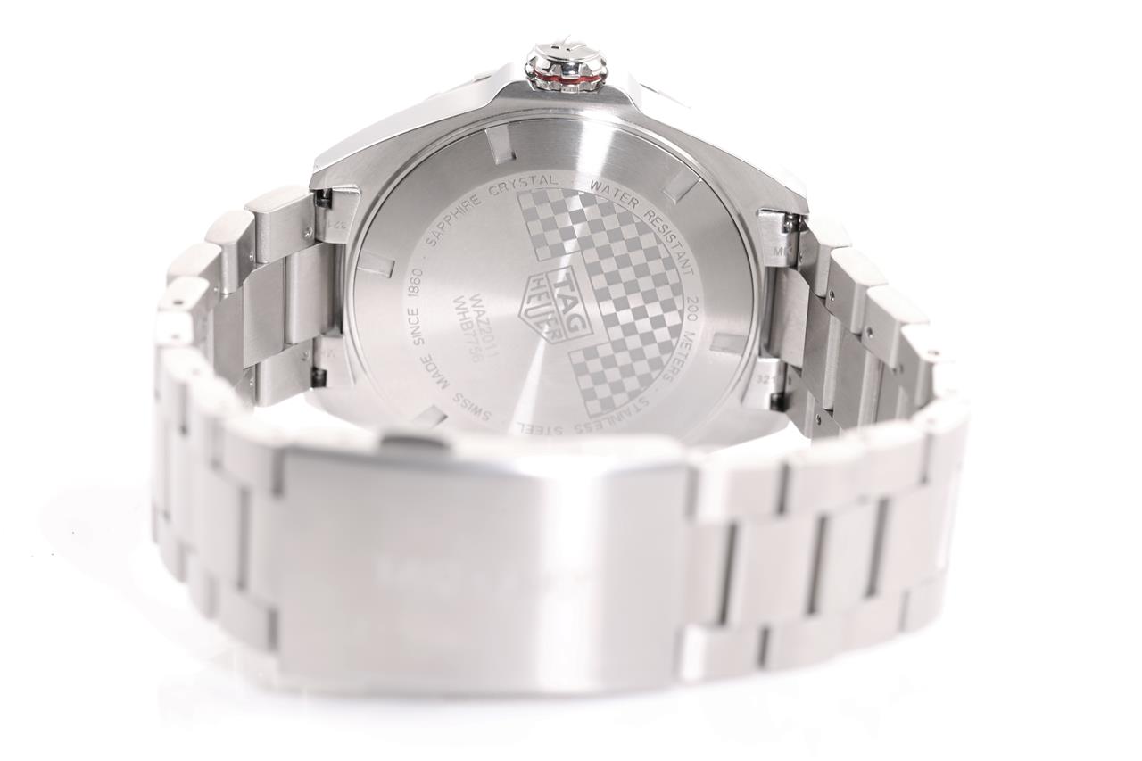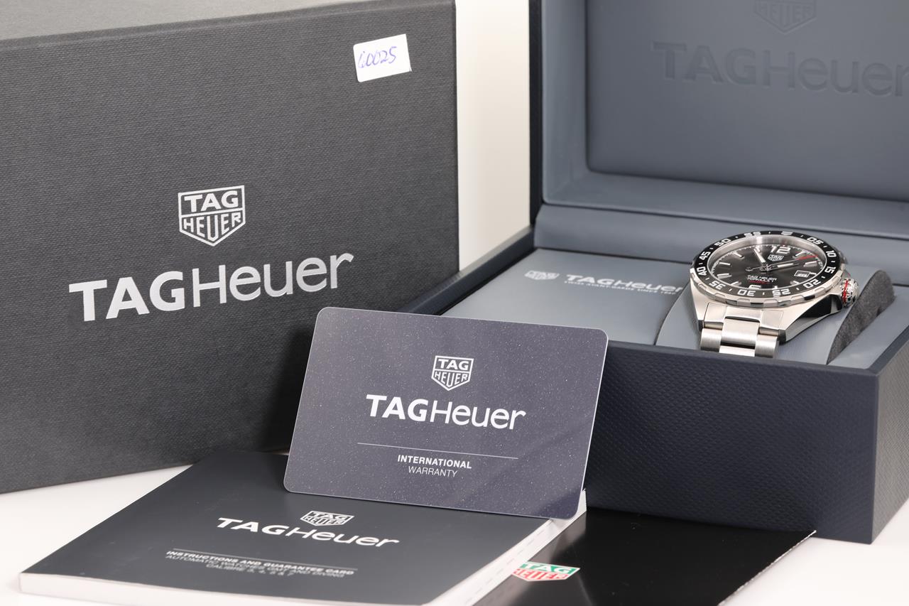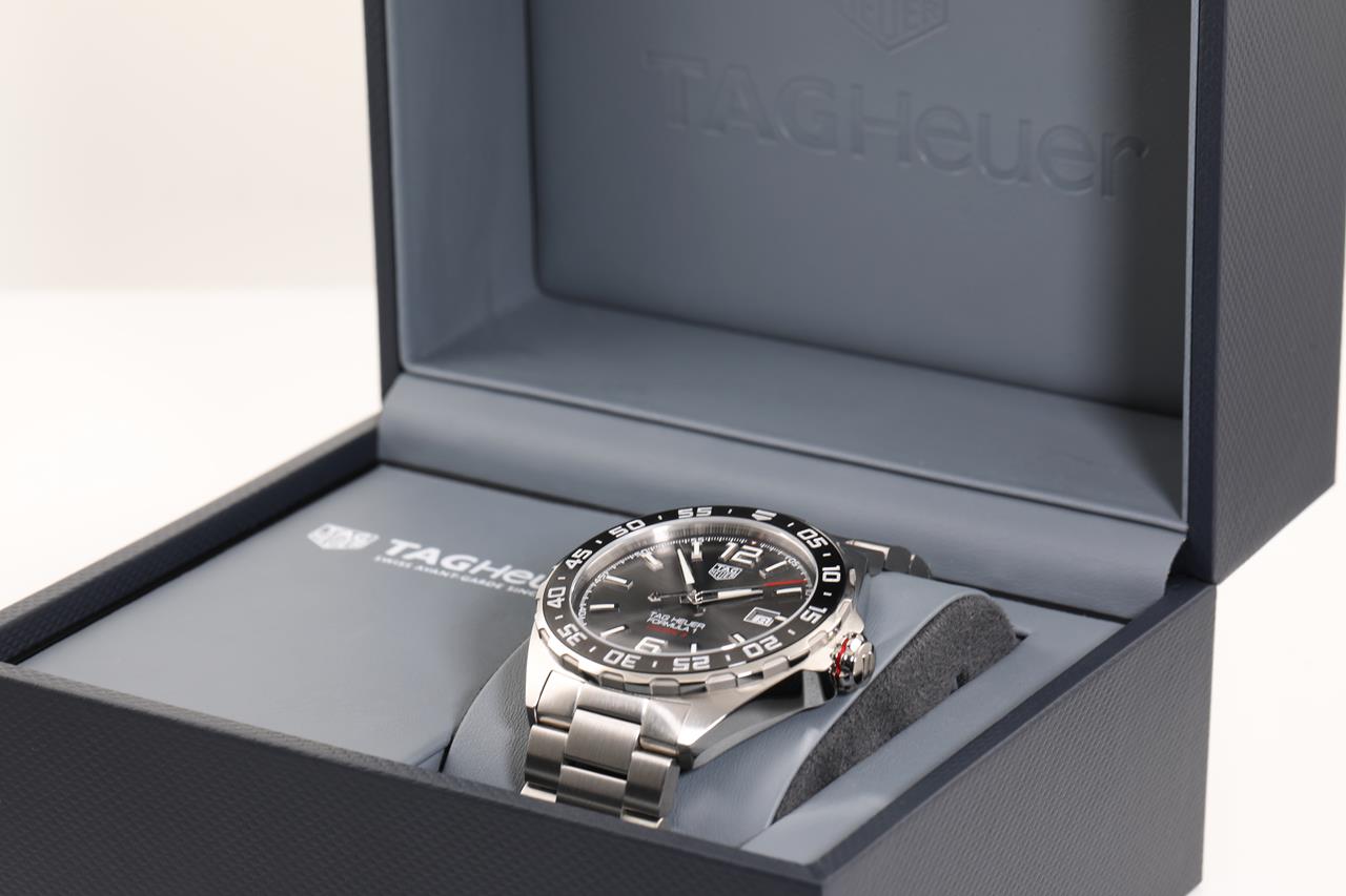 TAG Heuer Formula 1 Calibre 5 stainless steel automatic mens watch. Grey dial, date, case diameter: 43mm, wrist size: 20cm, Swiss made. Ref# WAZ2011. With TAG Heuer stainless steel bracelet & clasp. With Certificate of Authenticity, TAG Heuer International Warranty Card dated 21/10/2021 and TAG Heuer box. 3 month FSA warranty. (Pre-owned)