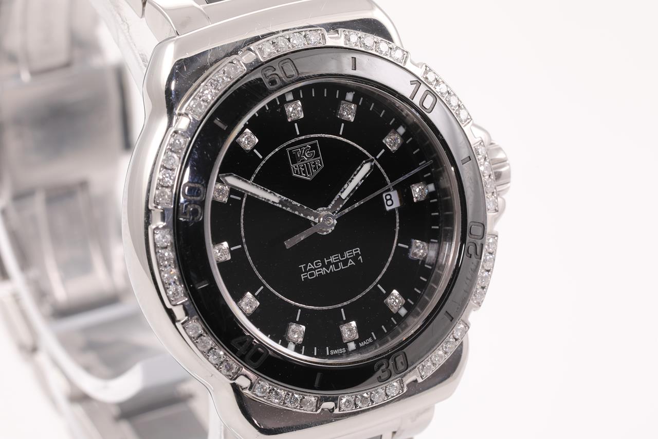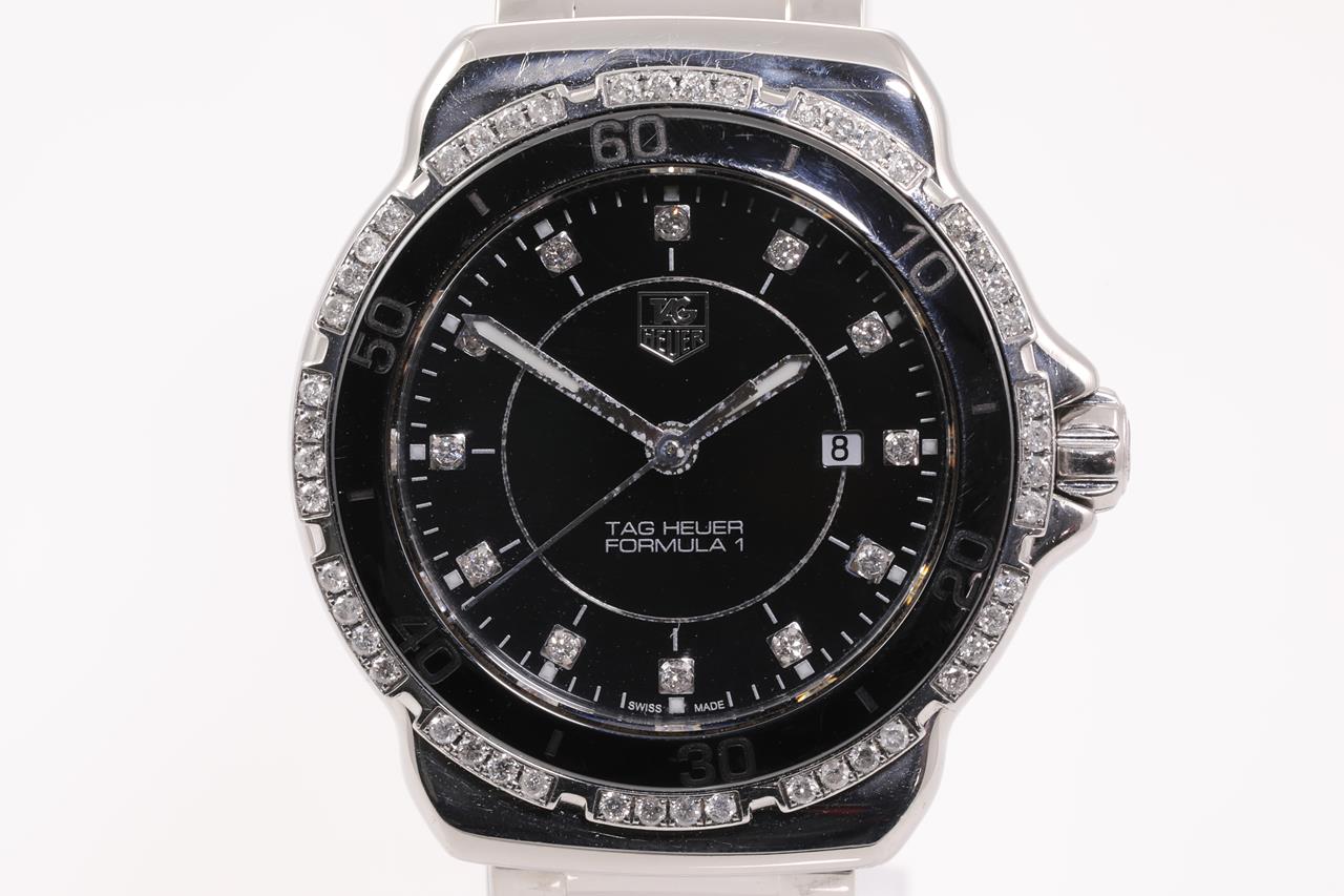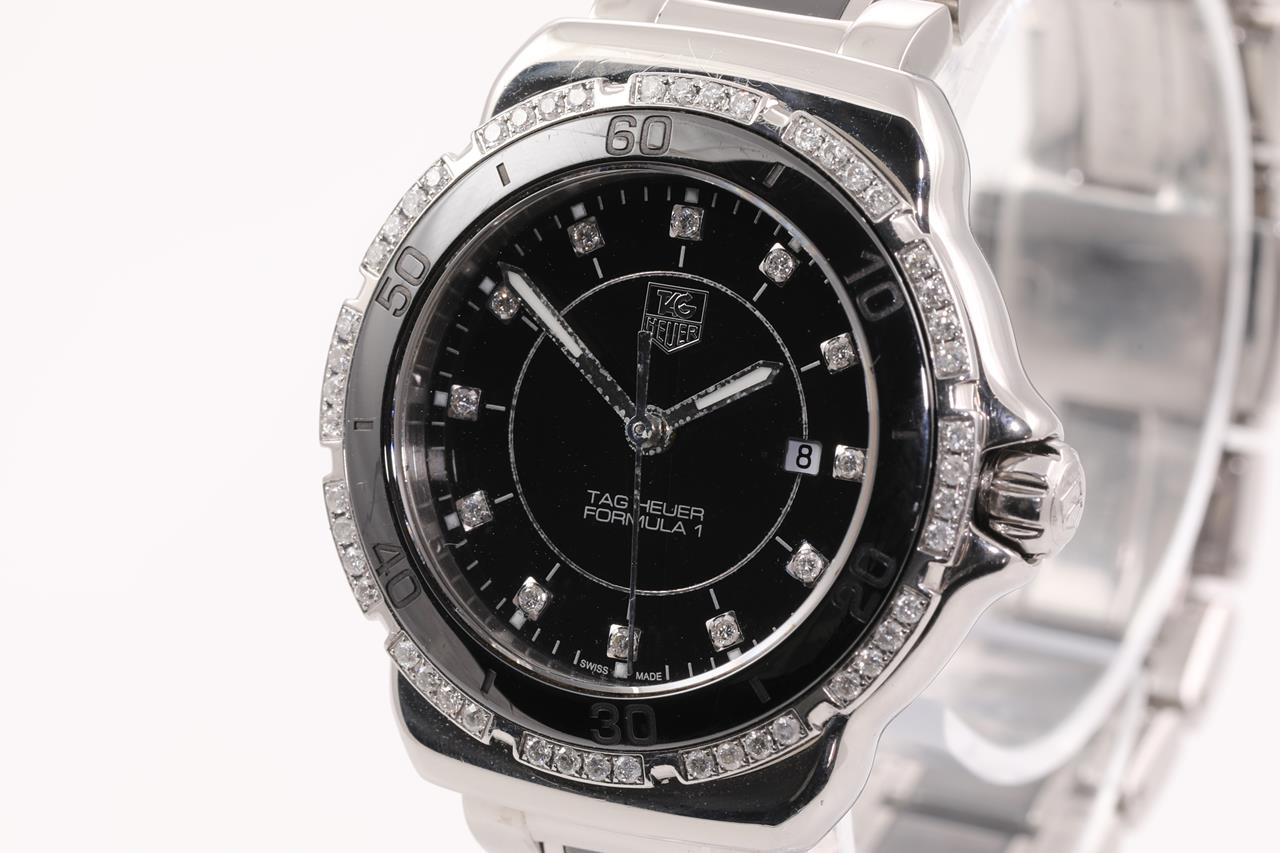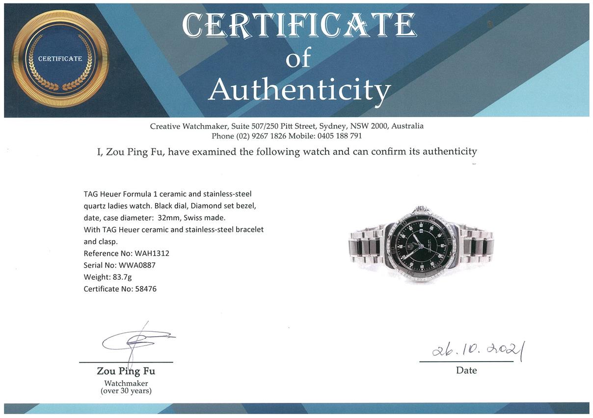 TAG Heuer Formula 1 ceramic and stainless steel quartz ladies watch. Black dial, Diamond set bezel, Diamond indicators, date, case diameter: 32mm, wrist size: 16cm, Swiss made. Ref# WAH1312. With TAG Heuer ceramic and stainless steel bracelet and clasp. With Certificate of Authenticity and Max Schweizer Swiss Watch Service card dated 15/10/21. 3 month FSA warranty. (Pre-owned)