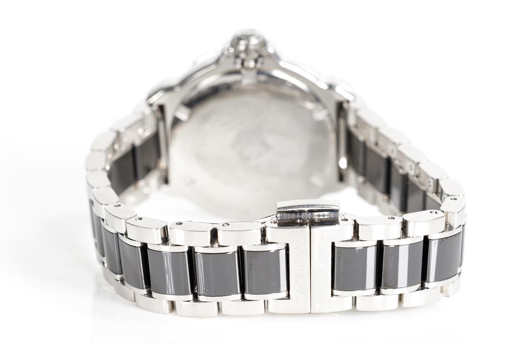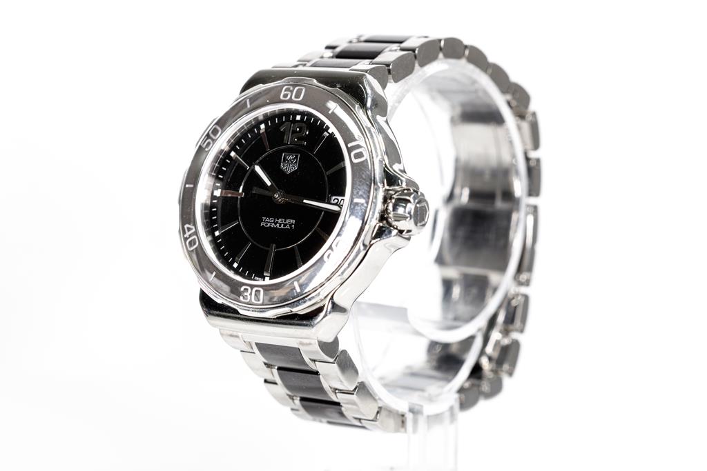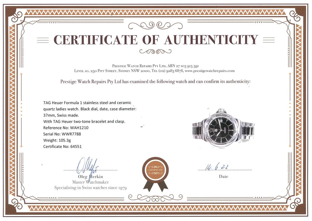 TAG Heuer Formula 1 stainless steel and ceramic quartz ladies watch. Black dial, date, case diameter: 37mm, wrist size: 16cm, Swiss made. Ref# WAH1210. With TAG Heuer two-tone bracelet and clasp. With Certificate of Authenticity. 3 month waranty. (Pre-owned)