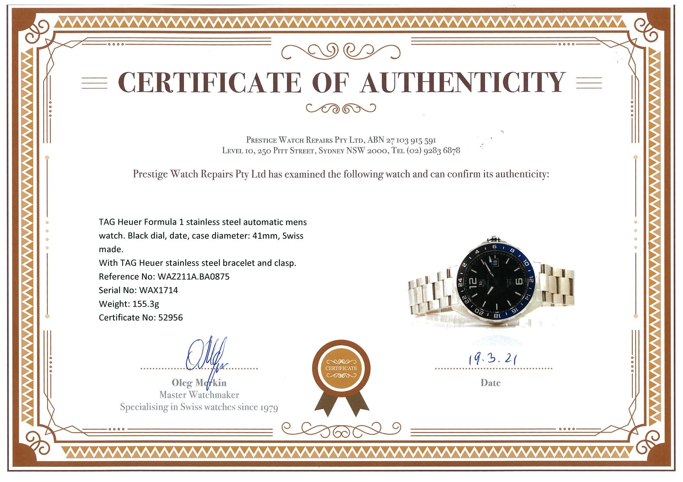 TAG Heuer Formula 1 stainless steel automatic mens watch. Black dial, date, case diameter: 41mm, wrist size: 20cm, Swiss made. Ref #WAZ211A.BA0875. With TAG Heuer stainless steel bracelet and clasp. With warranty card dated 26.09.2018 inside TAG Heuer box. With certificate of authenticity. 3 month FSA warranty. (Pre-owned)