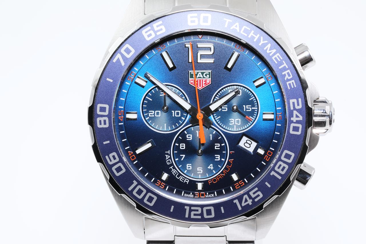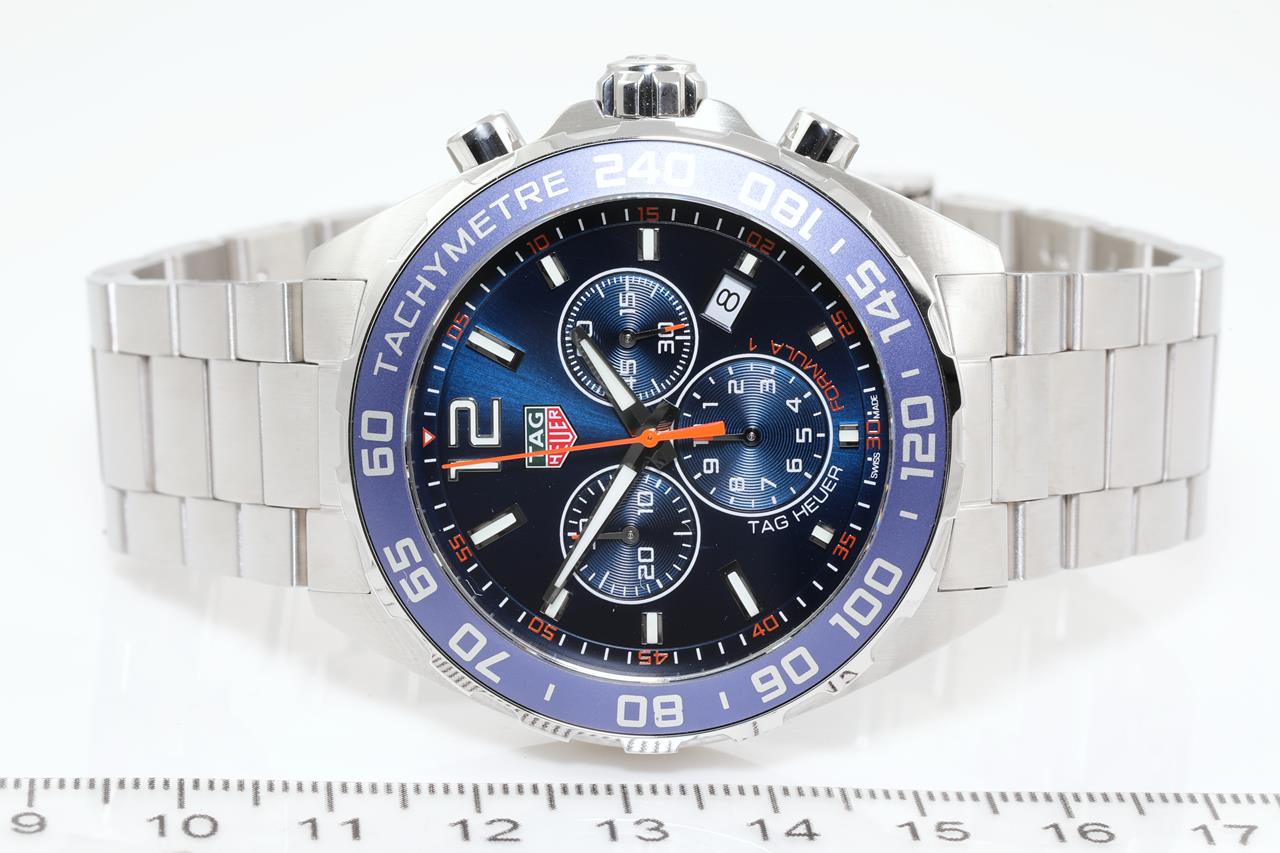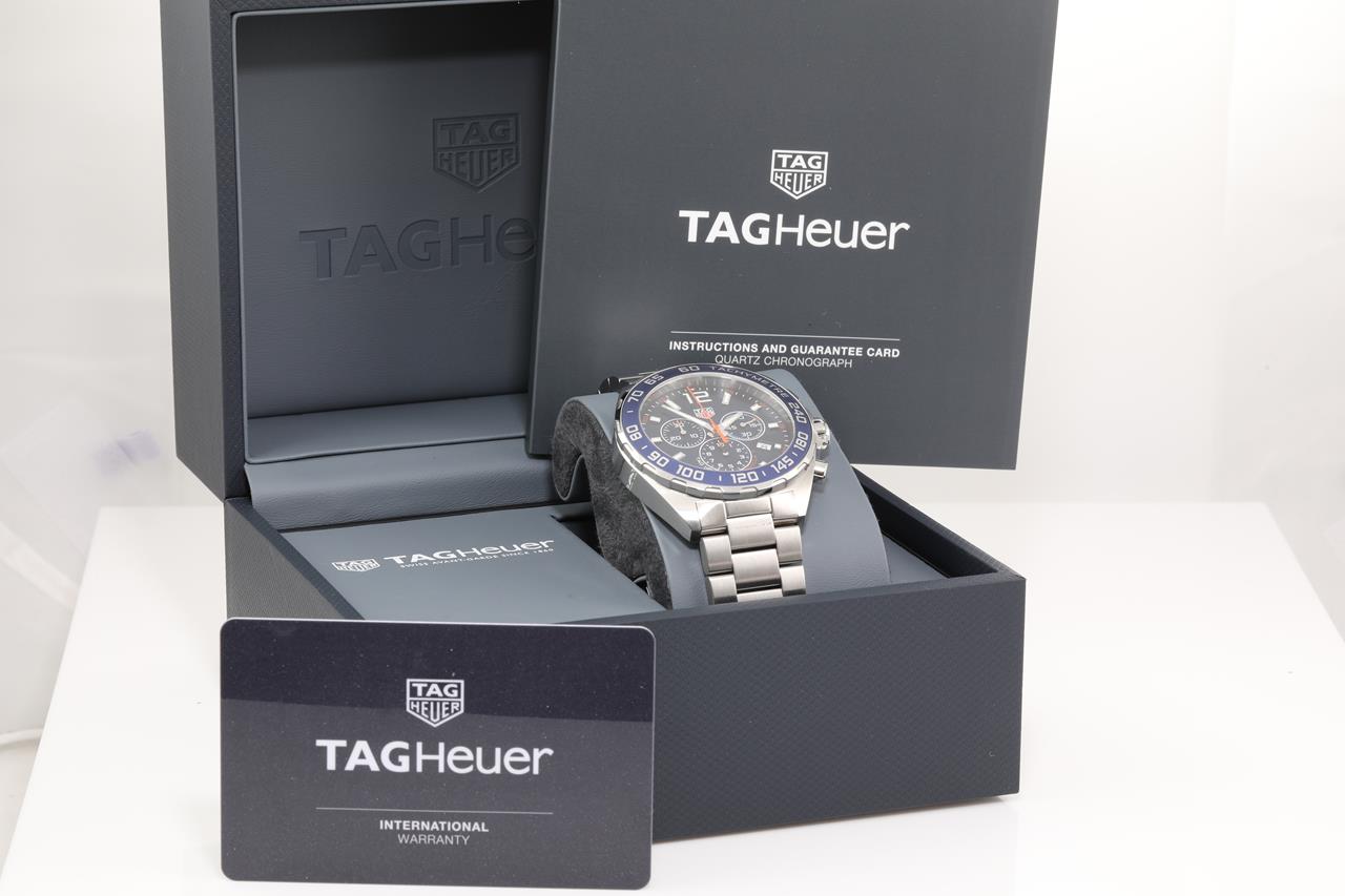 TAG Heuer Formula 1 stainless steel quartz mens watch. Blue Chronograph dial, date, case diameter: 43mm, wrist size: 20cm, Swiss made. Ref# CAZ1014.BA0842. With TAG Heuer stainless steel bracelet and clasp. With TAG Heuer international warranty card, certificate of authenticity and TAG Heuer box. With certificate of authenticity. 3 month FSA warranty. (Pre-owned)