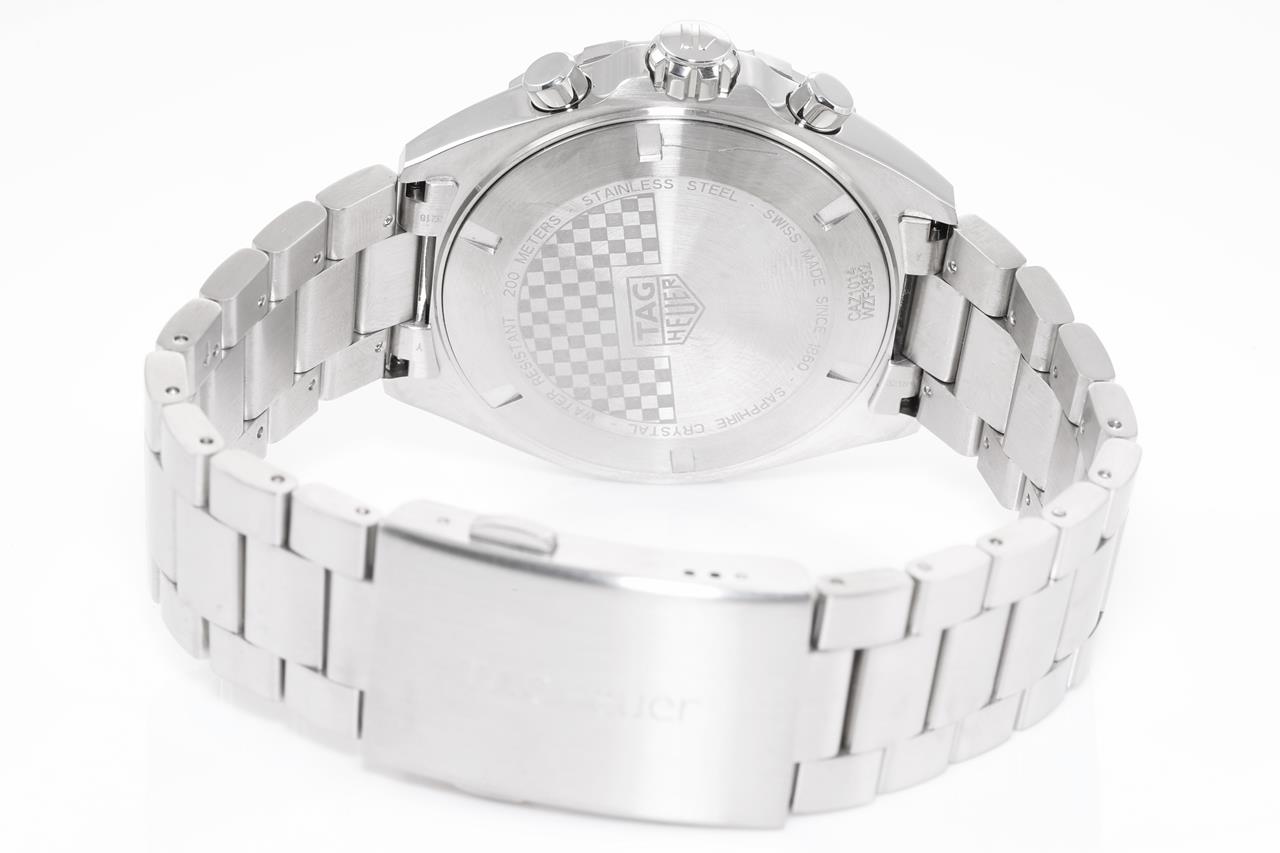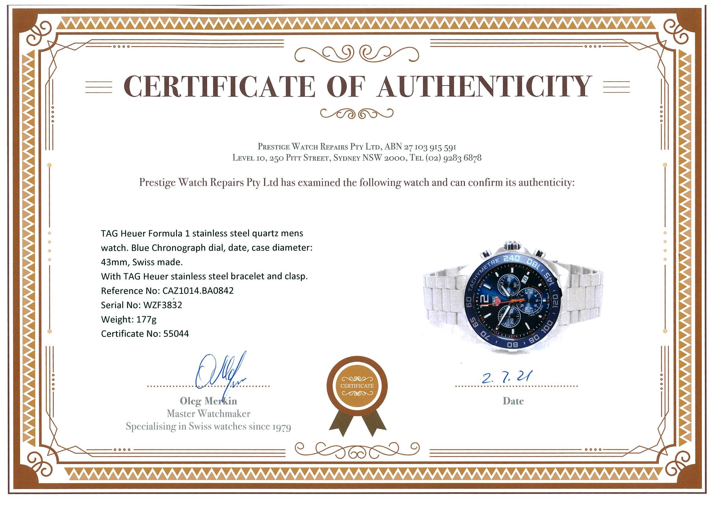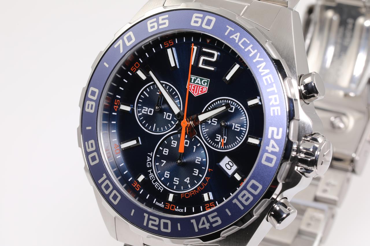 TAG Heuer Formula 1 stainless steel quartz mens watch. Blue Chronograph dial, date, case diameter: 43mm, wrist size: 20cm, Swiss made. Ref# CAZ1014.BA0842. With TAG Heuer stainless steel bracelet and clasp. With TAG Heuer international warranty card, certificate of authenticity and TAG Heuer box. With certificate of authenticity. 3 month FSA warranty. (Pre-owned)
