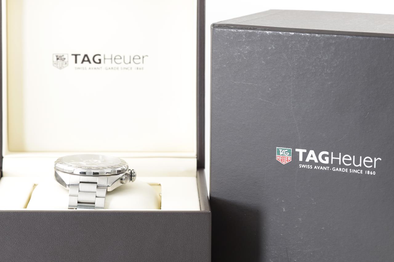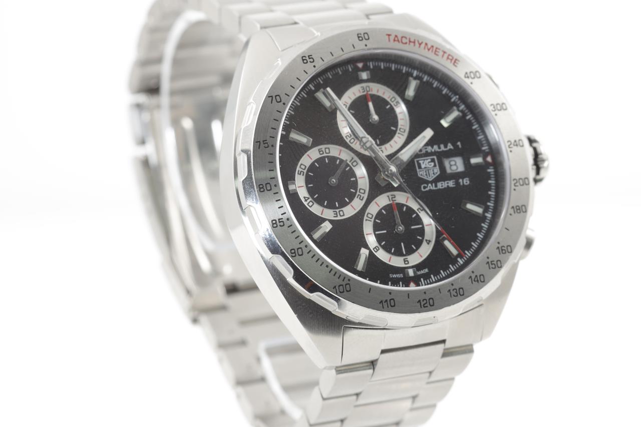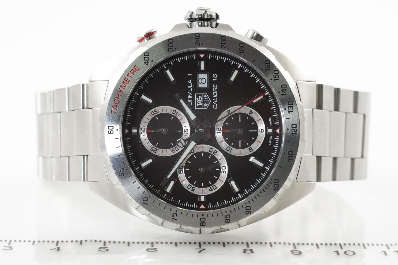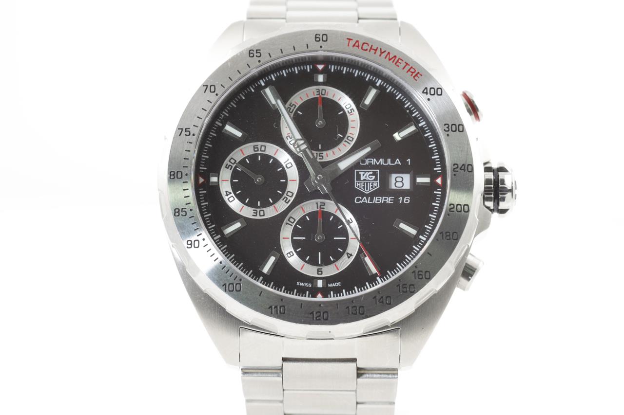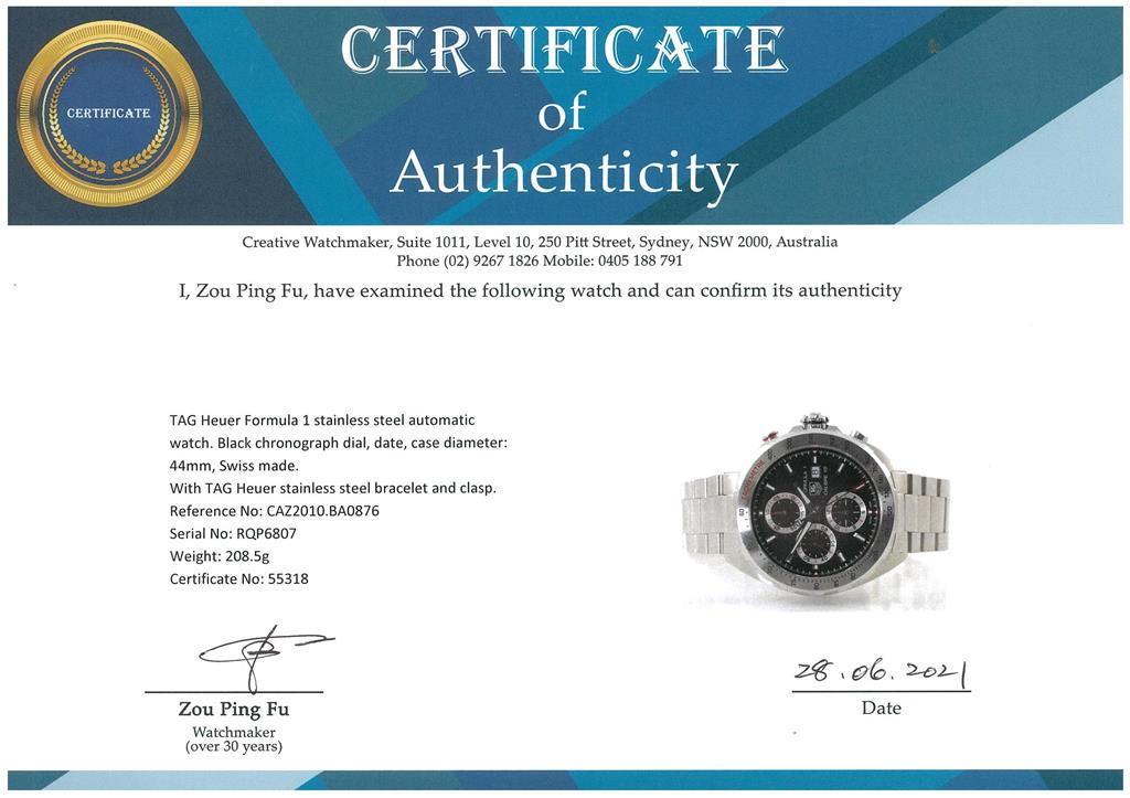 TAG Heuer Formula 1 stainless steel automatic watch. Black chronograph dial, date, case diameter: 44mm, wrist size: 20cm, Swiss made. Ref #CAZ2010.BA0876. With TAG Heuer stainless steel bracelet and clasp. With certificate of authenticity, TAG Heuer international guarantee card (not stamped) and TAH Heuer box. 3 month FSA warranty. (Pre-owned)