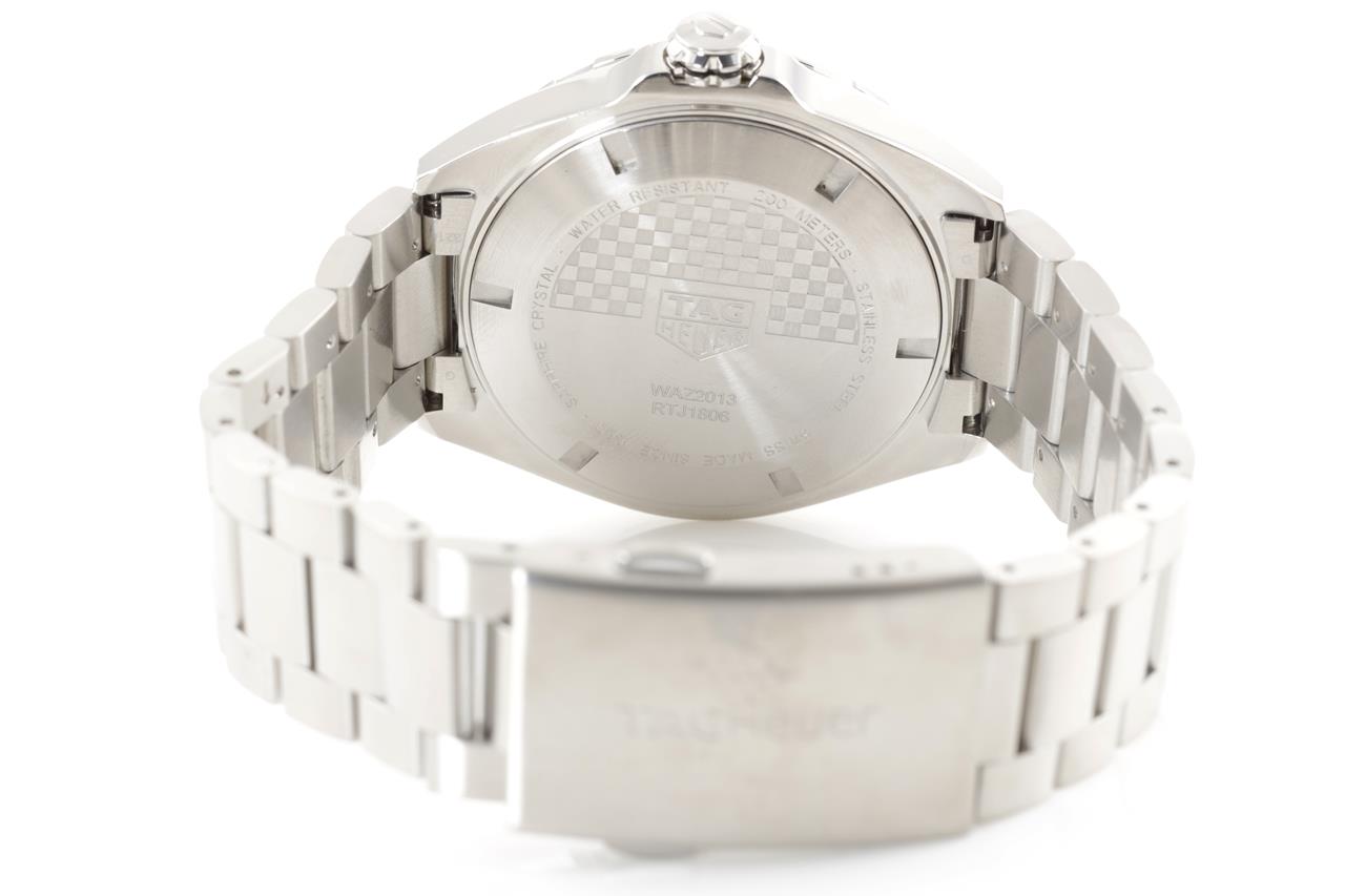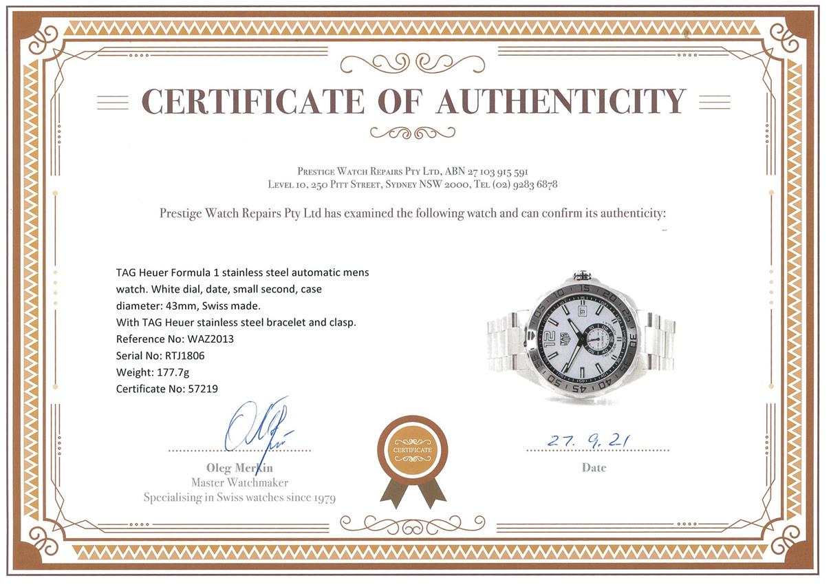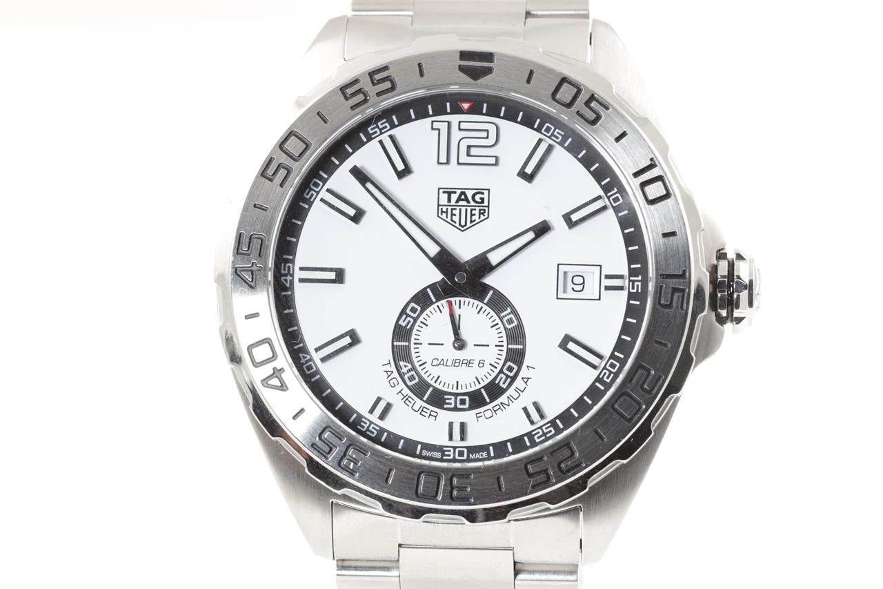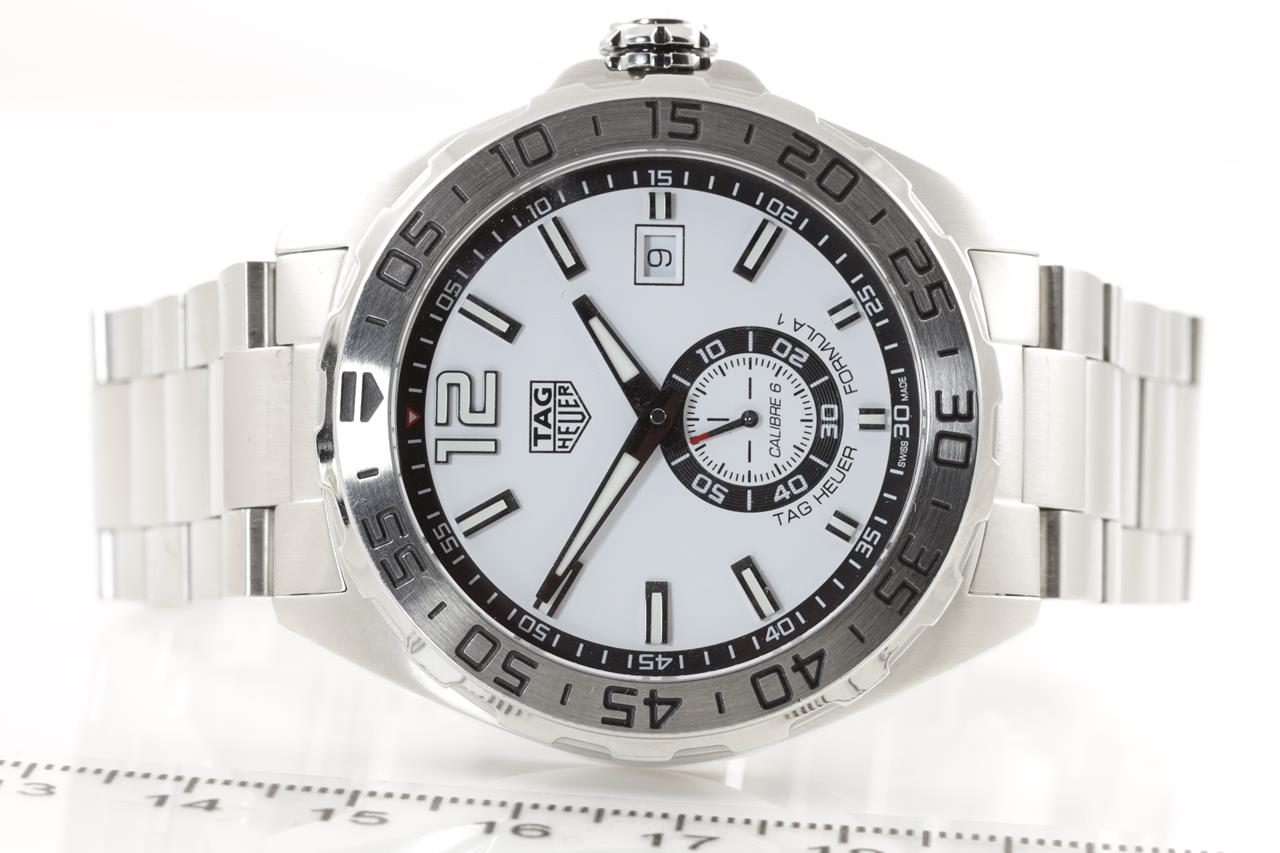 TAG Heuer Formula 1 stainless steel automatic mens watch. White dial, date, small second, case diameter: 43mm, wrist size: 20cm, Swiss made. Ref# WAZ2013. With TAG Heuer stainless steel bracelet and clasp. With certificate of authenticity and TAG Heuer box. 3 month FSA warranty. (Pre-owned)