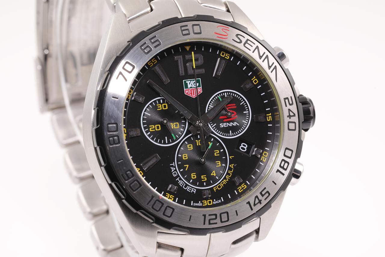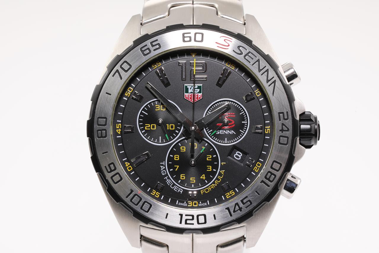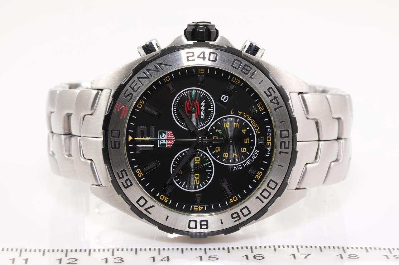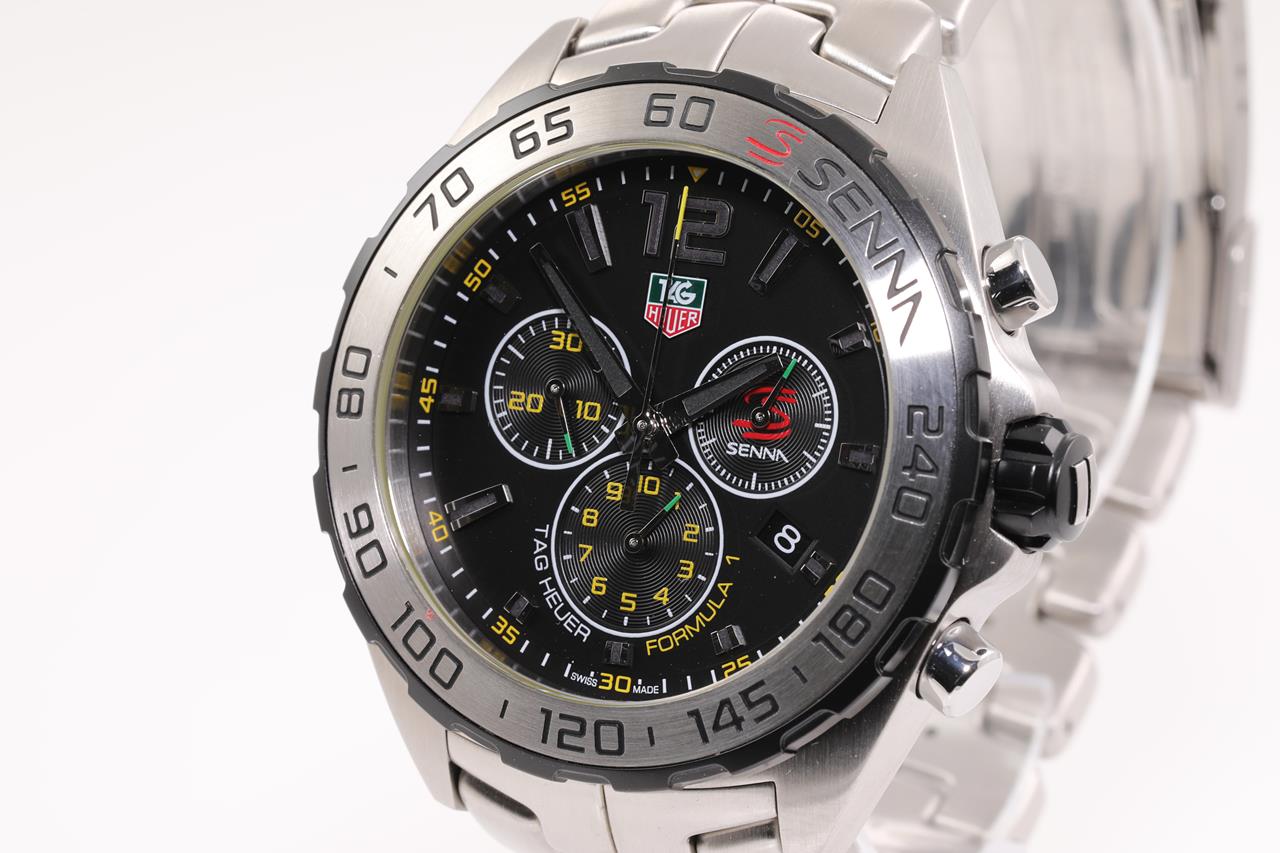 TAG Heuer Formula 1 Senna Edition stainless steel quartz mens watch. Black chronograph dial, date, case diameter: 43mm, wrist size: 19.5cm, Swiss made. Ref# CAZ1013. With TAG Heuer stainless steel bracelet and clasp. With certificate of authenticity and Tag Heuer Box. 3 month FSA warranty. (Pre-owned)