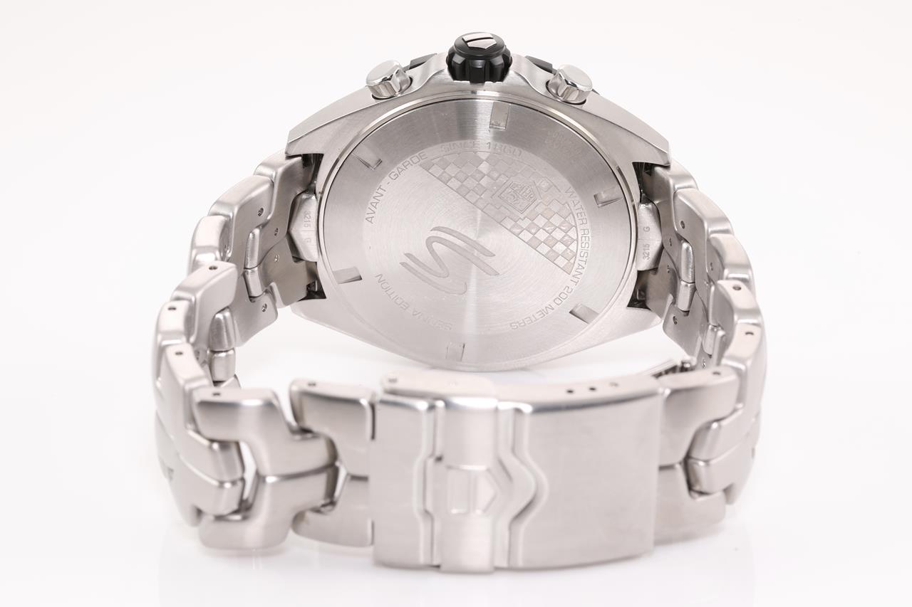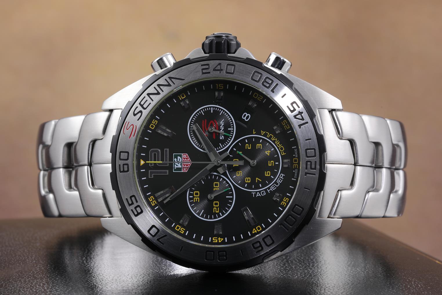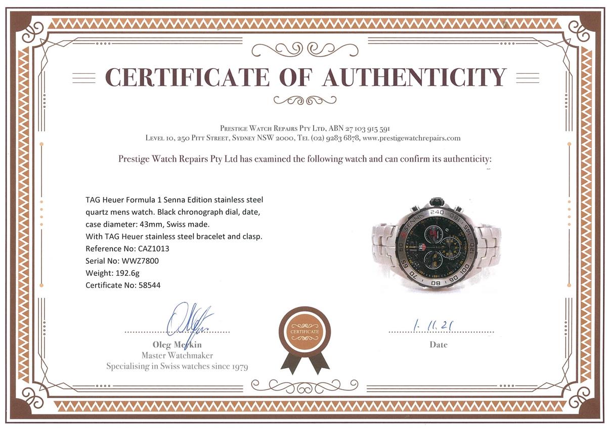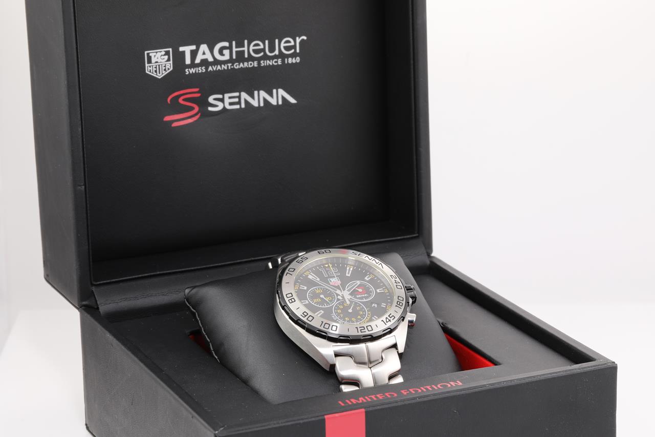 TAG Heuer Formula 1 Senna Edition stainless steel quartz mens watch. Black chronograph dial, date, case diameter: 43mm, wrist size: 19.5cm, Swiss made. Ref# CAZ1013. With TAG Heuer stainless steel bracelet and clasp. With certificate of authenticity and Tag Heuer Box. 3 month FSA warranty. (Pre-owned)