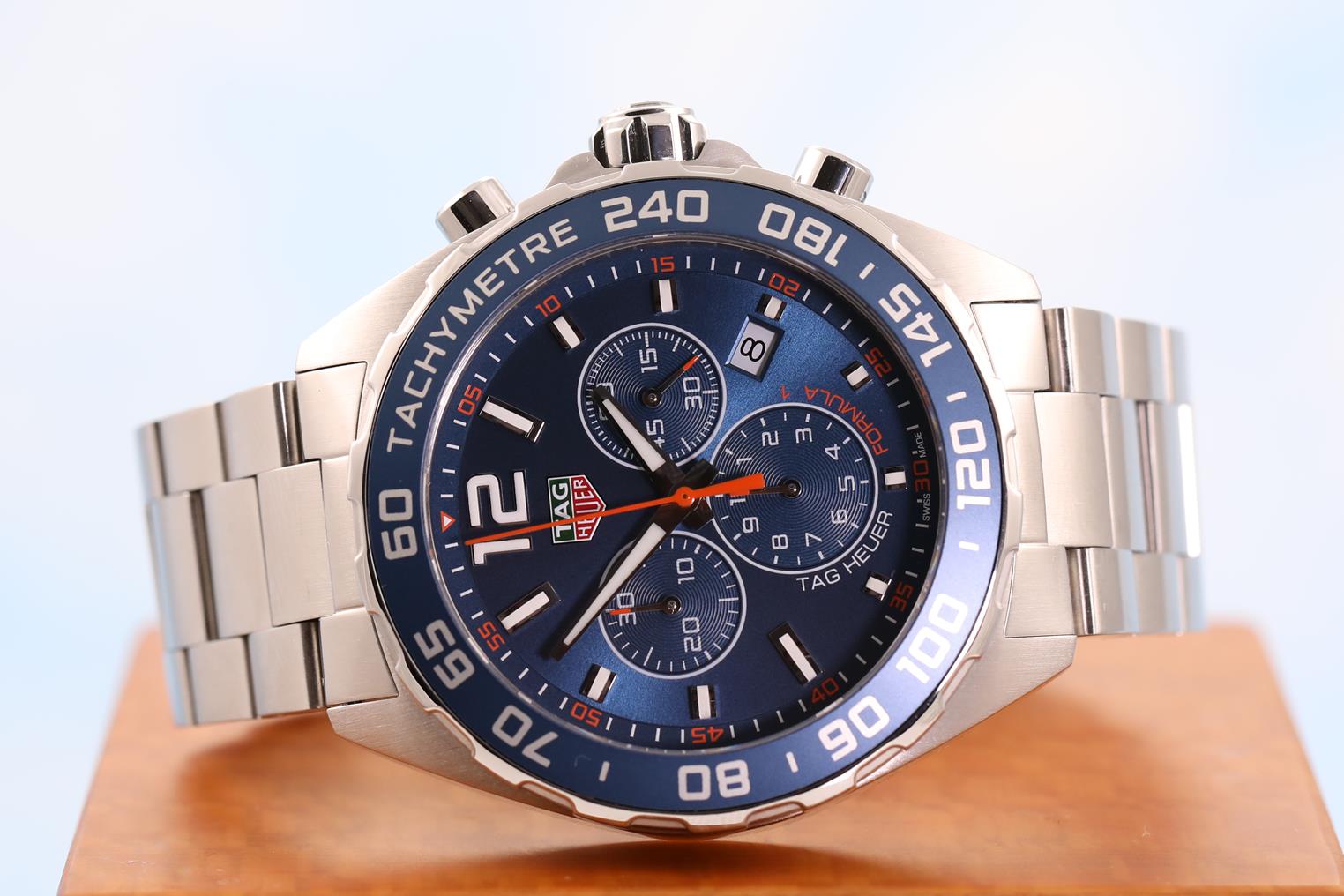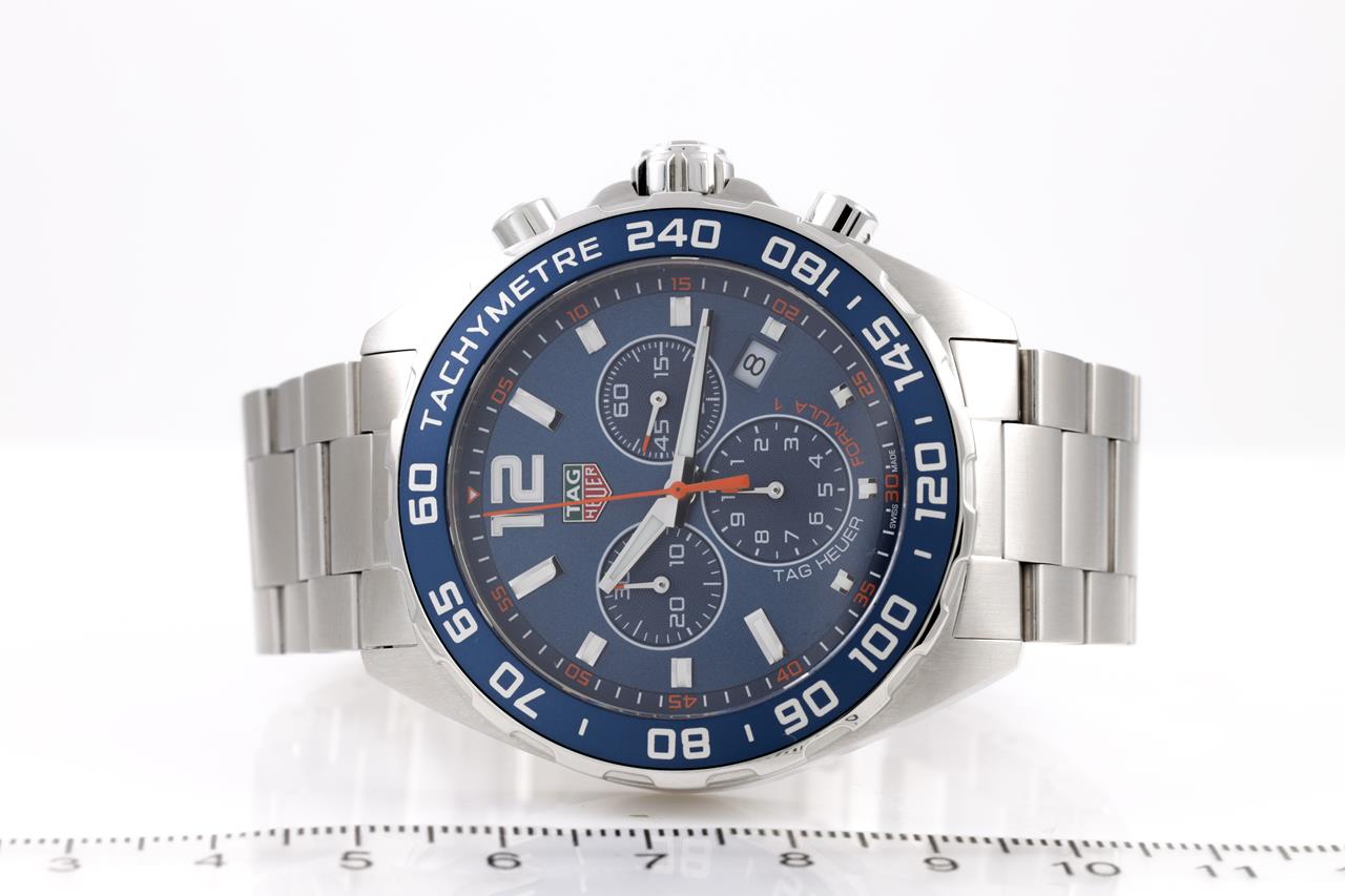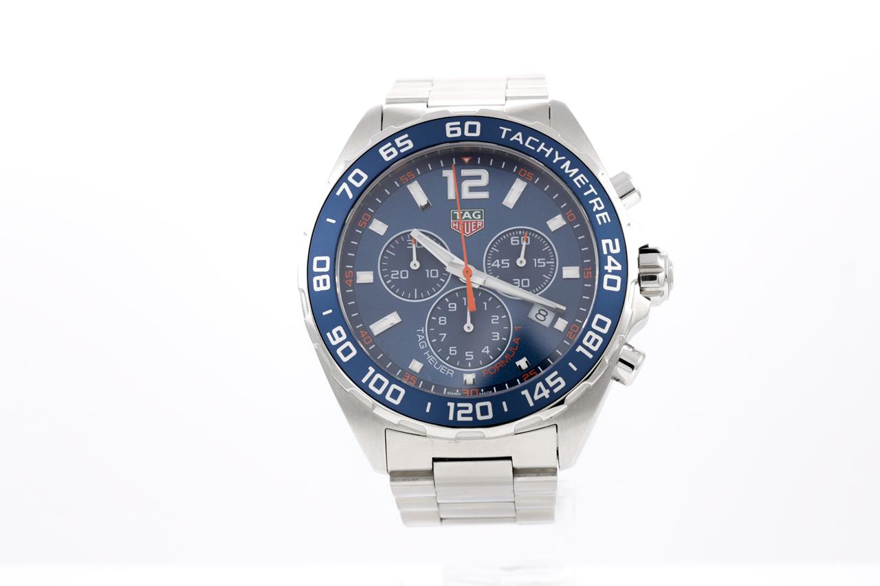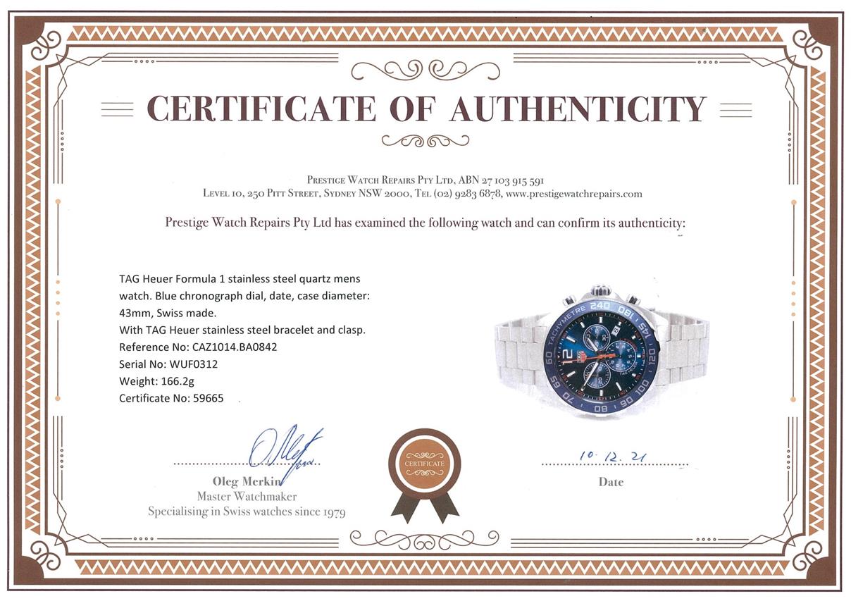 TAG Heuer Formula 1 stainless steel quartz mens watch. Blue chronograph dial, date, case diameter: 43mm, wrist size: 17.5cm, Swiss made. Ref# CAZ1014.BA0842. With TAG Heuer stainless steel bracelet and clasp. With certificate of authenticity, TAG Heuer International Warranty Card dated 28/05/2019 and TAG Heuer Box. 3 month FSA warranty. (Pre-owned)