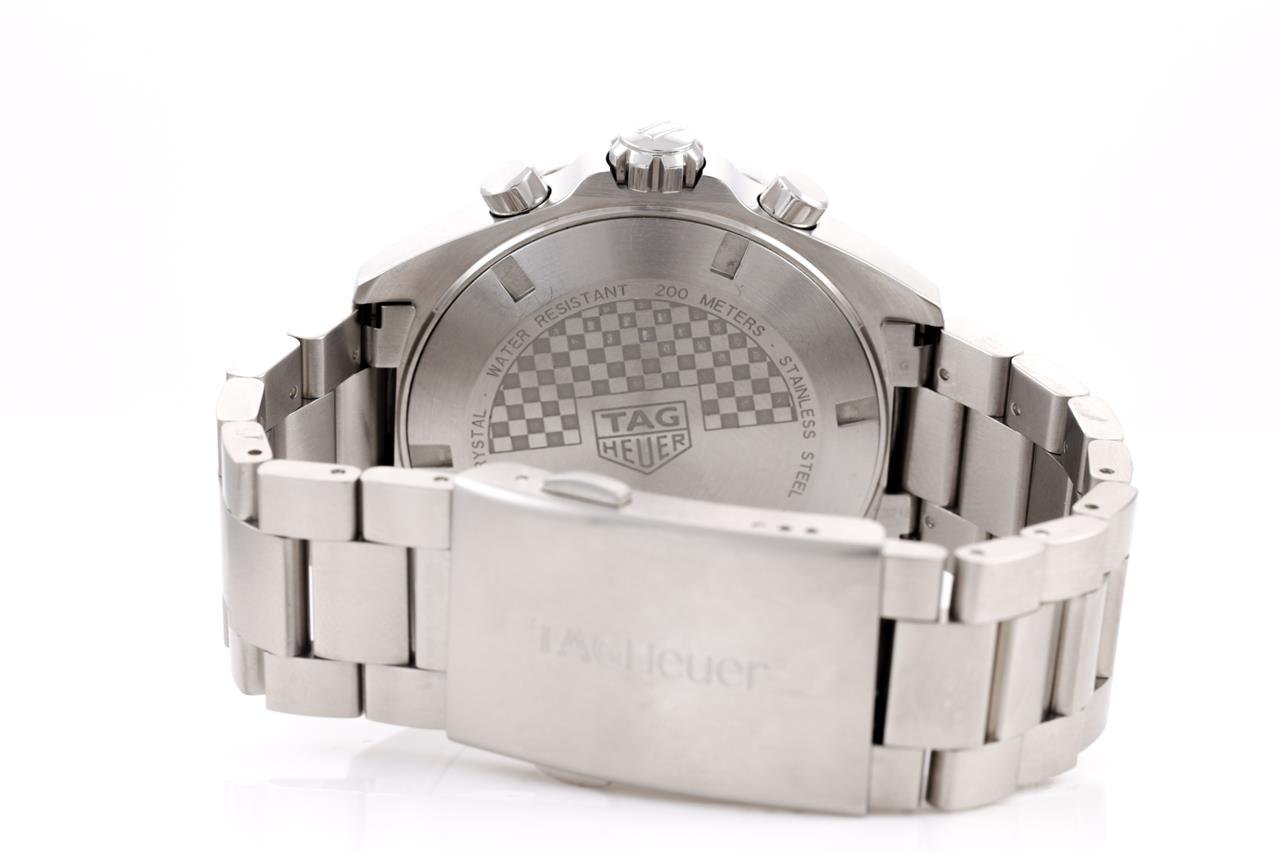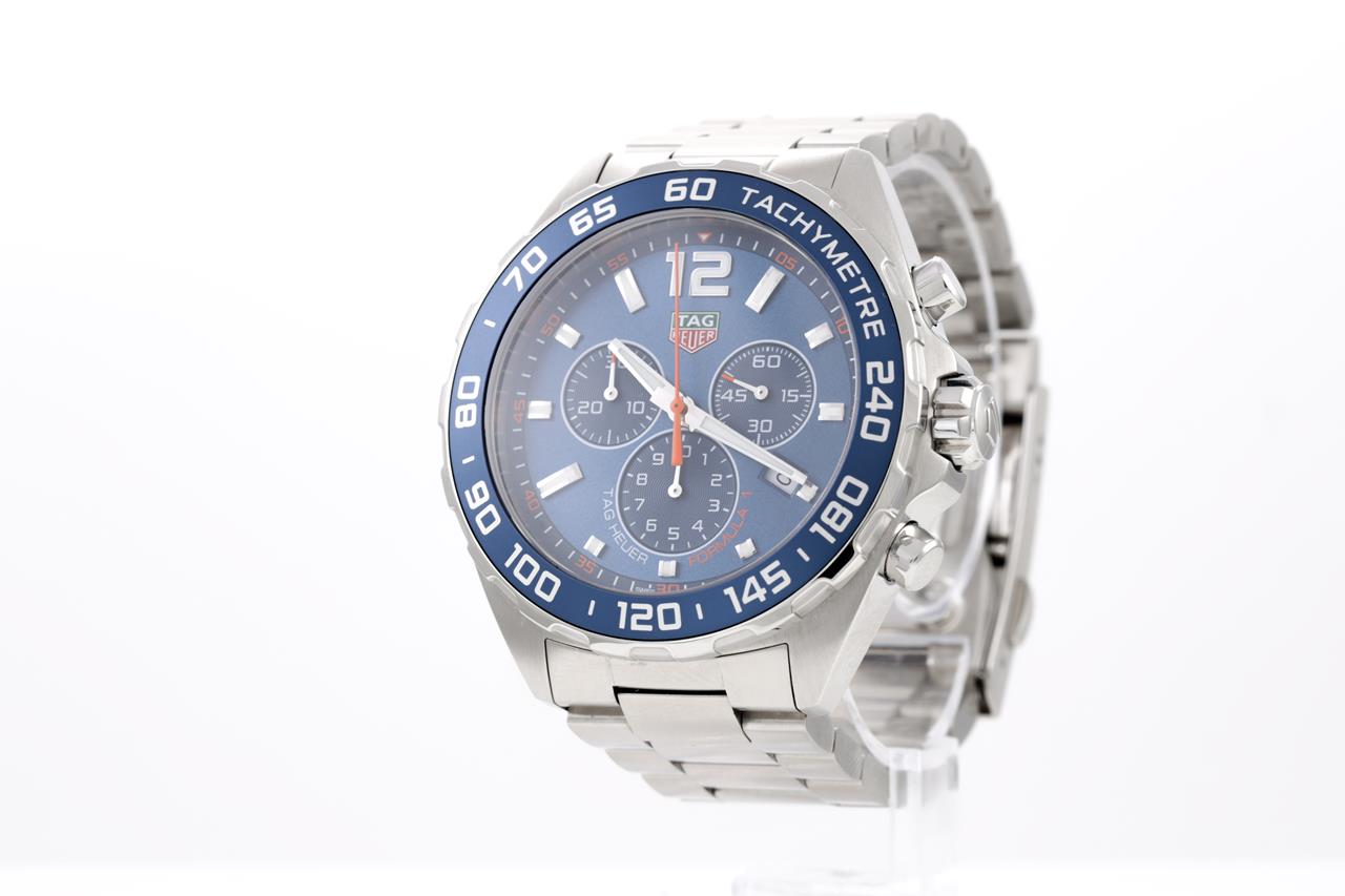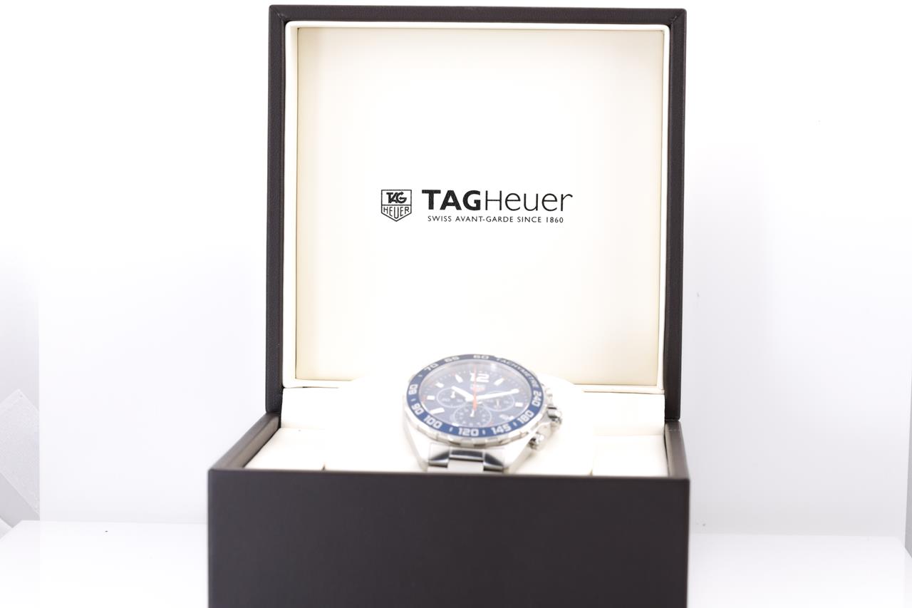 TAG Heuer Formula 1 stainless steel quartz mens watch. Blue chronograph dial, date, case diameter: 43mm, wrist size: 17.5cm, Swiss made. Ref# CAZ1014.BA0842. With TAG Heuer stainless steel bracelet and clasp. With certificate of authenticity, TAG Heuer International Warranty Card dated 28/05/2019 and TAG Heuer Box. 3 month FSA warranty. (Pre-owned)