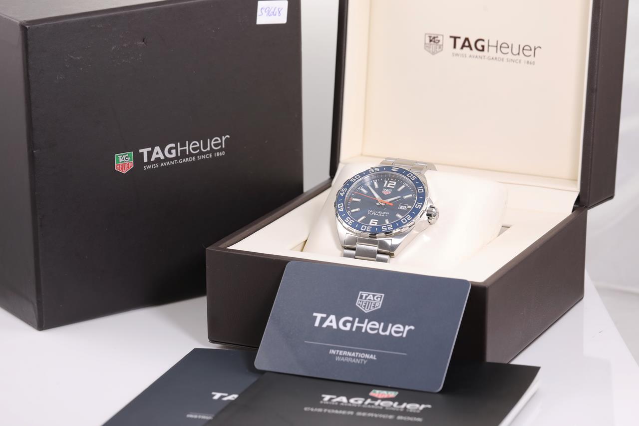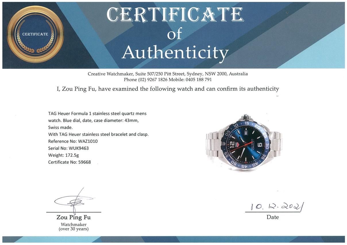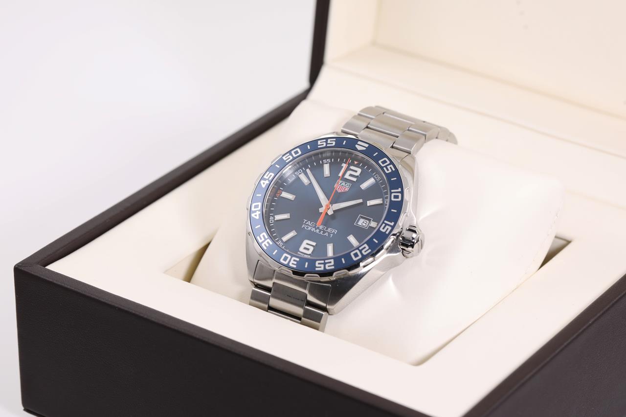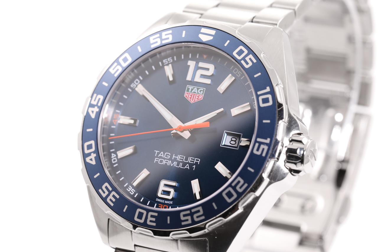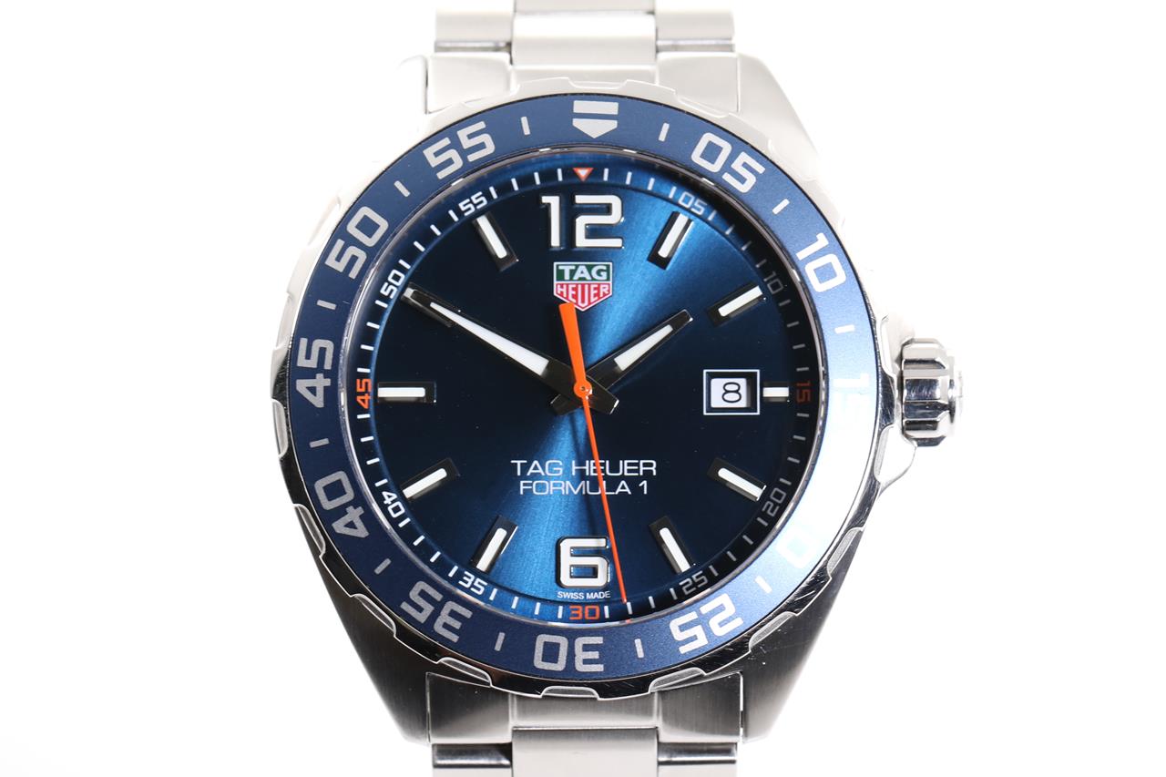 TAG Heuer Formula 1 stainless steel quartz mens watch. Blue dial, date, case diameter: 43mm, wrist size: TBAcm, Swiss made. Ref# WAZ1010. With TAG Heuer stainless steel bracelet and clasp. With Certificate of Authenticity, TAG Heuer International Warranty card dated 22/04/2019 and TAG Heuer box. 3 month FSA warranty. (Pre-owned)