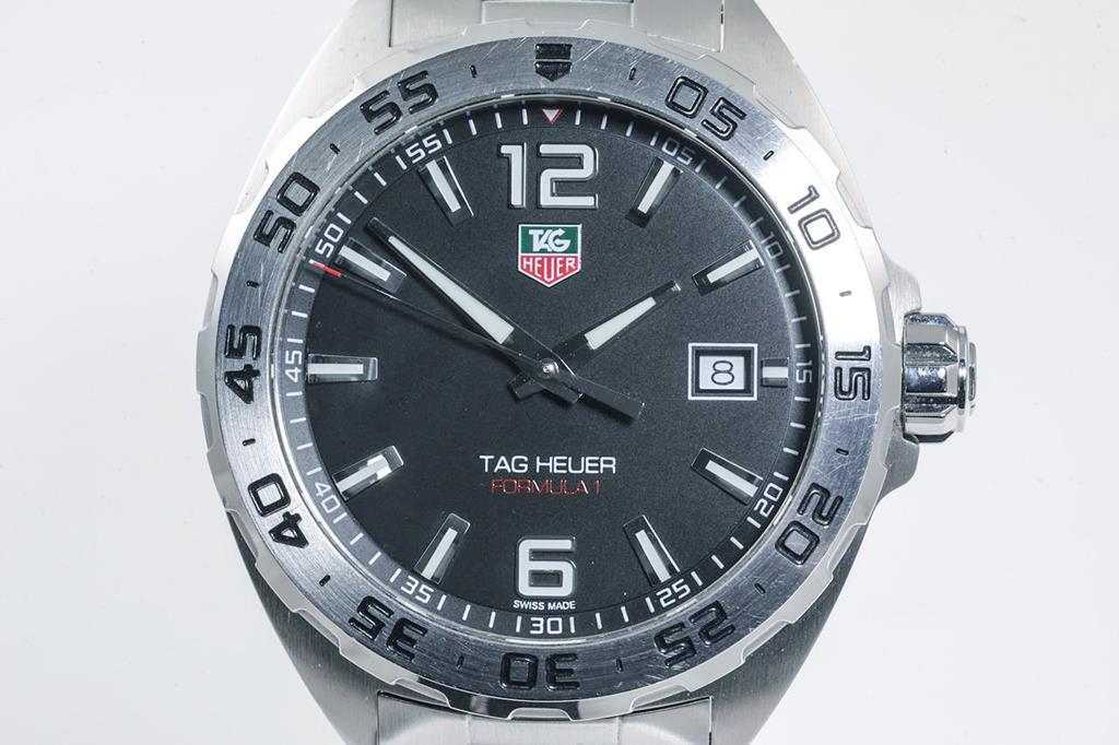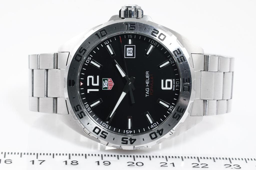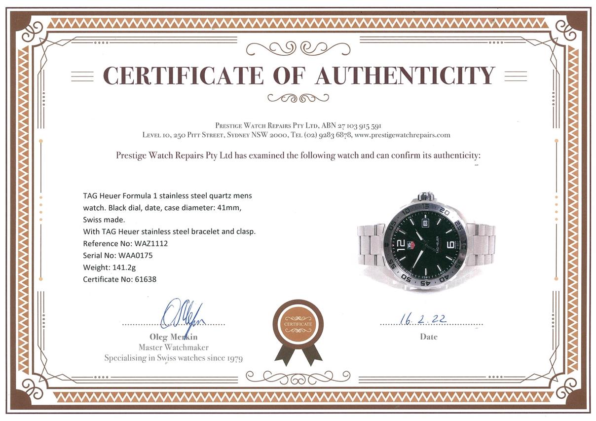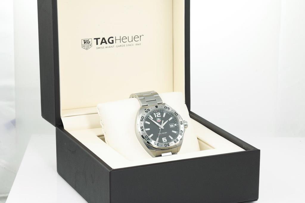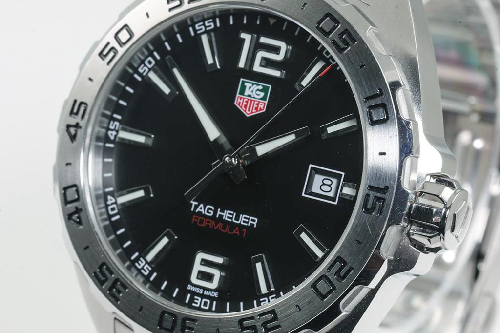 TAG Heuer Formula 1 stainless steel quartz mens watch. Black dial, date, case diameter: 41mm, wrist size: 16cm, Swiss made. Ref# WAZ1112. With TAG Heuer stainless steel bracelet and clasp. With Certificate of Authenticity and TAG Heuer box. 3 month FSA warranty. (Pre-owned)