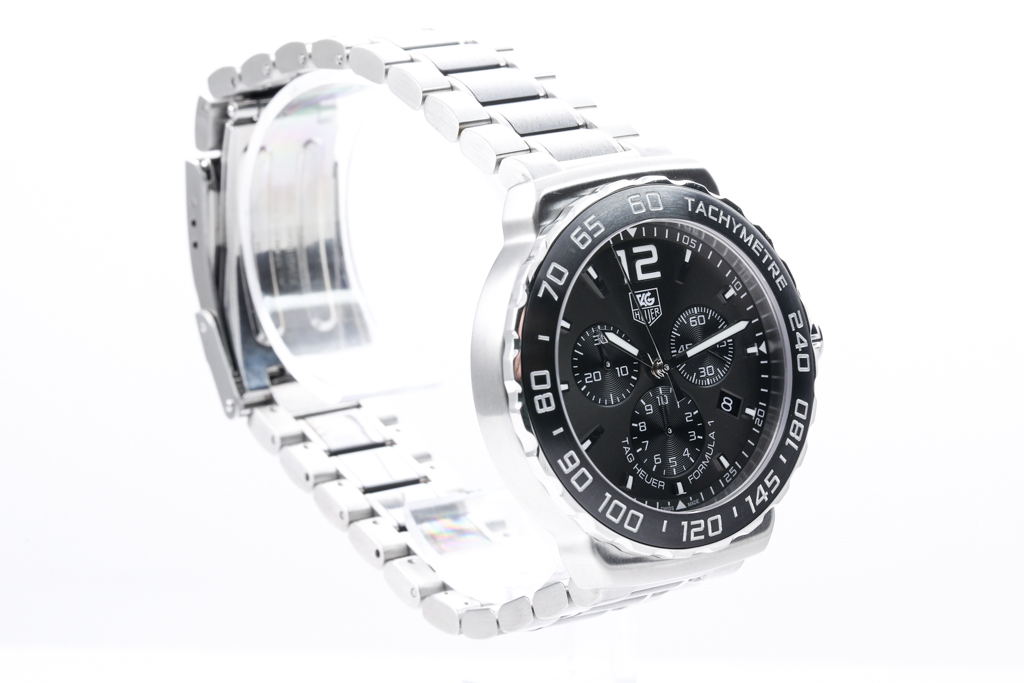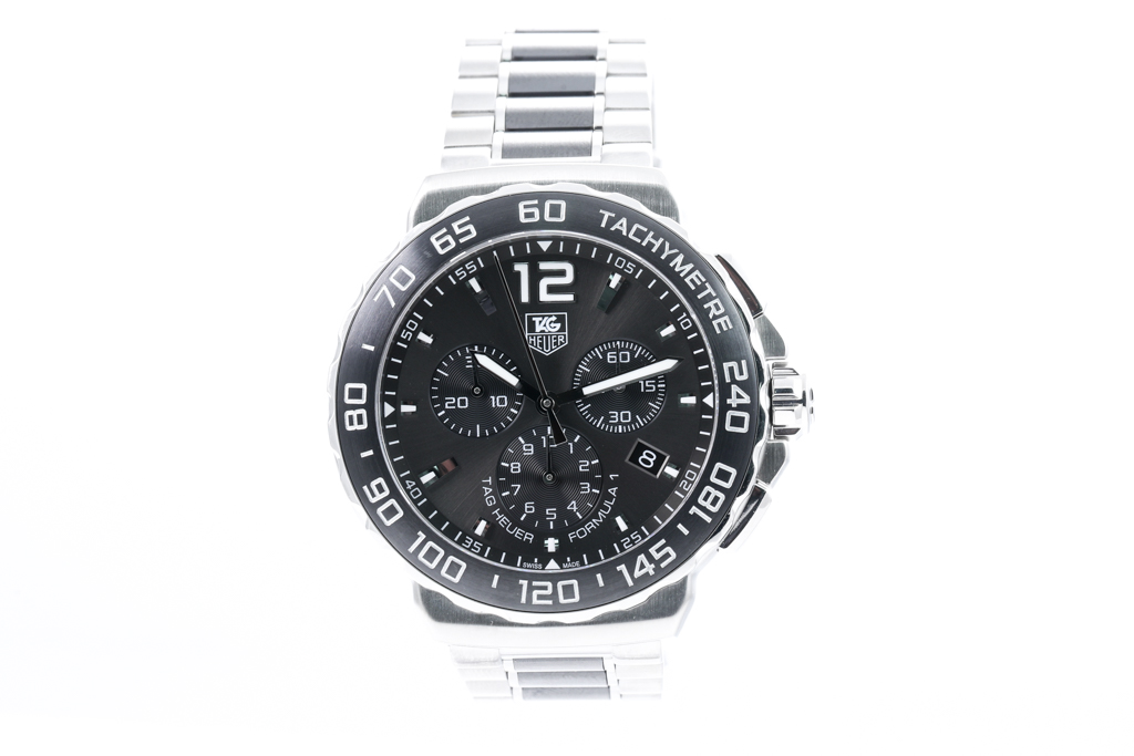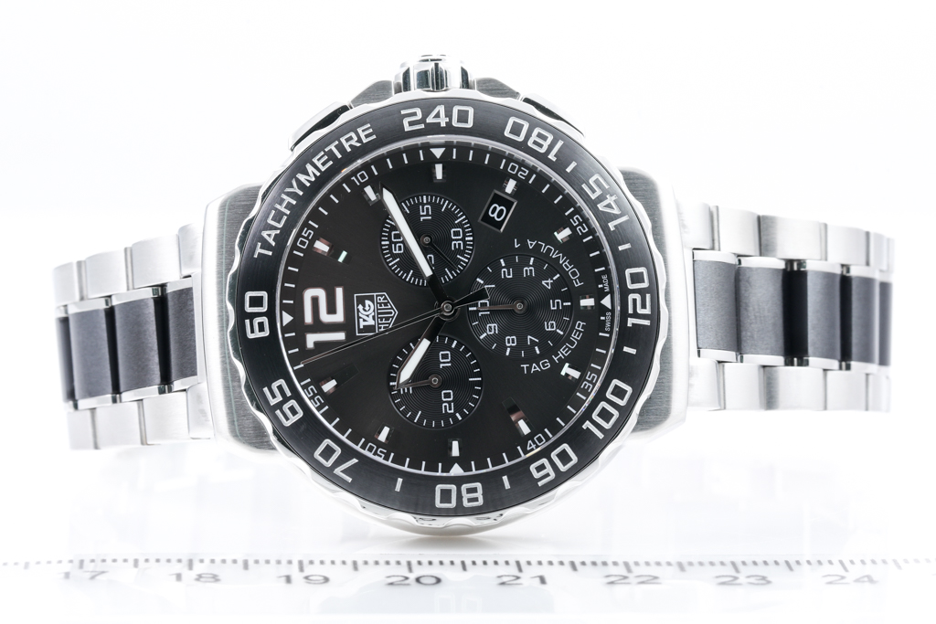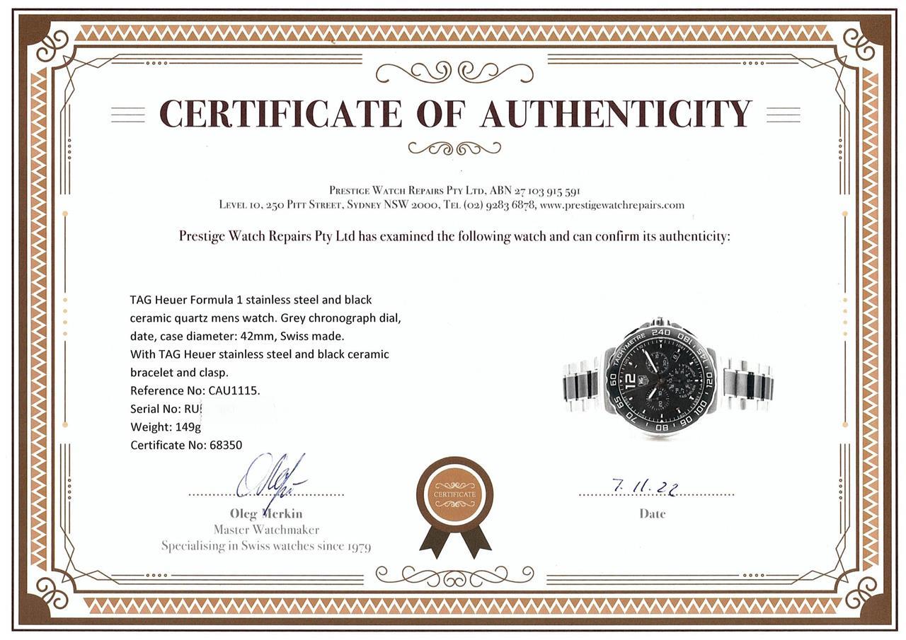 TAG Heuer Formula 1 stainless steel and black ceramic quartz mens watch. Grey chronograph dial, date, case diameter: 42mm, wrist size: 20cm Swiss made. Ref# CAU1115. With TAG Heuer stainless steel and black ceramic bracelet and clasp. With Certificate of Authenticity. 3 month FSA warranty (Pre-owned)