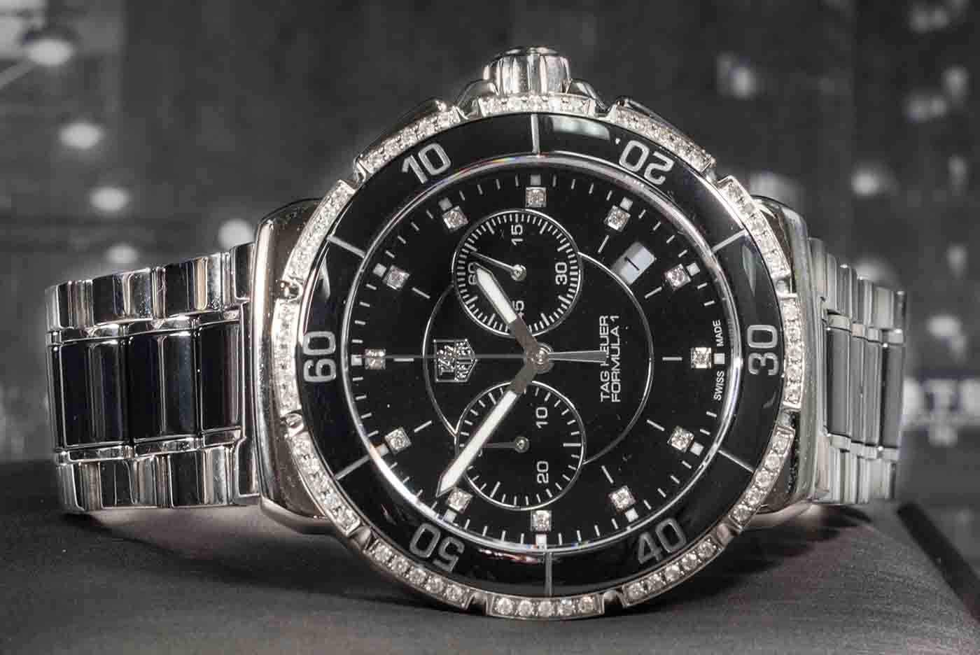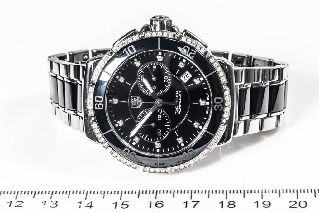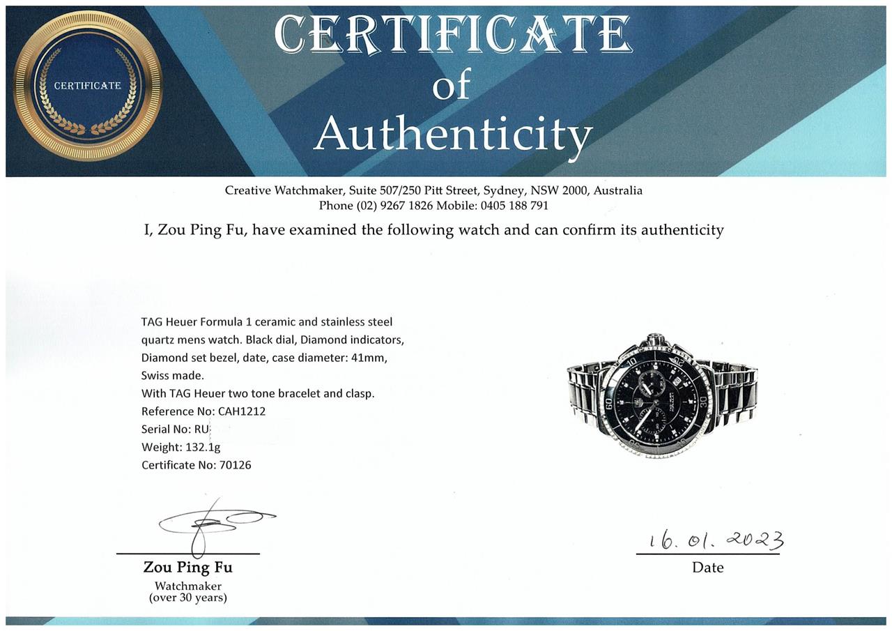 TAG Heuer Formula 1 ceramic and stainless steel quartz mens watch. Black dial, Diamond indicators, Diamond set bezel, date, case diameter: 41mm, wrist size: 16.5cm, Swiss made. Ref# CAH1212. With TAG Heuer two tone bracelet and clasp. With TAG Heuer International Guarantee card dated 09/01/2018, TAG Heuer Complete Service tax invoice dated 06/09/2022 and TAG Heuer case. Balance of TAG Heuer 2-year service warranty. (Pre-owned)