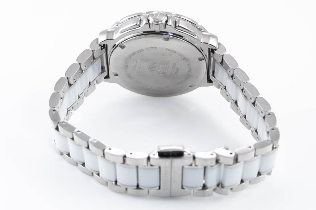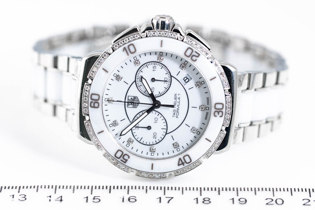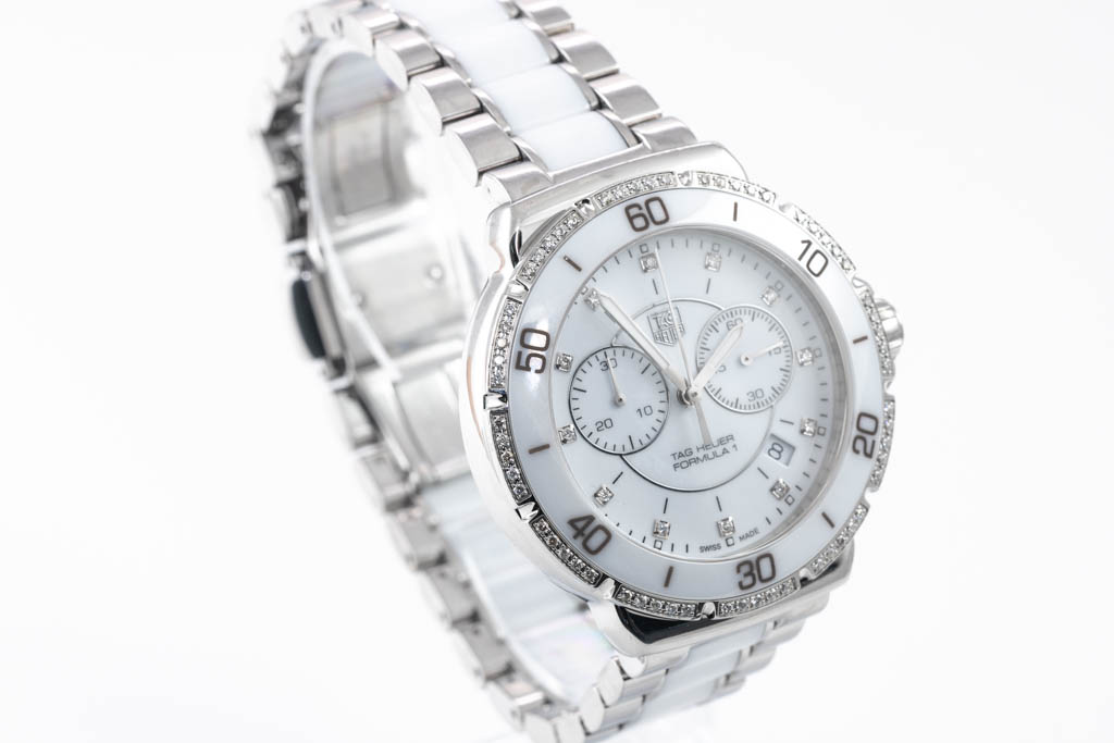 TAG Heuer Formula 1 stainless steel and ceramic quartz mens watch. White chronograph dial, Diamond set bezel and indicators, date, case diameter: 41mm, wrist size: 20cm, Swiss made. Ref# CAH1213. With TAG Heuer two tone bracelet and clasp. With Certificate of Authenticity, TAG Heuer International Guarantee card dated 24/07/20211, TAG Heuer Precious stone certificate card and TAG Heuer box. 3 month FSA warranty (Pre-owned)