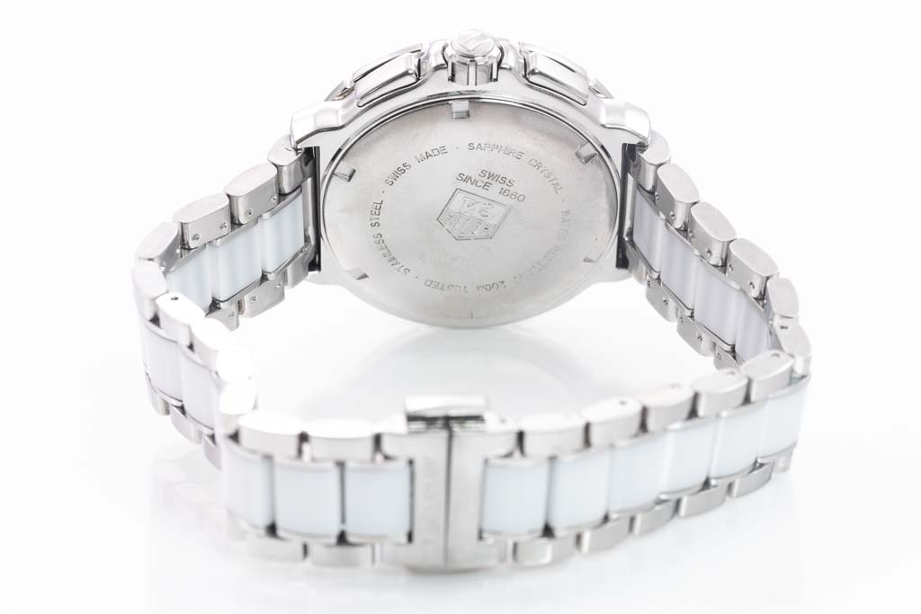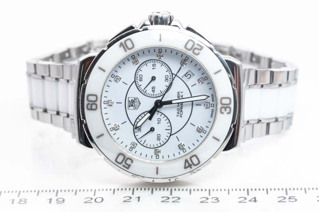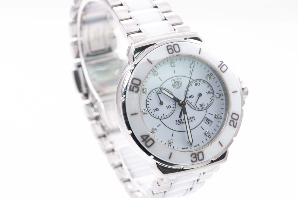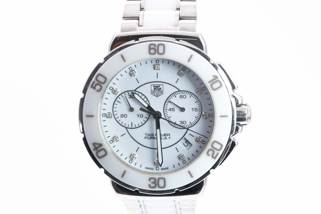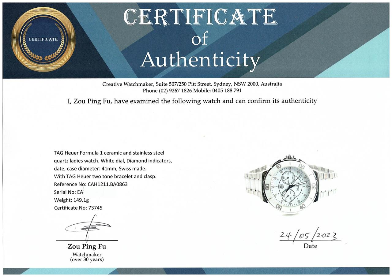 TAG Heuer Formula 1 ceramic and stainless steel quartz ladies watch. White dial, Diamond indicators, date, case diameter: 41mm, wrist size: 20cm, Swiss made. Ref# CAH1211.BA0863. With TAG Heuer two tone bracelet and clasp. With Certificate of Authenticity, TAG Heuer Limited International Guarantee card dated 07/04/2016 and TAG Heuer box. 3 month FSA warranty (Pre-owned)