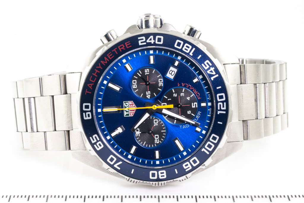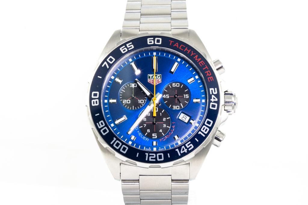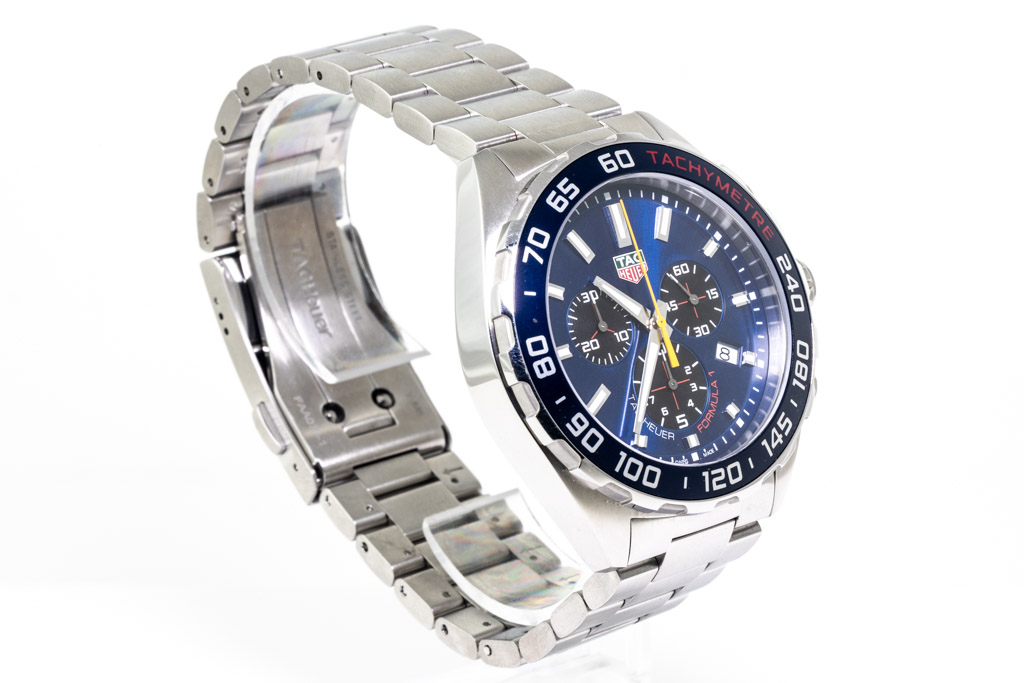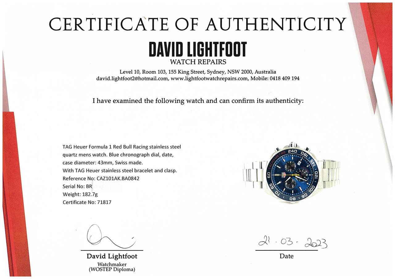 TAG Heuer Formula 1 Red Bull Racing stainless steel quartz mens watch. Blue chronograph dial, date, case diameter: 43mm, wrist size: 20.5cm, Swiss made. Ref# CAZ101AK.BA0842. With TAG Heuer stainless steel bracelet and clasp. With Certificate and Authenticity and TAG Heuer box. 3 month FSA warranty (Pre-owned)