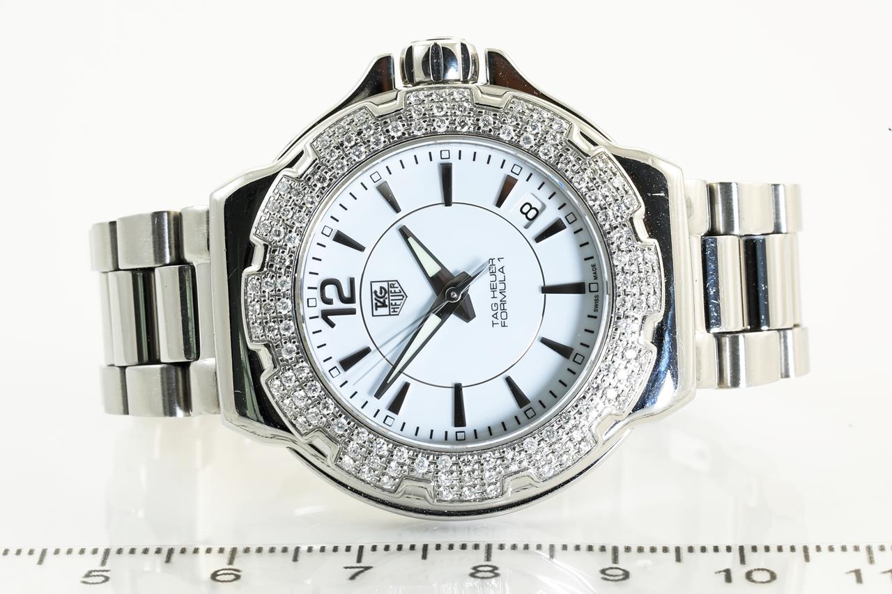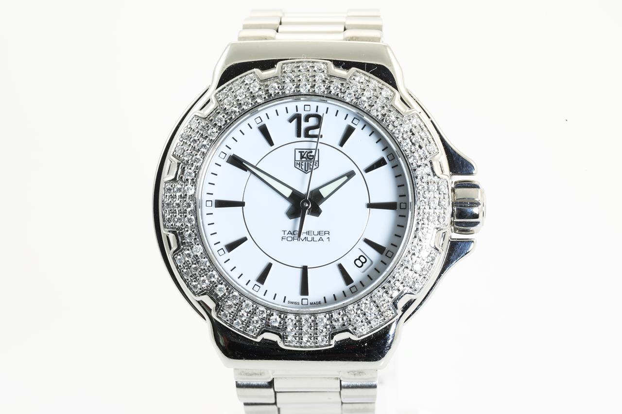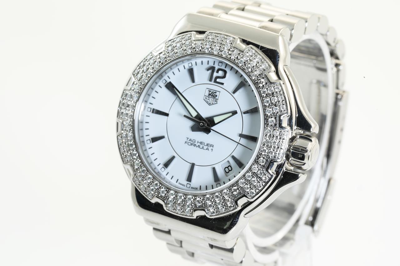 Tag Heuer Formular 1 stainless steel quartz ladies watch. White dial, date, Diamond set bezel, case size: 37cm, wrist size: 14cm, Swiss made. Ref #WAH1215-0. With Tag Heuer stainless steel bracelet. With Certificate of Authenticity and Tag Heuer box. 3 month FSA warranty. (Pre-owned).