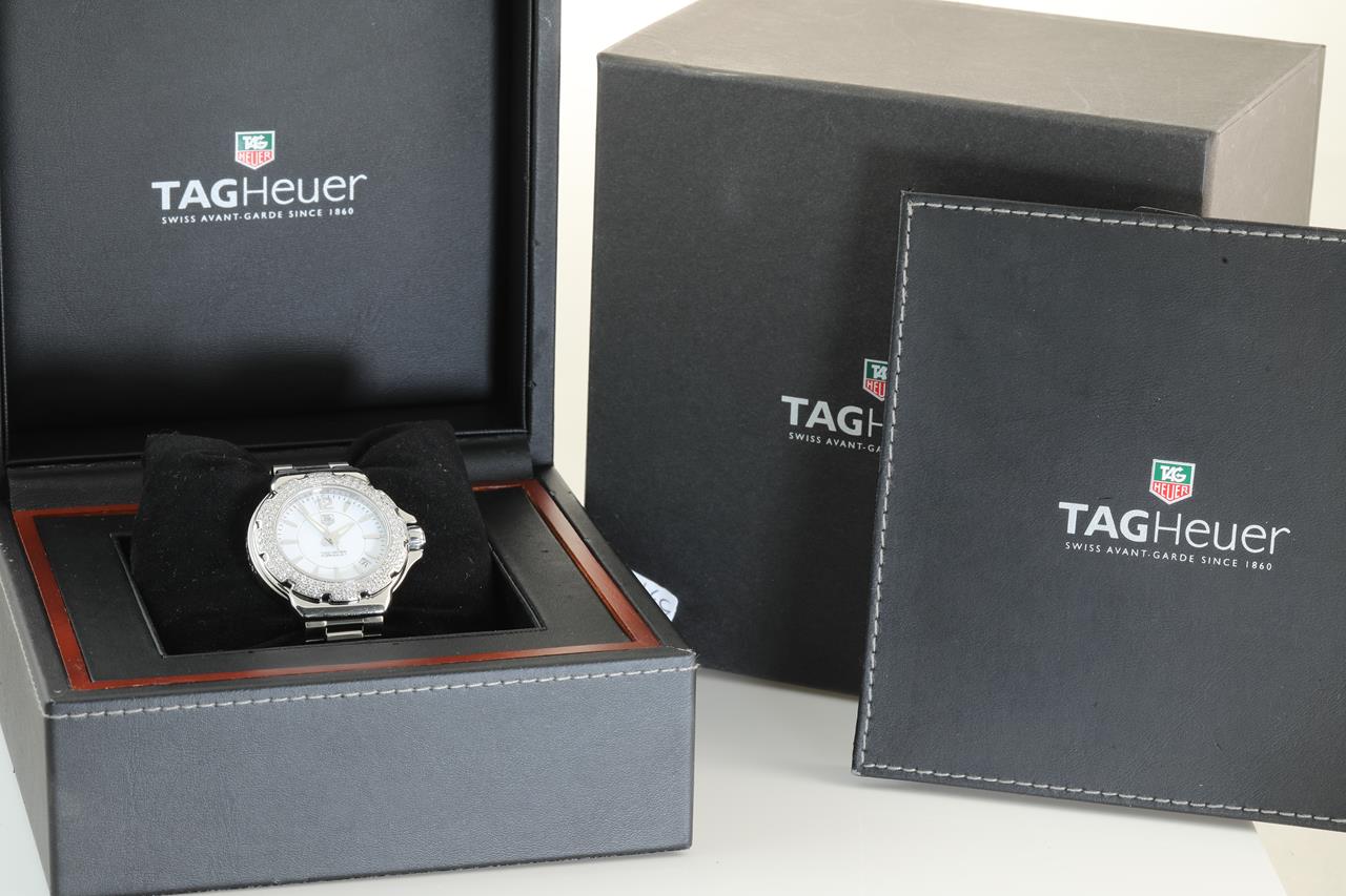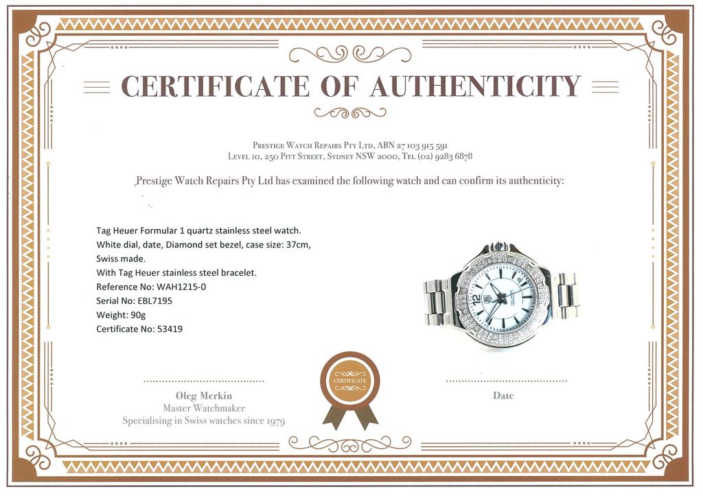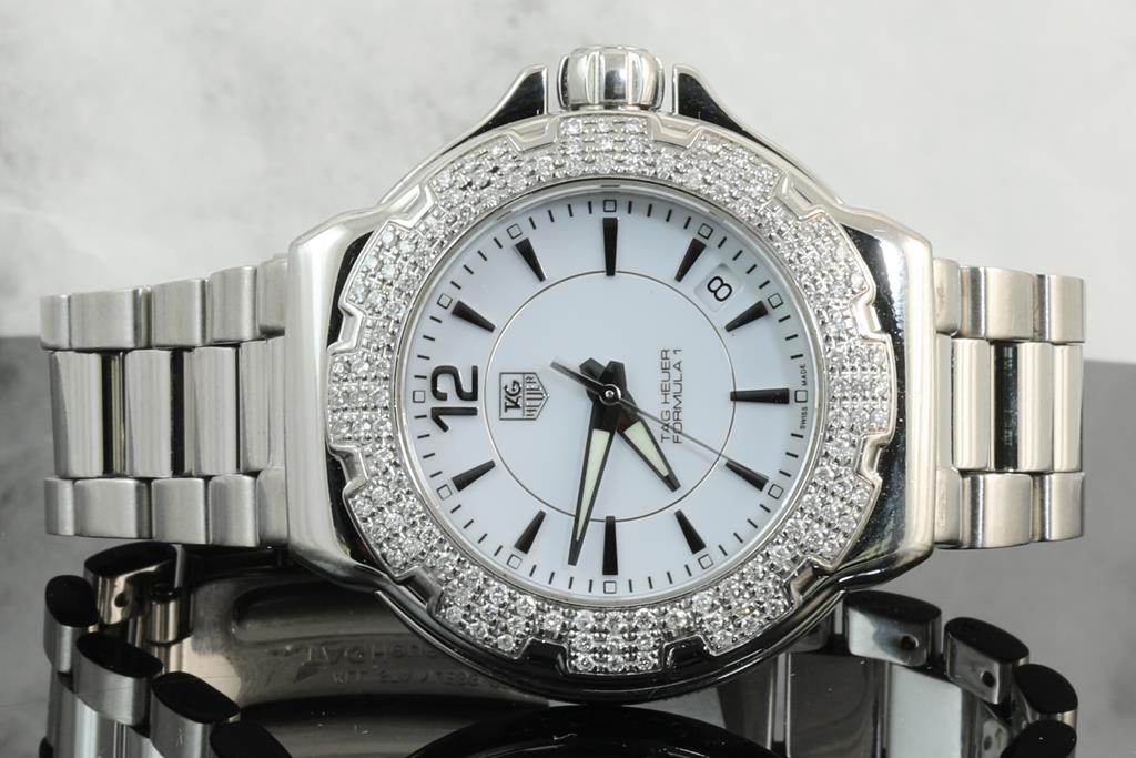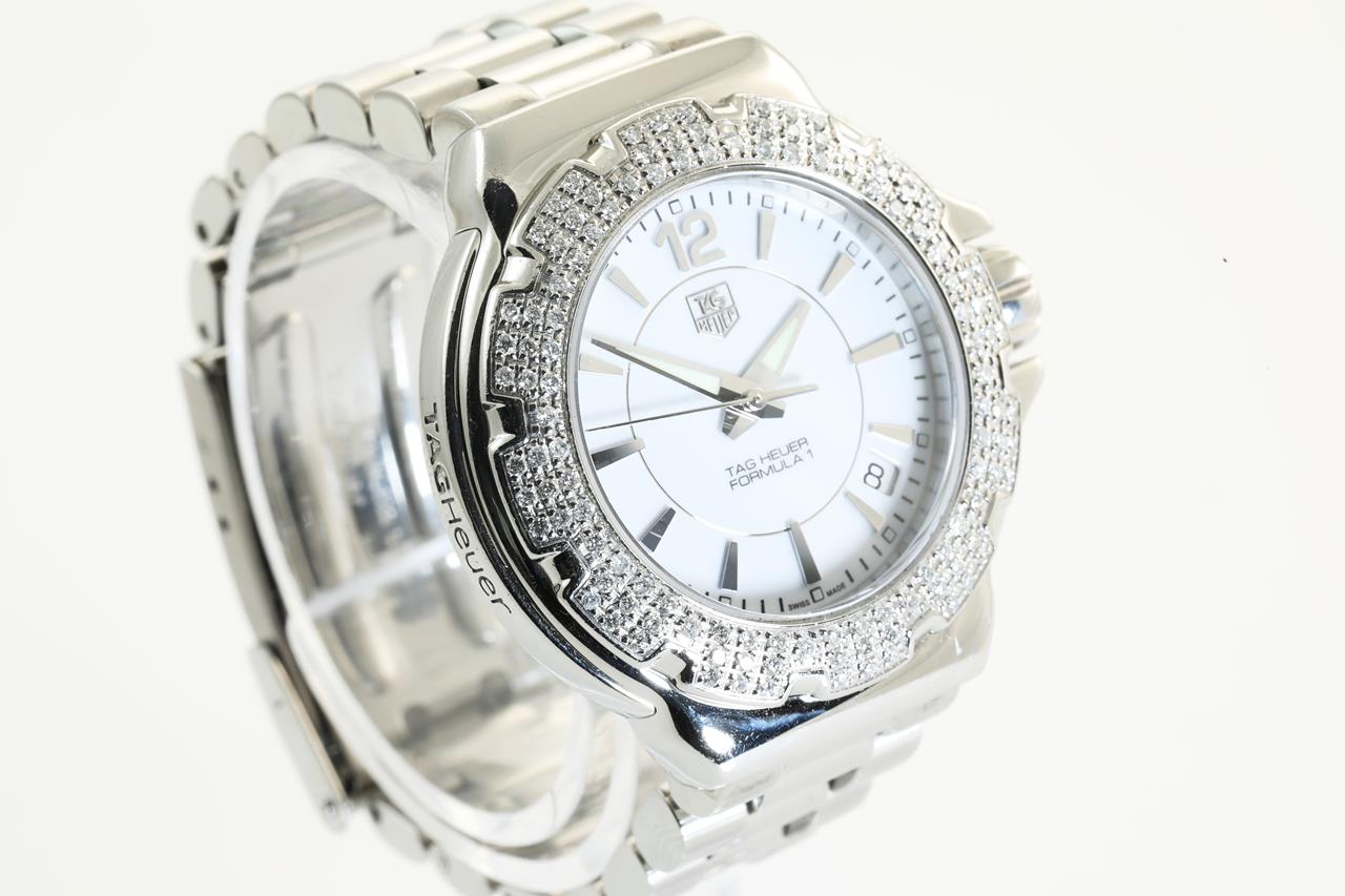 Tag Heuer Formular 1 stainless steel quartz ladies watch. White dial, date, Diamond set bezel, case size: 37cm, wrist size: 14cm, Swiss made. Ref #WAH1215-0. With Tag Heuer stainless steel bracelet. With Certificate of Authenticity and Tag Heuer box. 3 month FSA warranty. (Pre-owned).