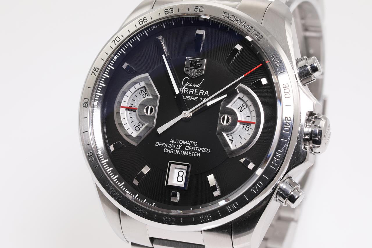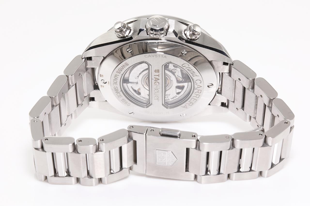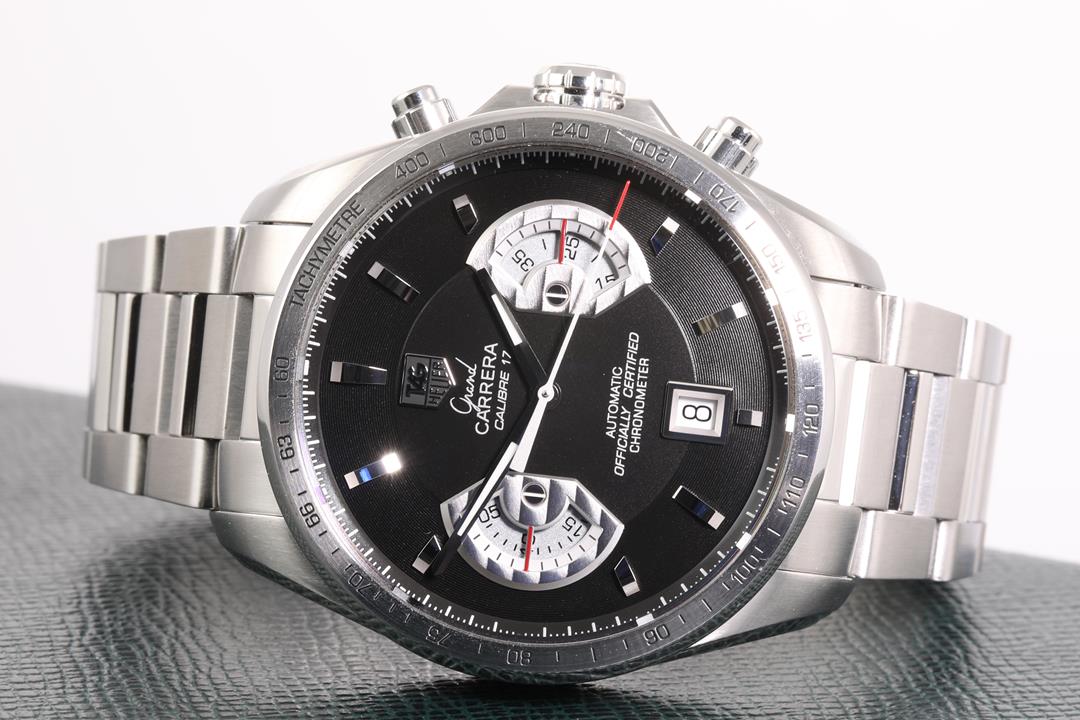 TAG Heuer Grand Carrera Calibre 17 stainless steel automatic mens watch. Black dial, date, case diameter: 43mm, wrist size: 18cm, Swiss made. Ref# CAV511A. With TAG Heuer stainless steel bracelet and clasp. With certificate of authenticity and TAG Heuer box. 3 month FSA warranty. (Pre-owned)