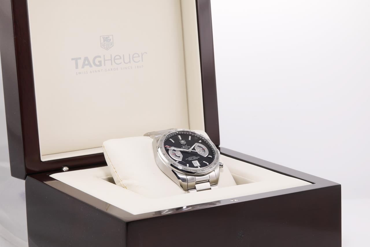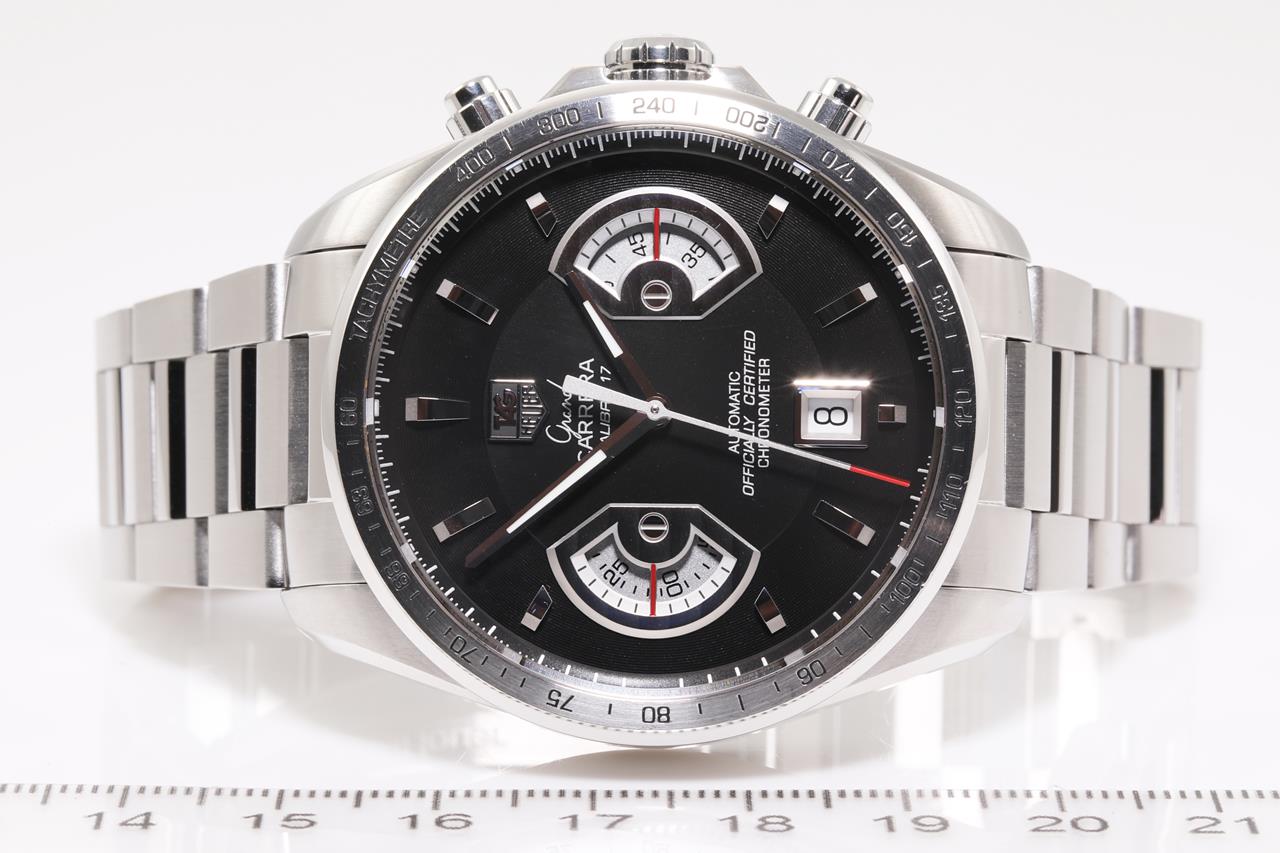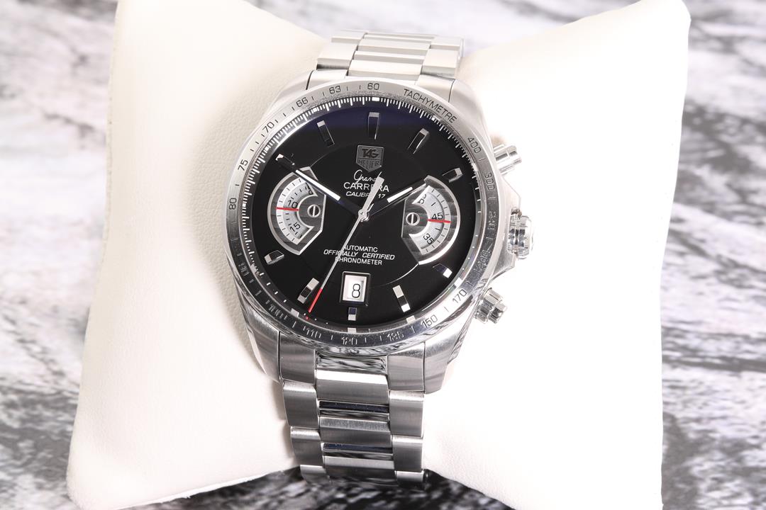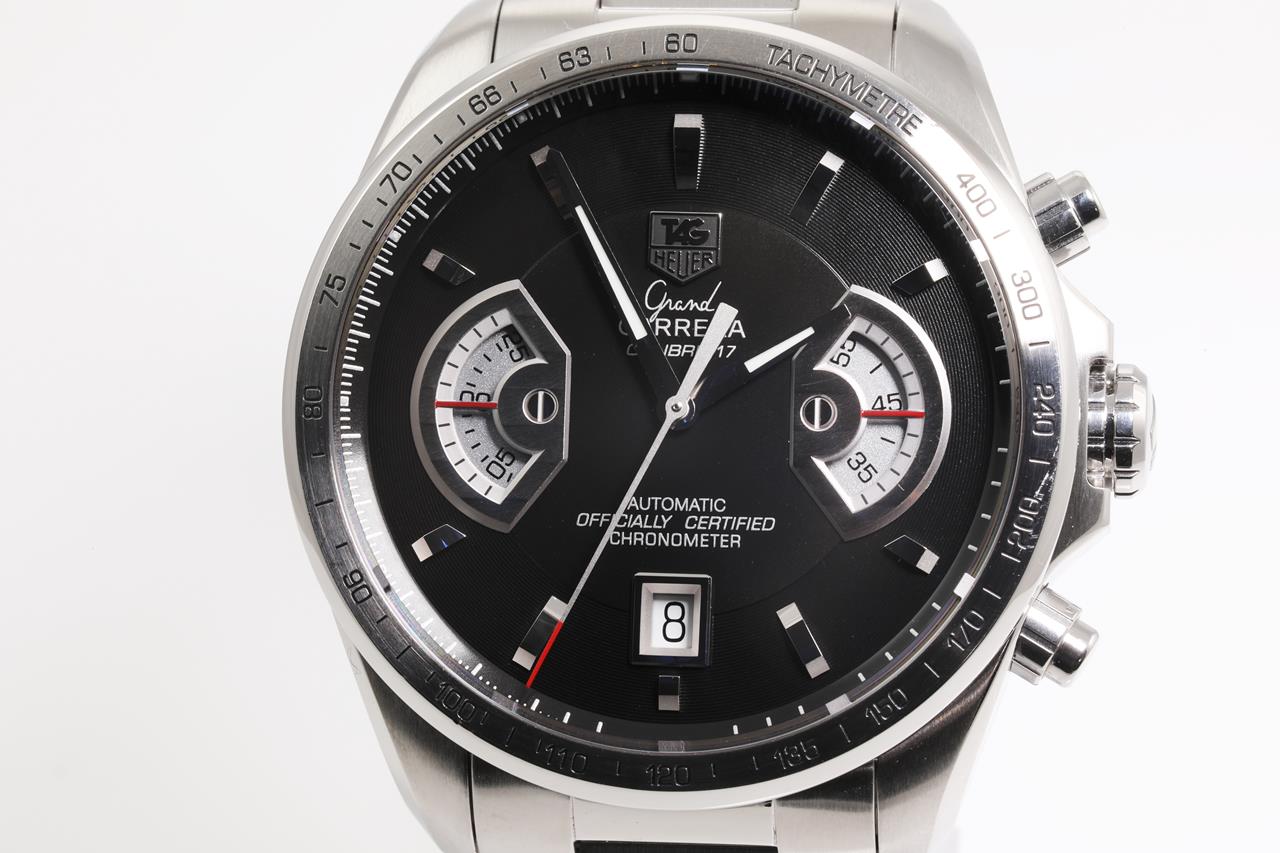 TAG Heuer Grand Carrera Calibre 17 stainless steel automatic mens watch. Black dial, date, case diameter: 43mm, wrist size: 18cm, Swiss made. Ref# CAV511A. With TAG Heuer stainless steel bracelet and clasp. With certificate of authenticity and TAG Heuer box. 3 month FSA warranty. (Pre-owned)