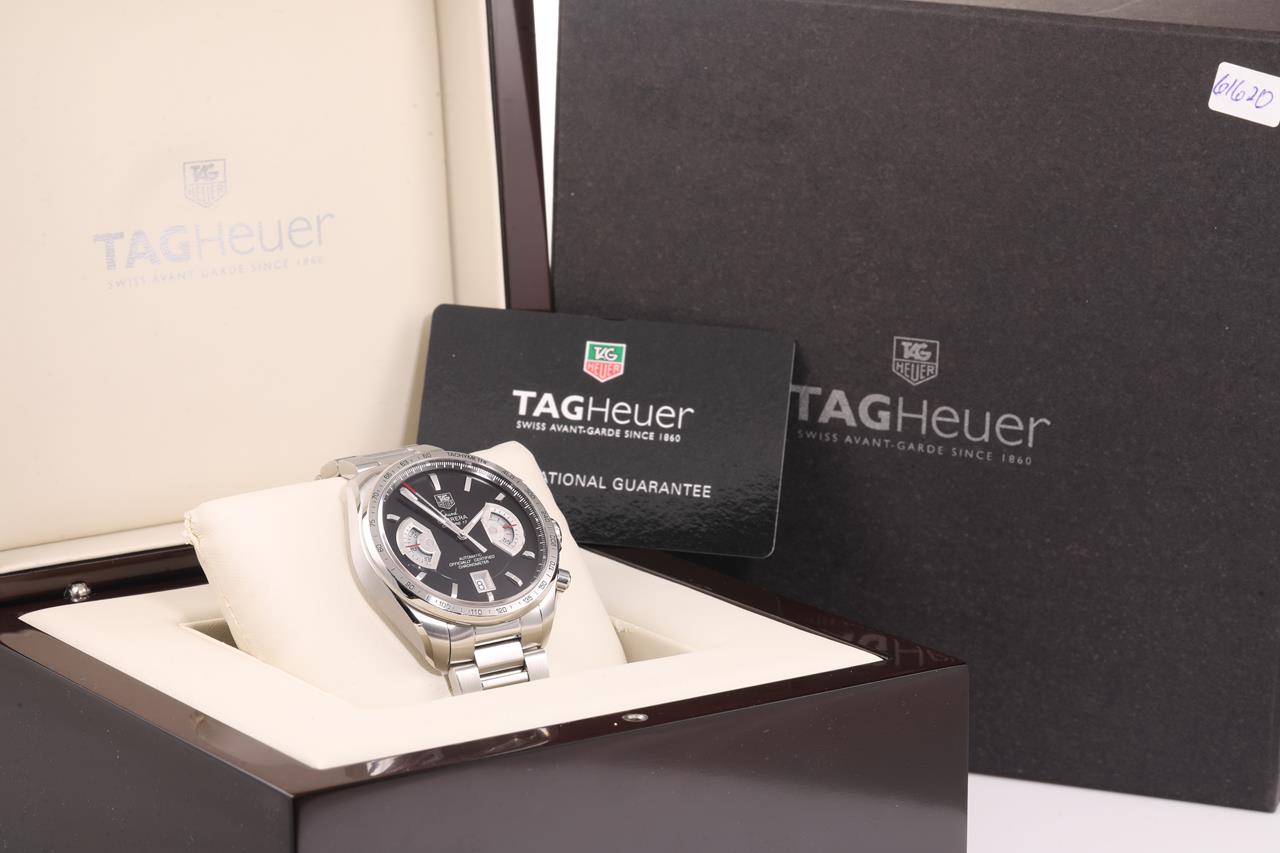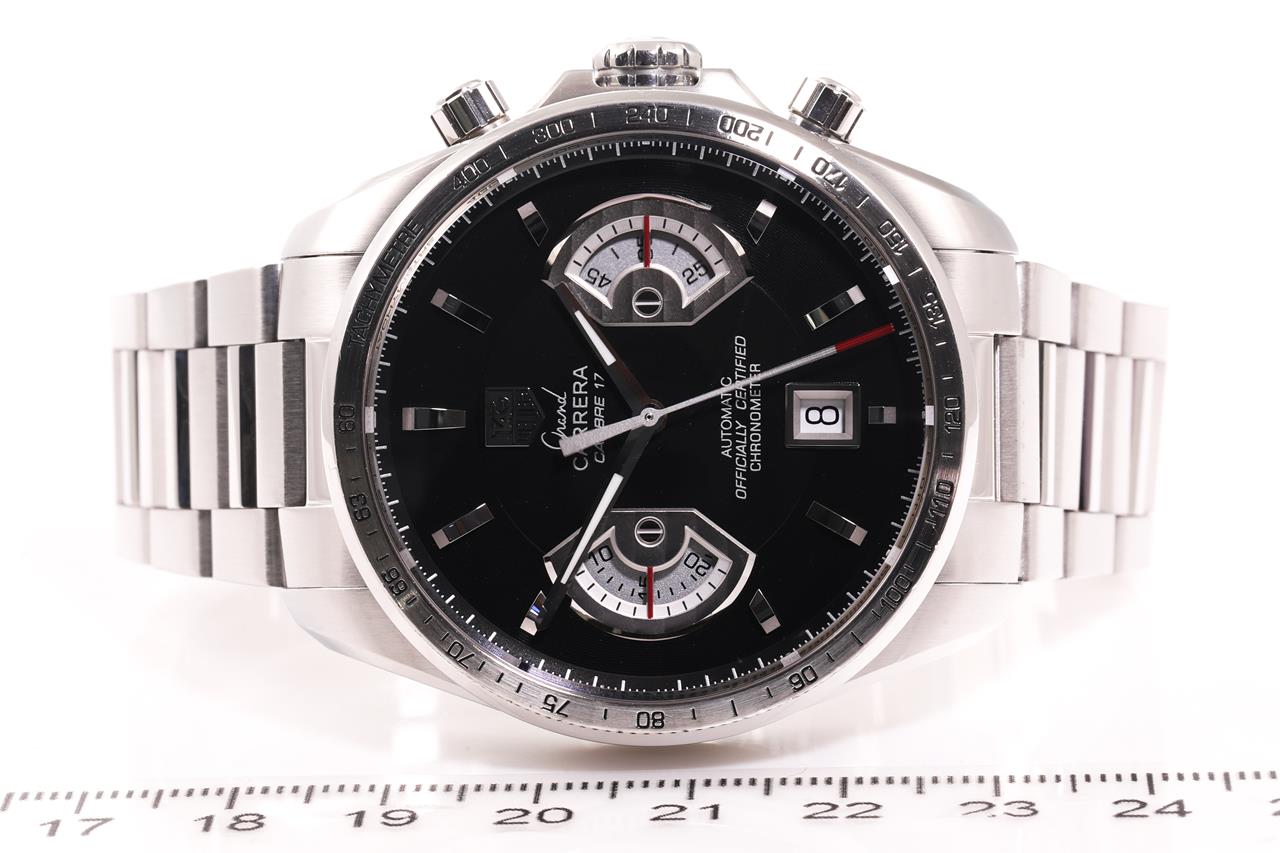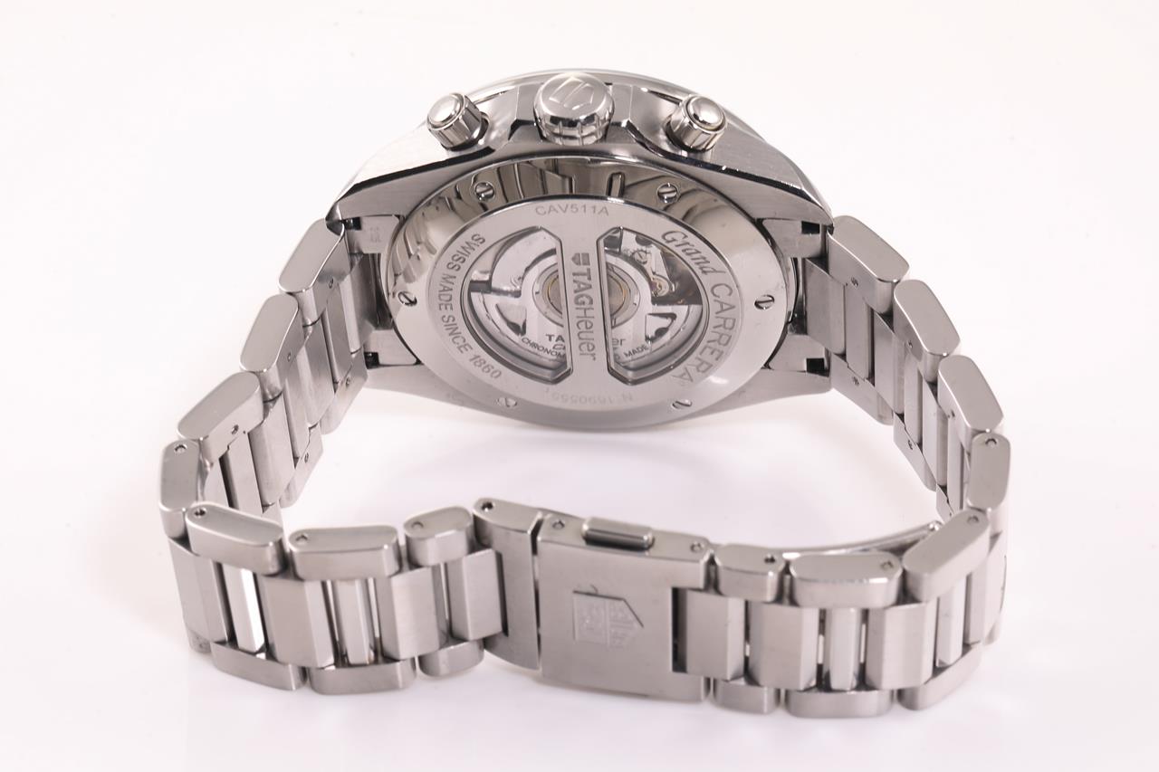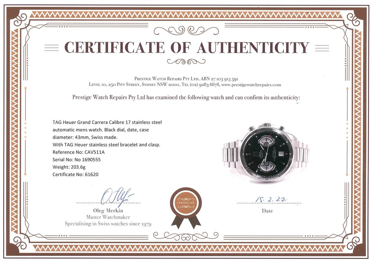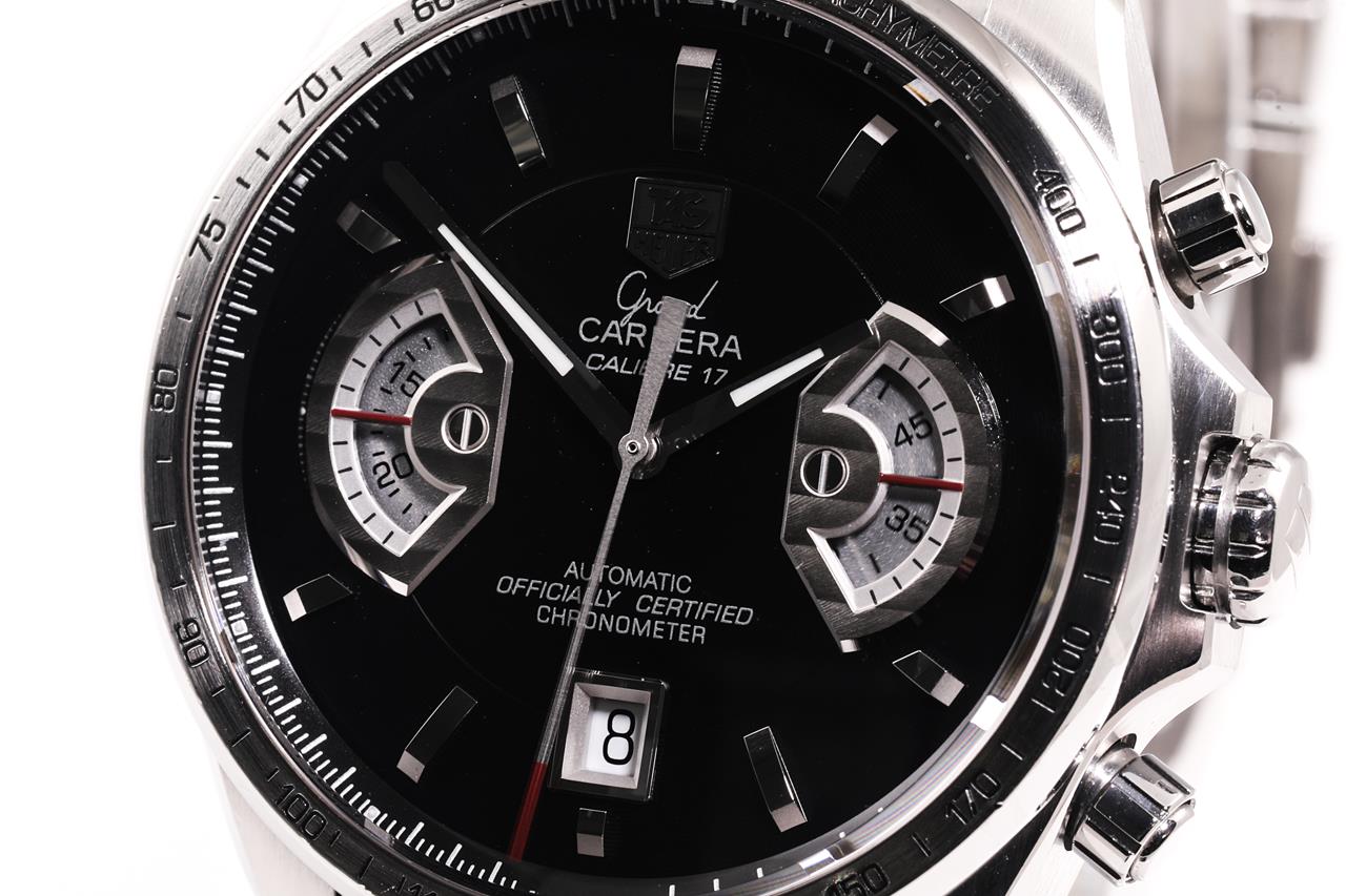 TAG Heuer Grand Carrera Calibre 17 stainless steel automatic mens watch. Black dial, date, case diameter: 43mm, wrist size: 19cm, Swiss made. Ref# CAV511A. With TAG Heuer stainless steel bracelet and clasp. With Certificate of Authenticity, TAG Heuer International Guarantee Card dated 29/12/2009 and TAG Heuer box. 3 month FSA warranty. (Pre-owned)