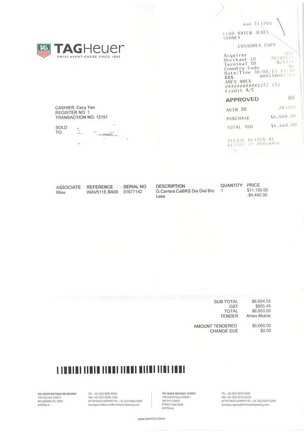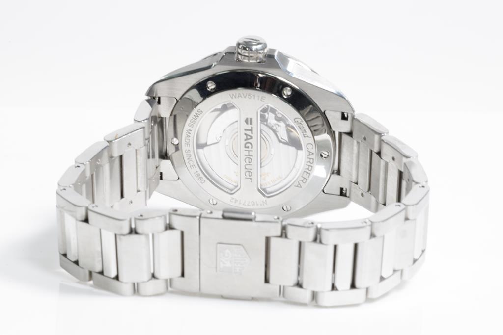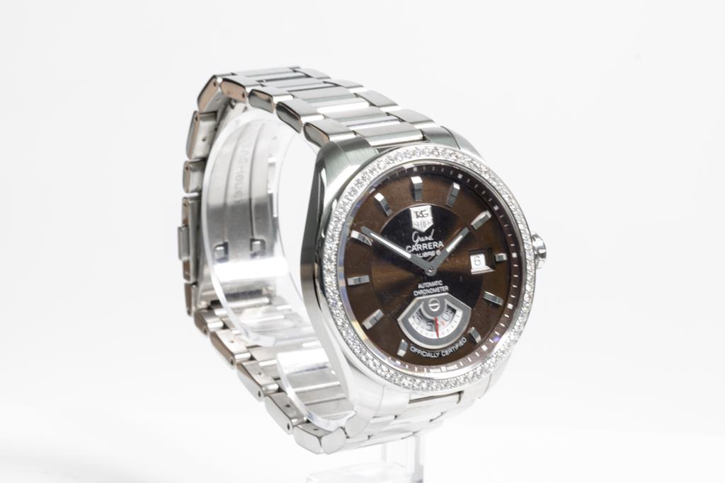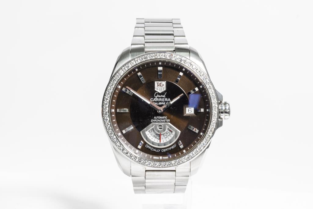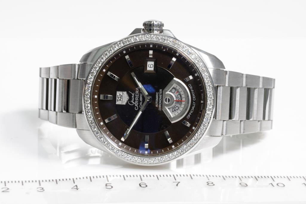 TAG Heuer Grand Carrera stainless steel automatic mens watch. Black dial, Diamond set bezel, date, case diameter: 40mm, wrist size: 19cm, Swiss made. Ref# WAV511E.BA09. With TAG Heuer stainless steel bracelet and clasp. With Certificate of Authenticity, TAG Heuer purchase invoice & TAG Heuer International Guarantee Card both dated 30/08/2013, TAG Heuer Precious Stone Certificate Card, Chronometer Officially Certified Card and TAG Heuer box. 3 month FSA warranty. (Pre-owned)