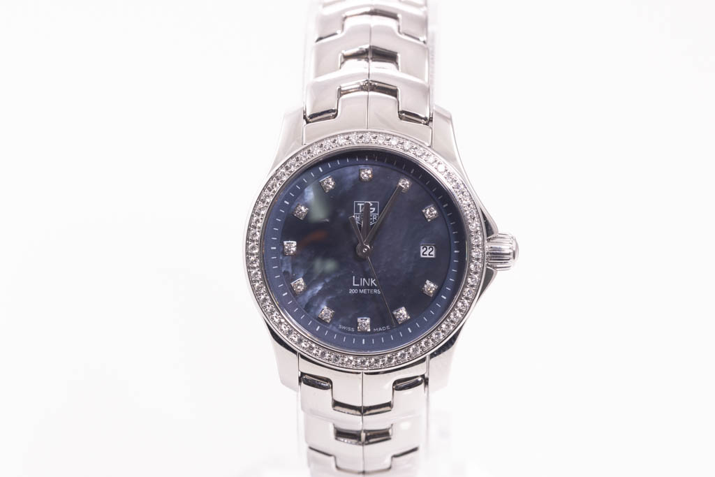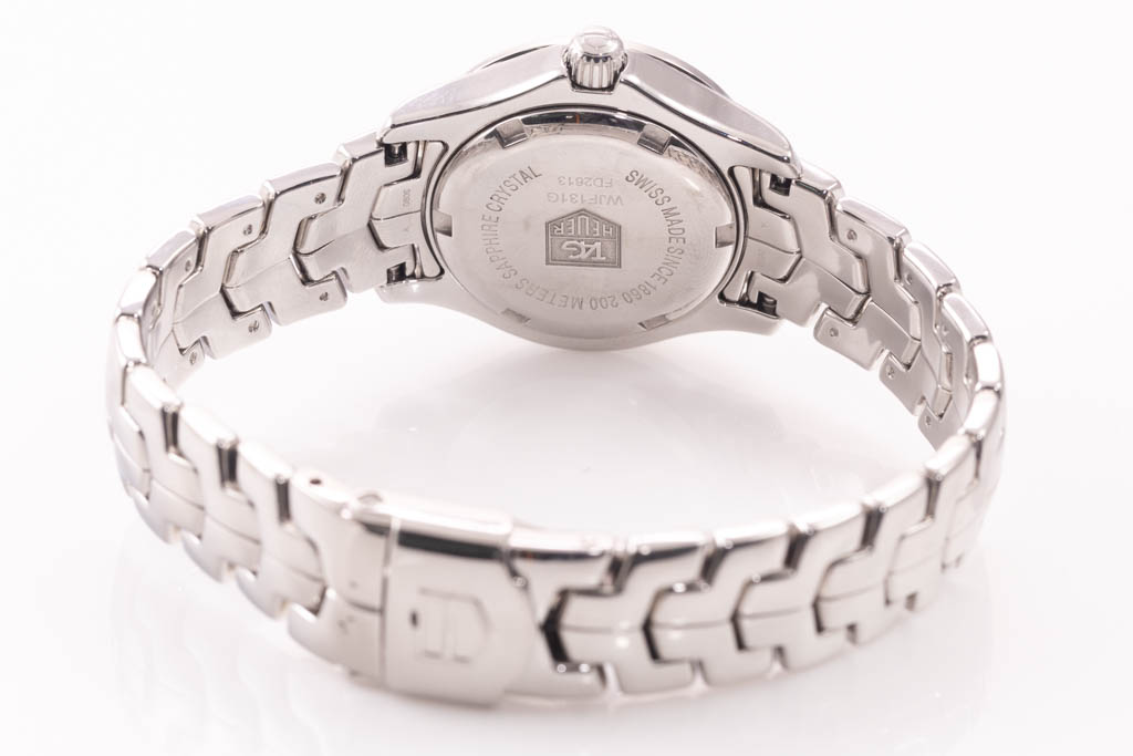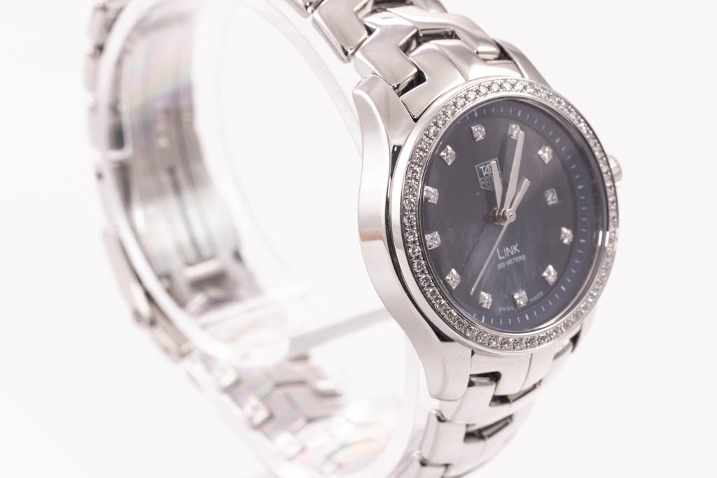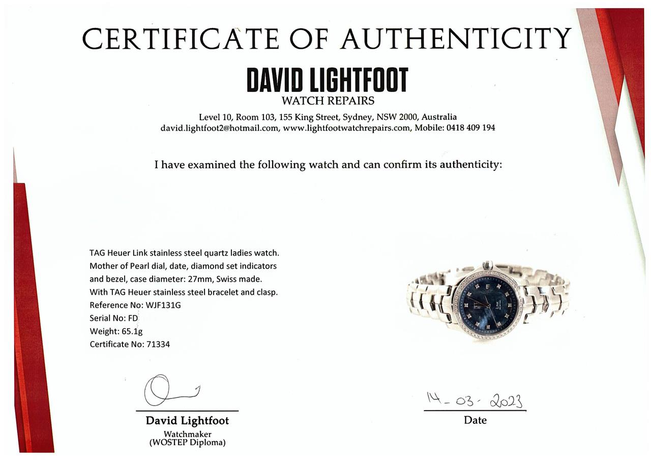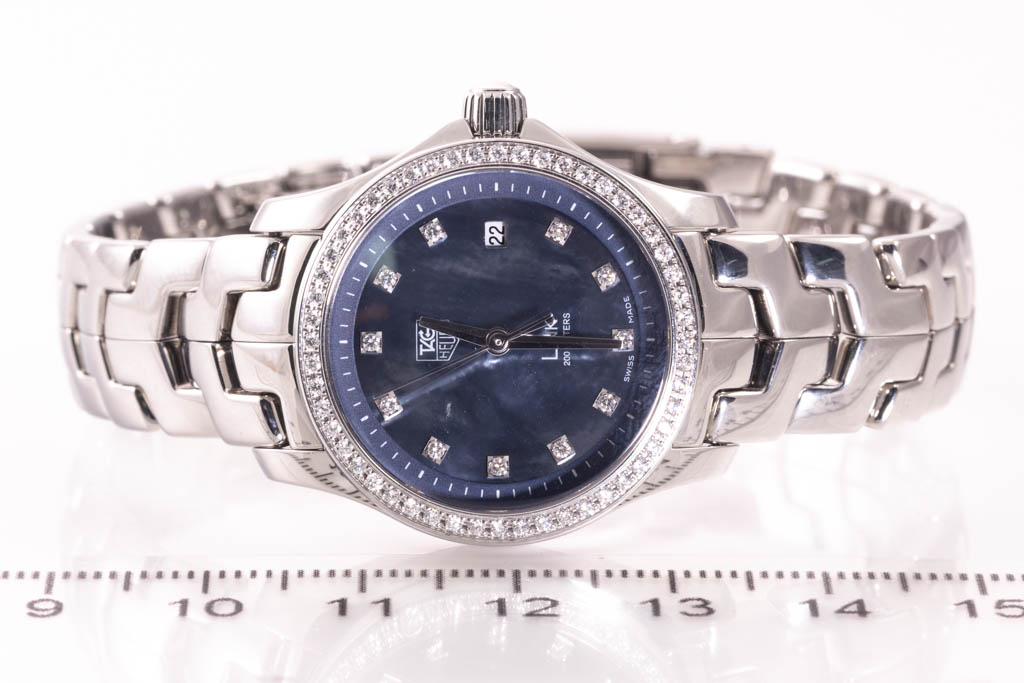 TAG Heuer Link stainless steel quartz ladies watch. Mother of Pearl dial, date, Diamond set indicators and bezel, case diameter: 27mm, wrist size: 15.5cm, Swiss made. Ref# WJF131G. With TAG Heuer stainless steel bracelet and clasp. With Certificate of Authenticity, TAG Heuer International Guarantee Card dated 14/07/09, TAG Heuer precious stones certificate card and TAG Heuer box. 3 month FSA warranty. (Pre-owned)