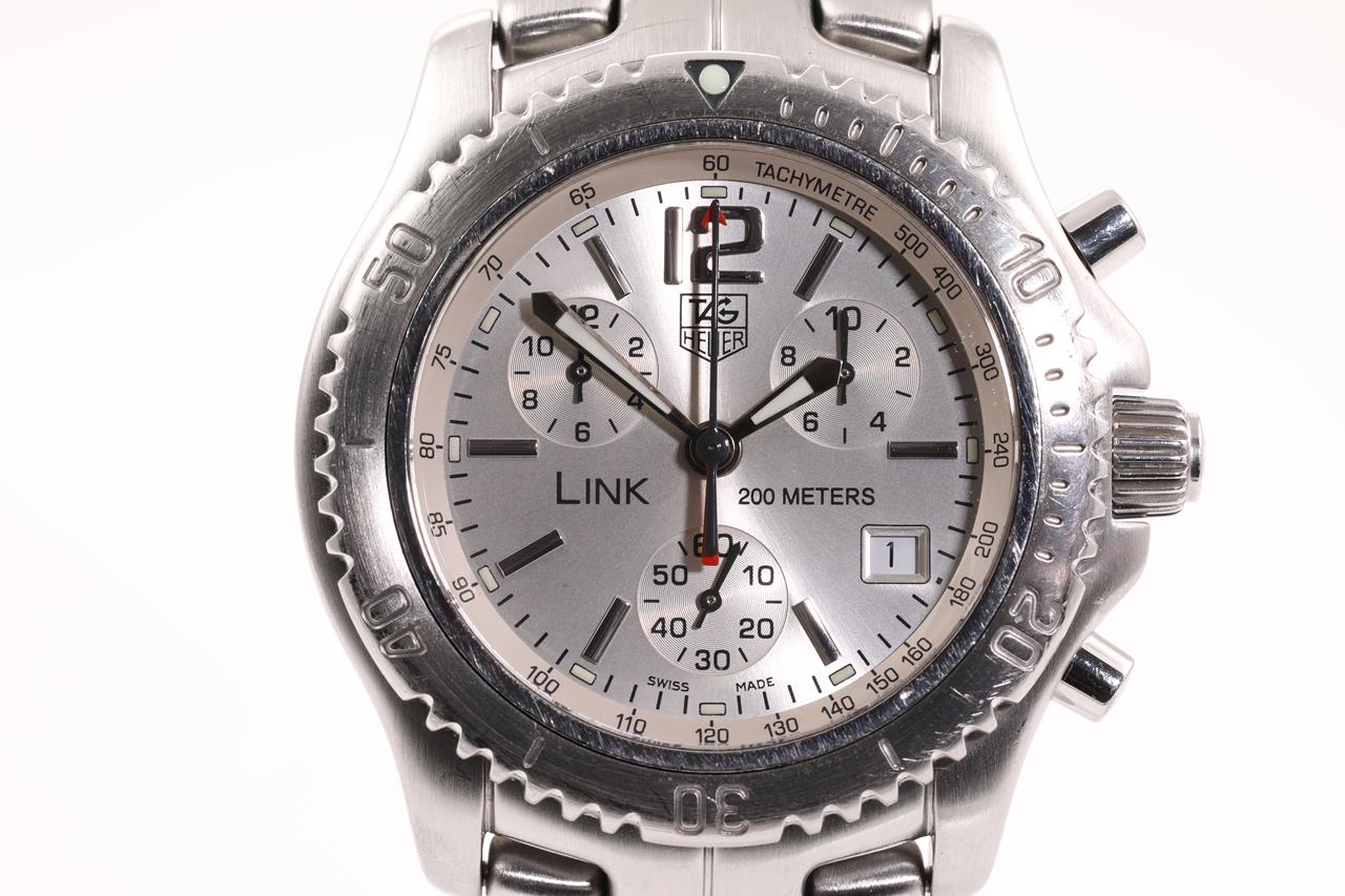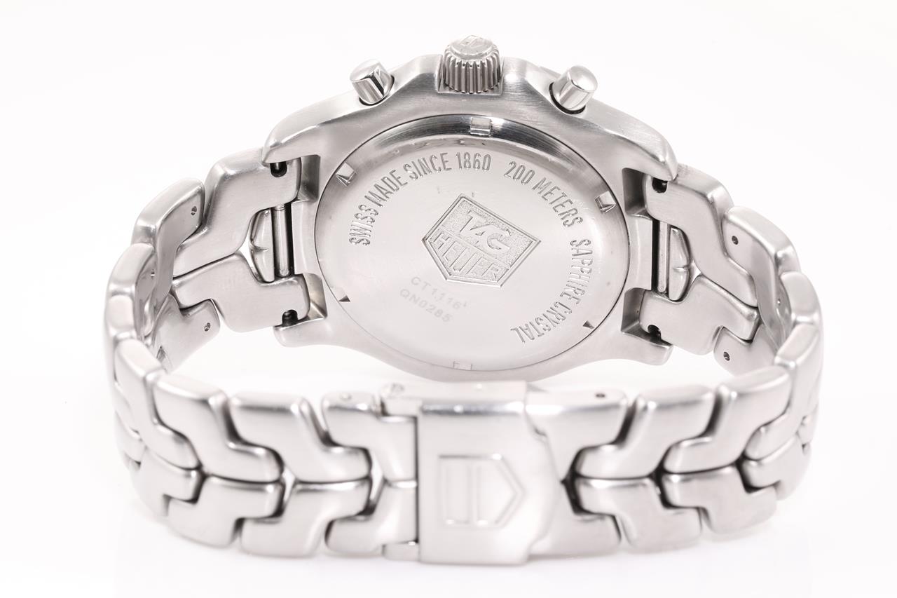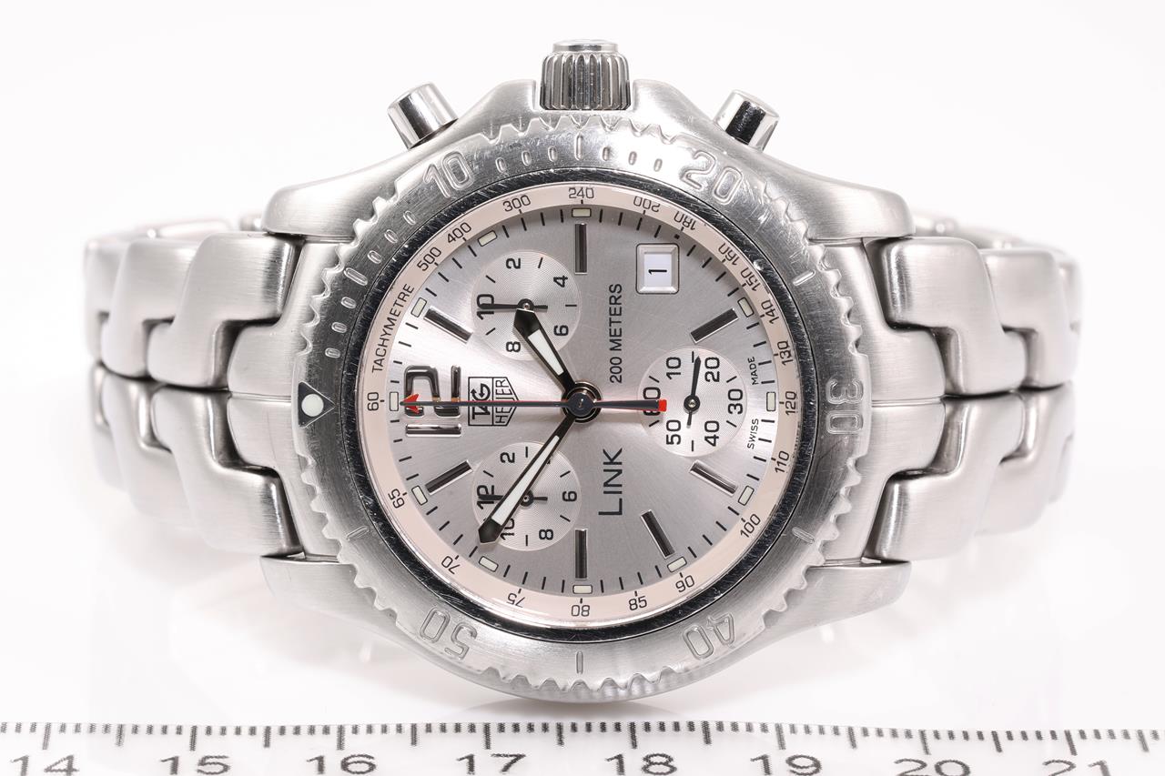 TAG Heuer LINK stainless steel quartz mens watch. Silver chronograph dial, date, case diameter: 43mm, wrist size: 17.5cm Swiss made. Ref# CT1116. With TAG Heuer stainless steel bracelet and clasp. 3 month FSA warranty. (Pre-owned)