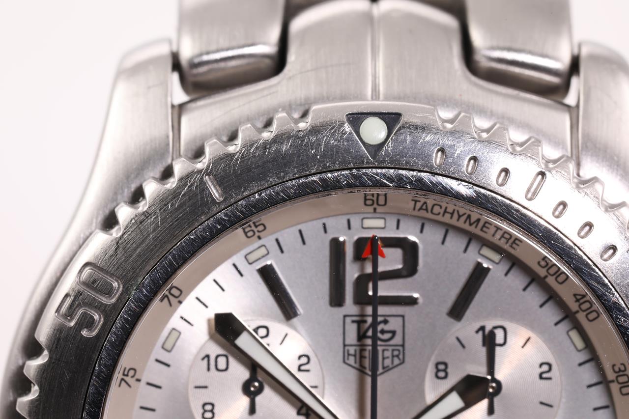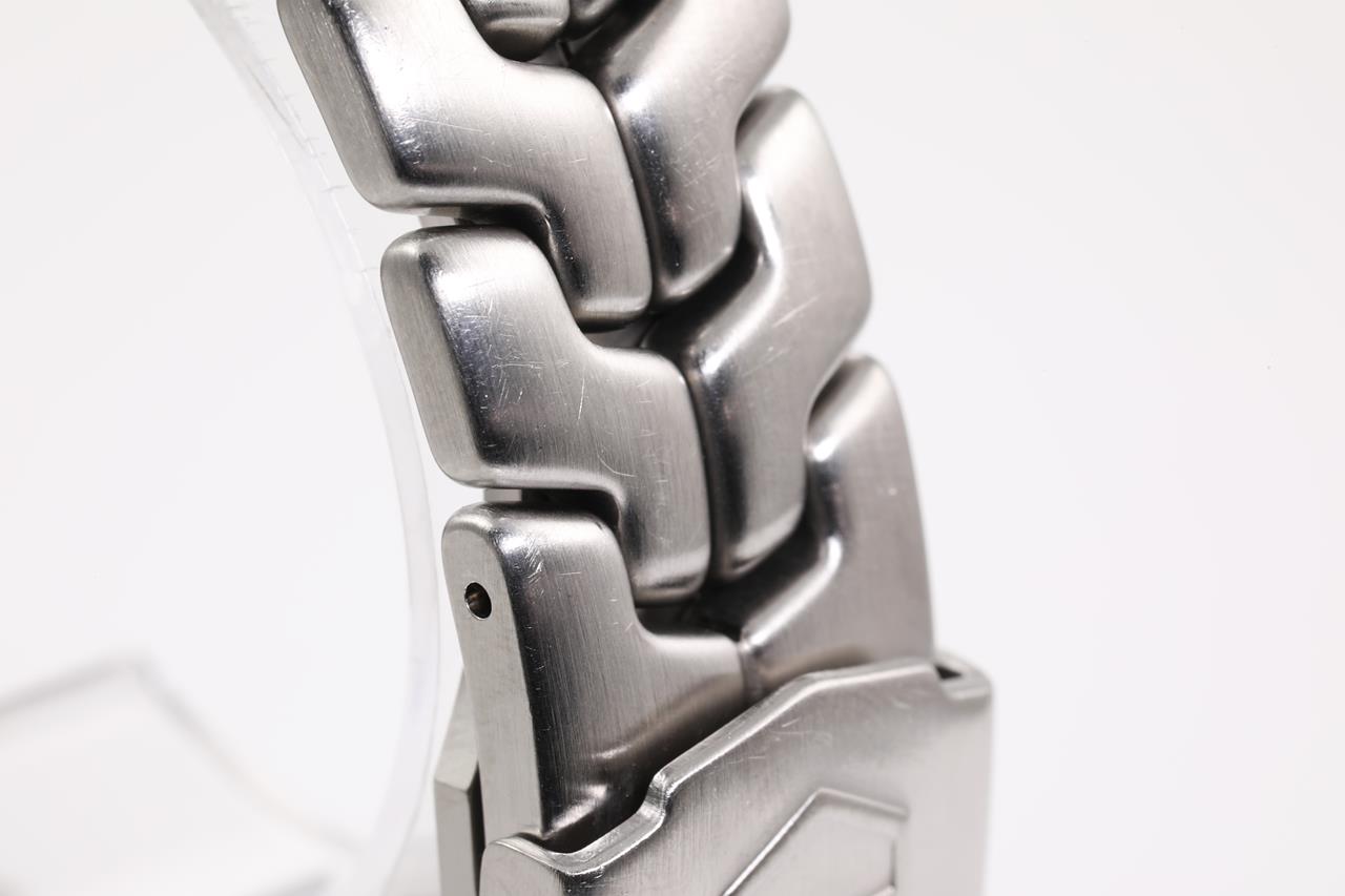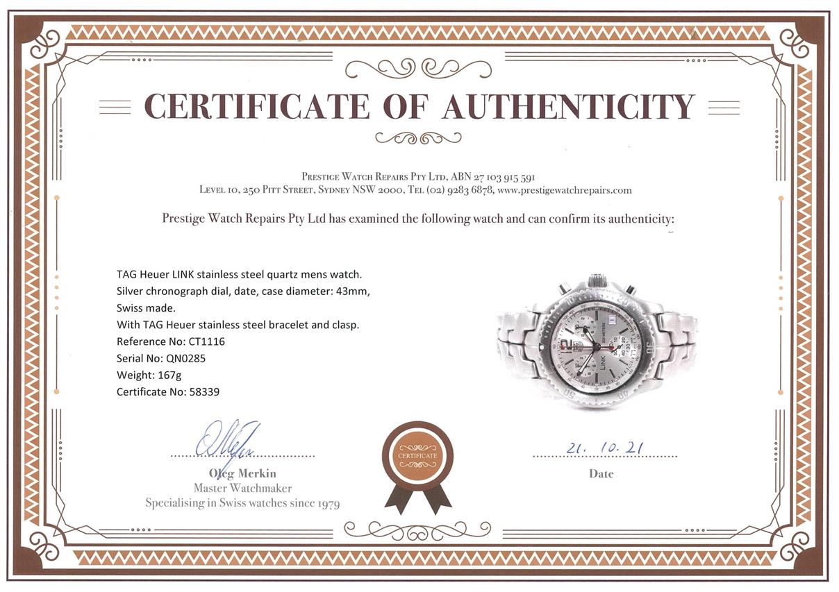 TAG Heuer LINK stainless steel quartz mens watch. Silver chronograph dial, date, case diameter: 43mm, wrist size: 17.5cm Swiss made. Ref# CT1116. With TAG Heuer stainless steel bracelet and clasp. 3 month FSA warranty. (Pre-owned)