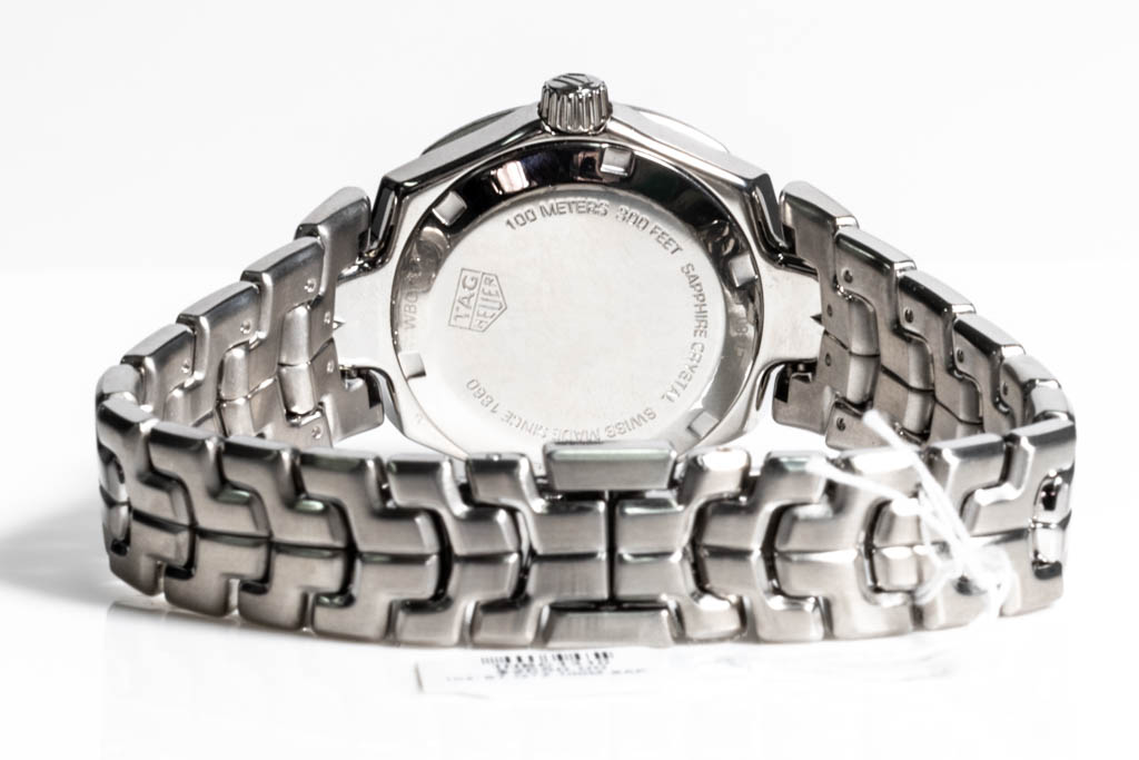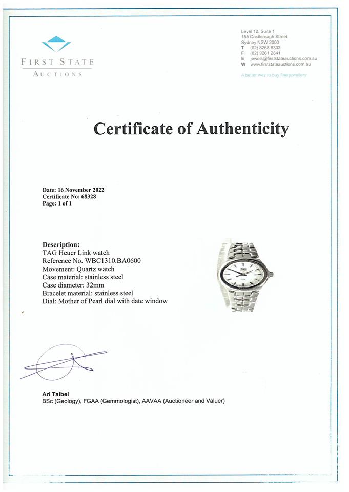 TAG Heuer Link stainless steel quartz watch. Mother of Pearl dial, date, case diameter: 32mm, wrist size: 18cm, Swiss made. Ref #WBC1310.BA0600. With TAG Heuer stainless steel bracelet and clasp. With FSA Certificate of Authenticity and Longines Instruction Booklet. No box provided. 3 month FSA warranty. (As New, Note: minor scratches on case and bracelet due to being display stock)