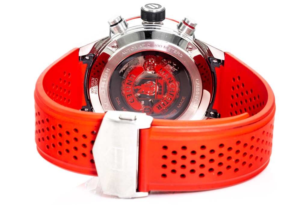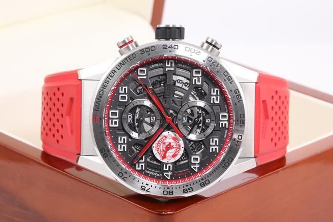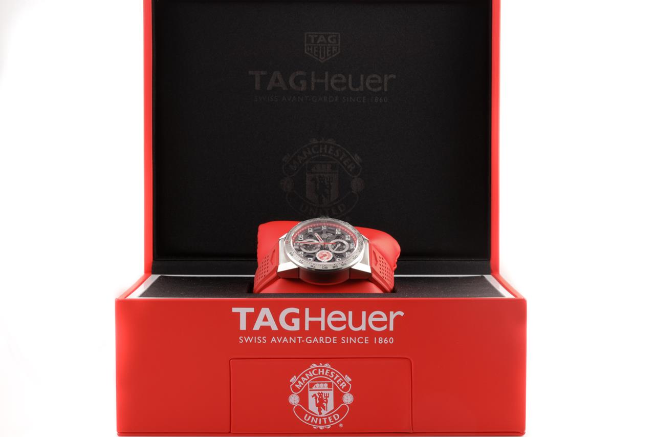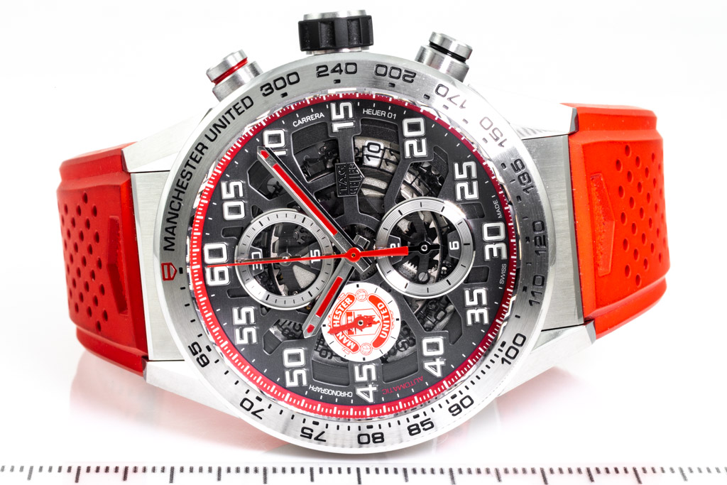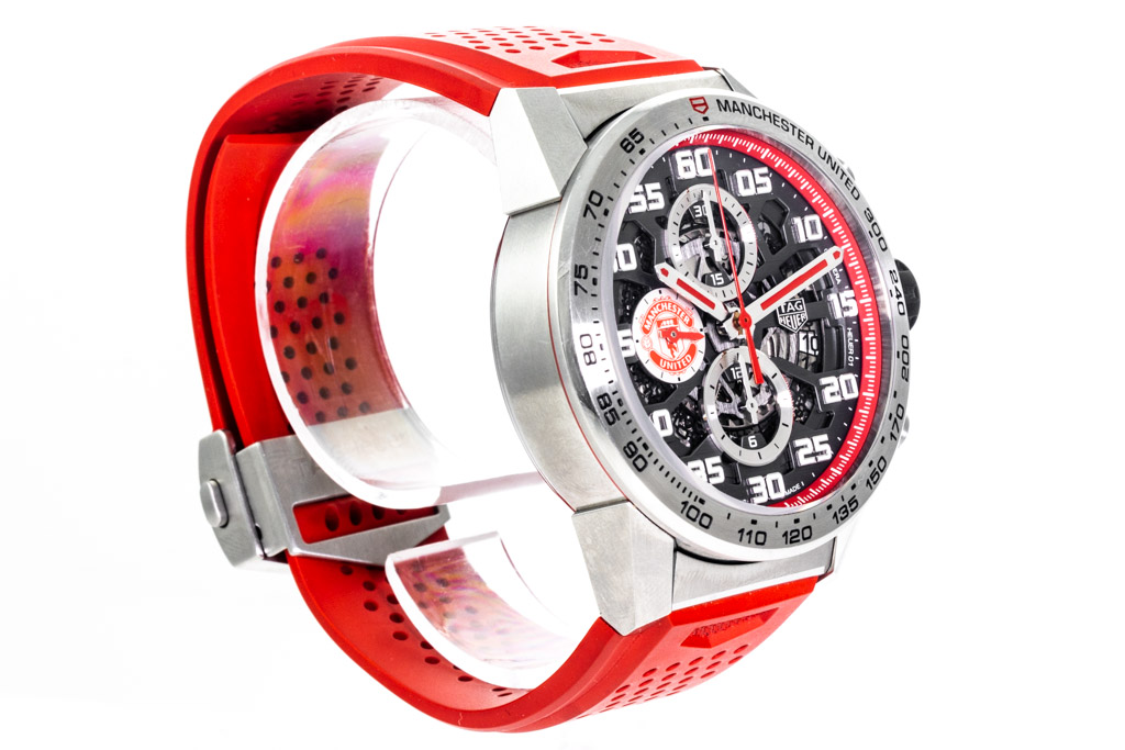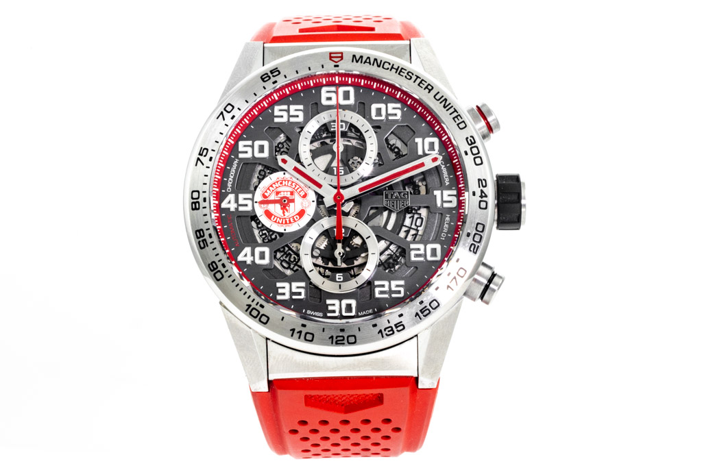 TAG Heuer Carrera Manchester United Special Edition stainless steel automatic men's watch. Grey skeleton chronograph dial, date, case diameter: 43mm, wrist size: 18cm, Swiss made. Ref# CAR201M. With TAG Heuer red rubber strap and clasp. With certificate of authenticity and TAG Heuer box. 3 month FSA warranty. (Pre-owned)