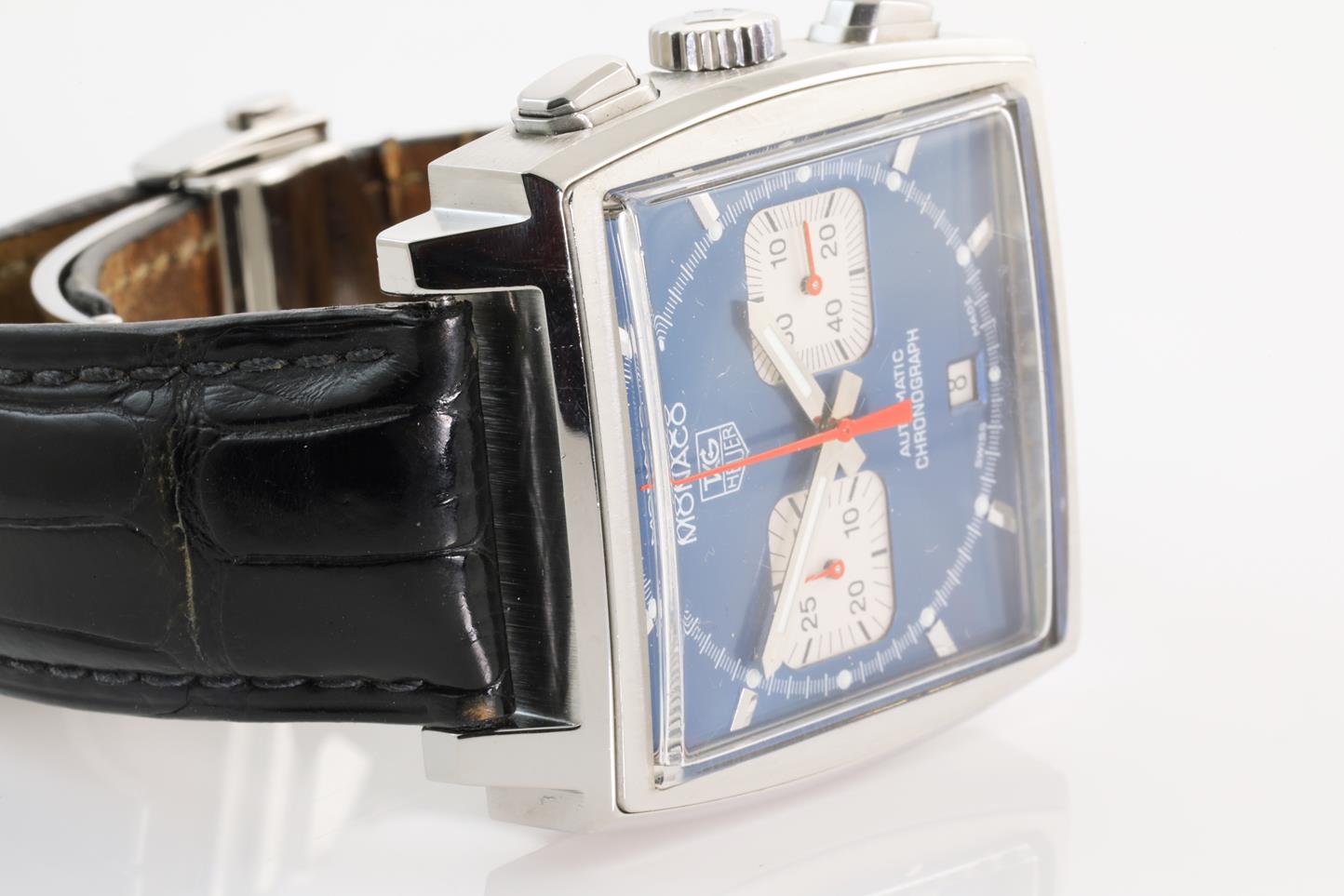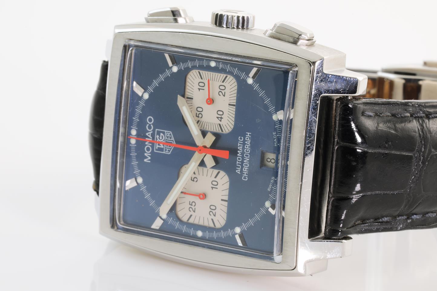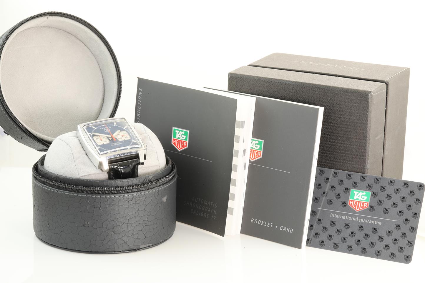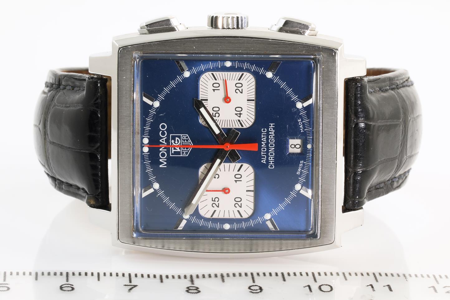 TAG Heuer Monaco stainless steel automatic mens watch. Blue chronograph dial, date, case diameter: 38mm, wrist length: 22cm, Swiss made. Ref# CW2113.FC8183. With TAG Heuer black leather adjustable worn strap & clasp. With Certificate of Authenticity. TAG Heuer worn box. 3 month FSA warranty. (Pre-owned)