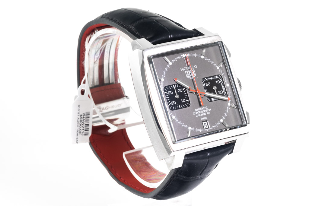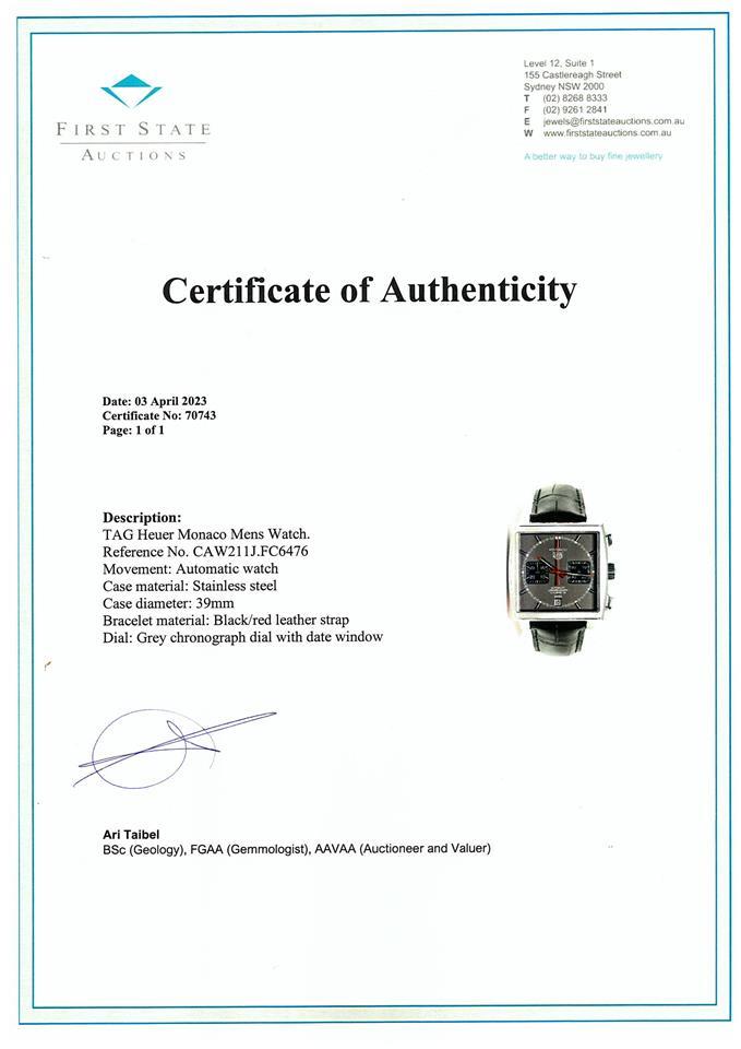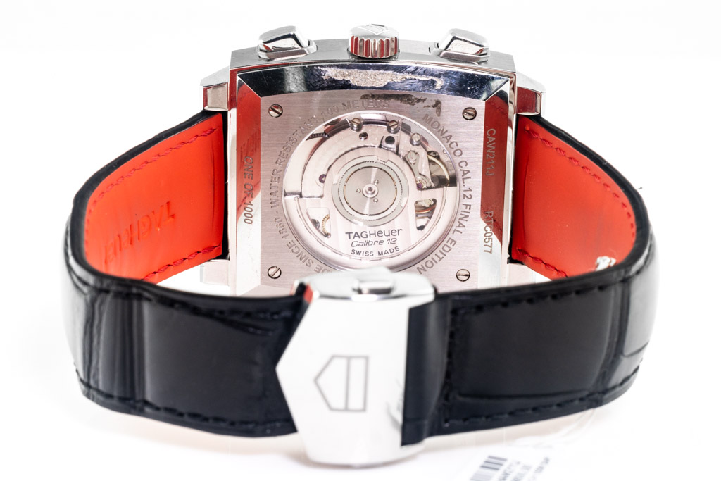 TAG Heuer Monaco Final Edition of 1000 stainless steel automatic mens watch. Grey chronograph dial, date, case diameter: 39mm, wrist size: 19cm, Swiss made. Ref# CAW211J.FC6476. With TAG Heuer black/red leather strap and clasp. With FSA Certificate of authenticity and TAG Heuer box. 3 month FSA warranty apply. (As new, Note: wear on strap and minor scratches on case due to being display stock)