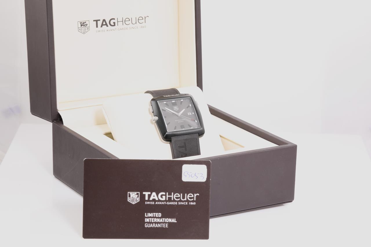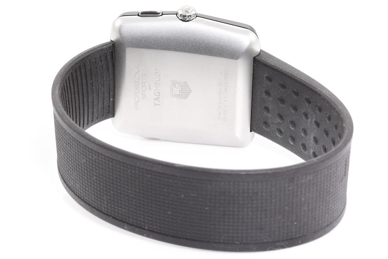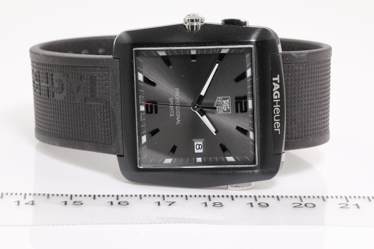 TAG Heuer Professional Golf Sports titanium and stainless steel quartz golf mens watch. Black dial, date, case diameter: 38mm x 36mm, wrist size: 18.4cm, Swiss made. Ref# WAE1113. With TAG Heuer black silicon elastic strap. With TAG Heuer International warranty card dated 19/08/2016, certificate of authenticity and TAG Heuer box. 3 month FSA warranty. (Pre-owned)