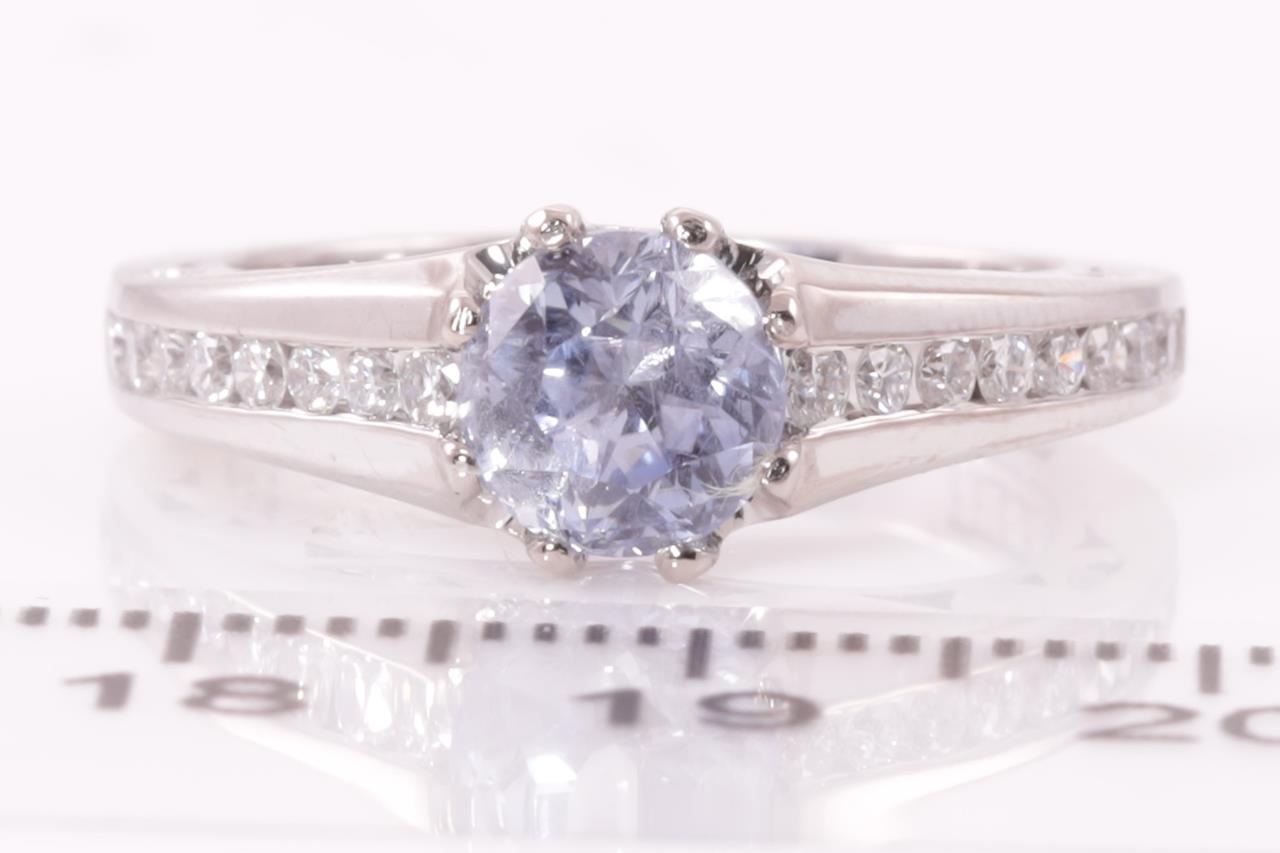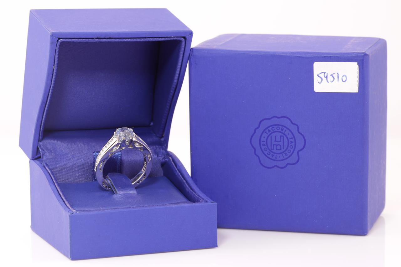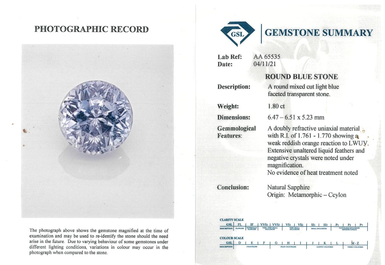 Tagori Sapphire and Diamond ring with round blue Ceylon Sapphire of 1.80cts (with GSL Gemstone summary #AA65535), and round Diamonds totalling approximately 0.48cts (Estimated grading H SI). 18ct white gold. Ring size M. Weight 7.2g. With original box. (As New)