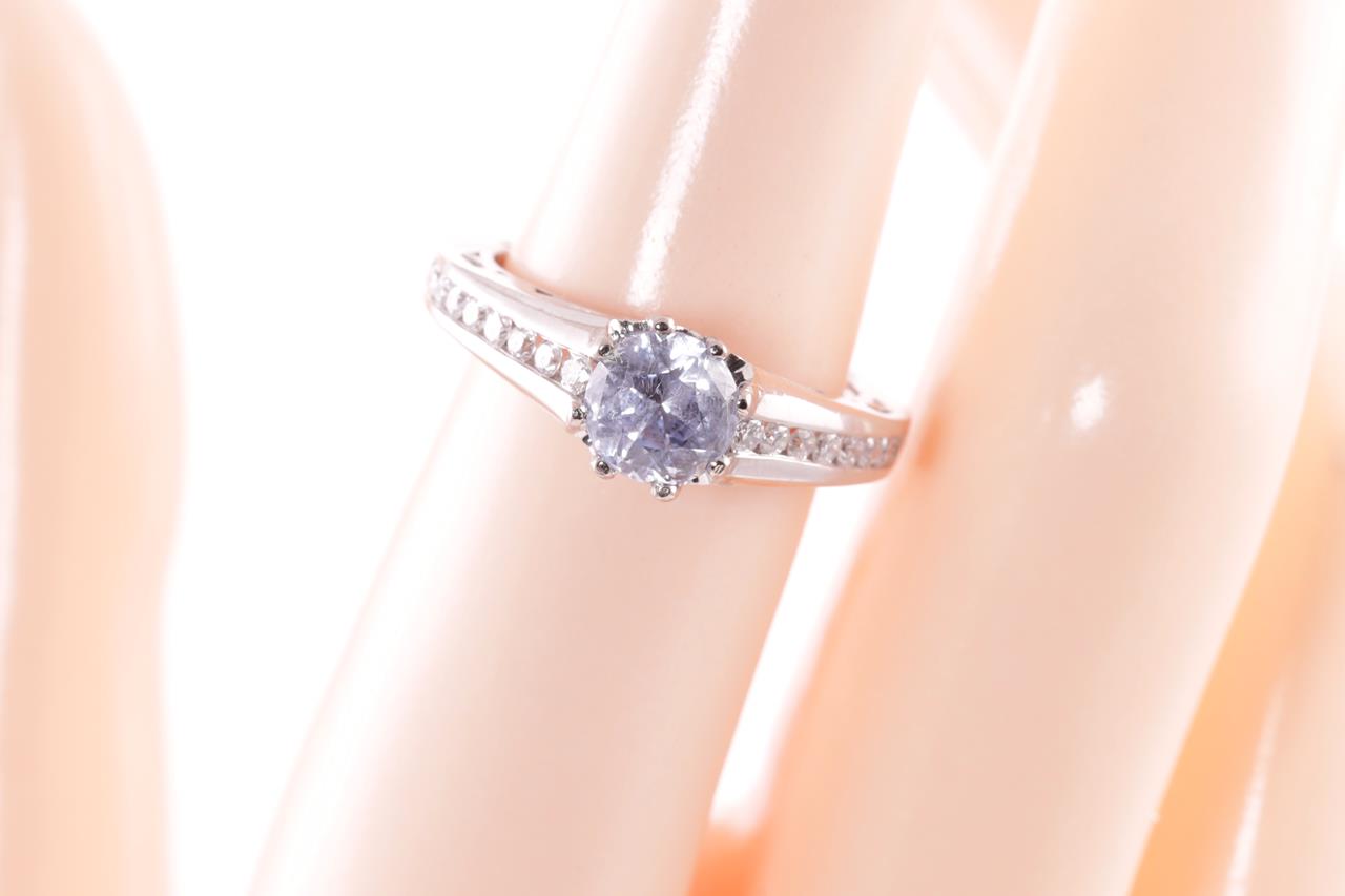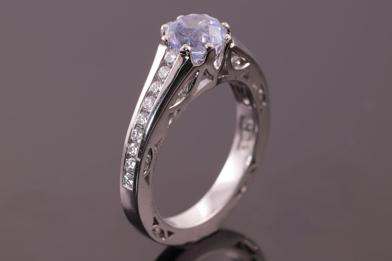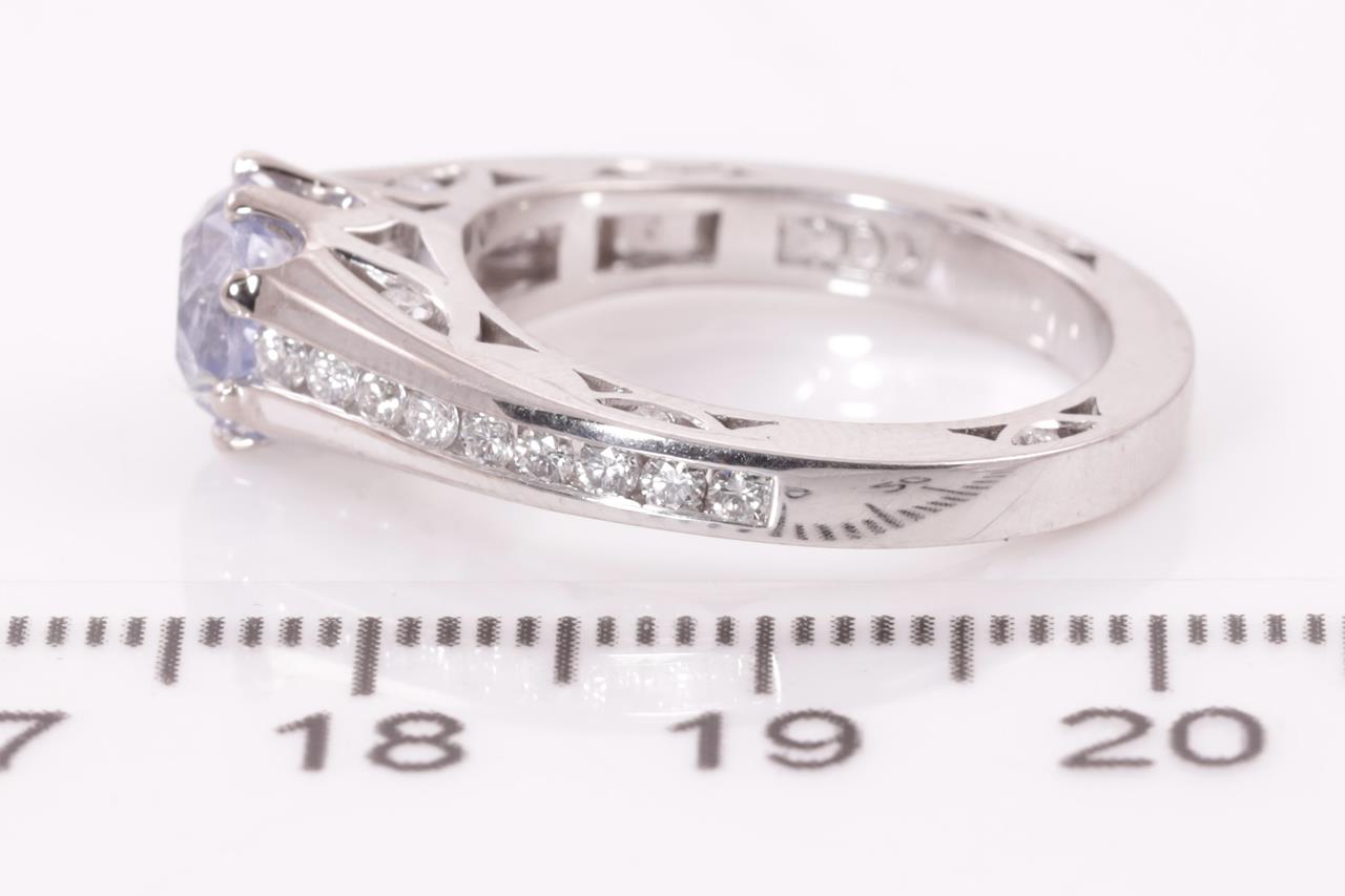 Tagori Sapphire and Diamond ring with round blue Ceylon Sapphire of 1.80cts (with GSL Gemstone summary #AA65535), and round Diamonds totalling approximately 0.48cts (Estimated grading H SI). 18ct white gold. Ring size M. Weight 7.2g. With original box. (As New)