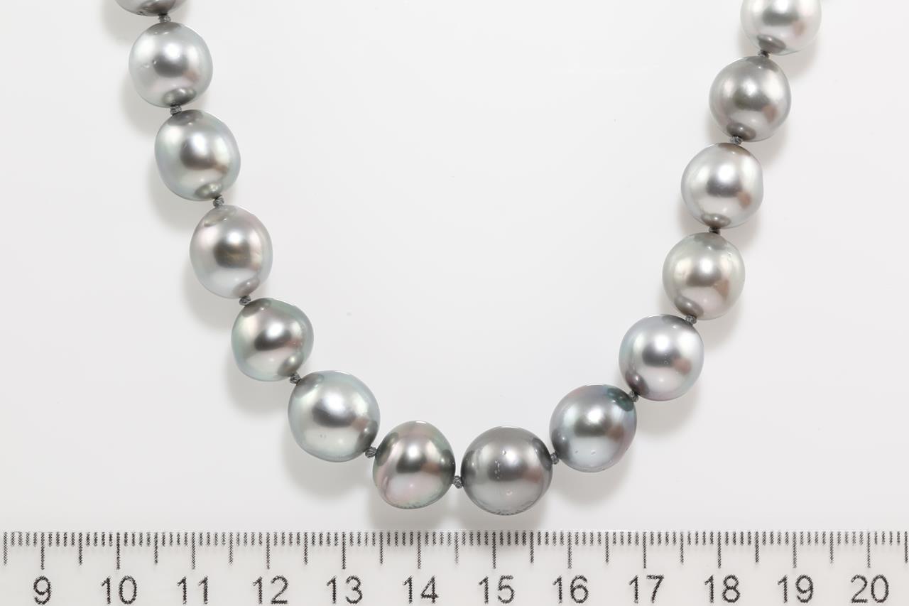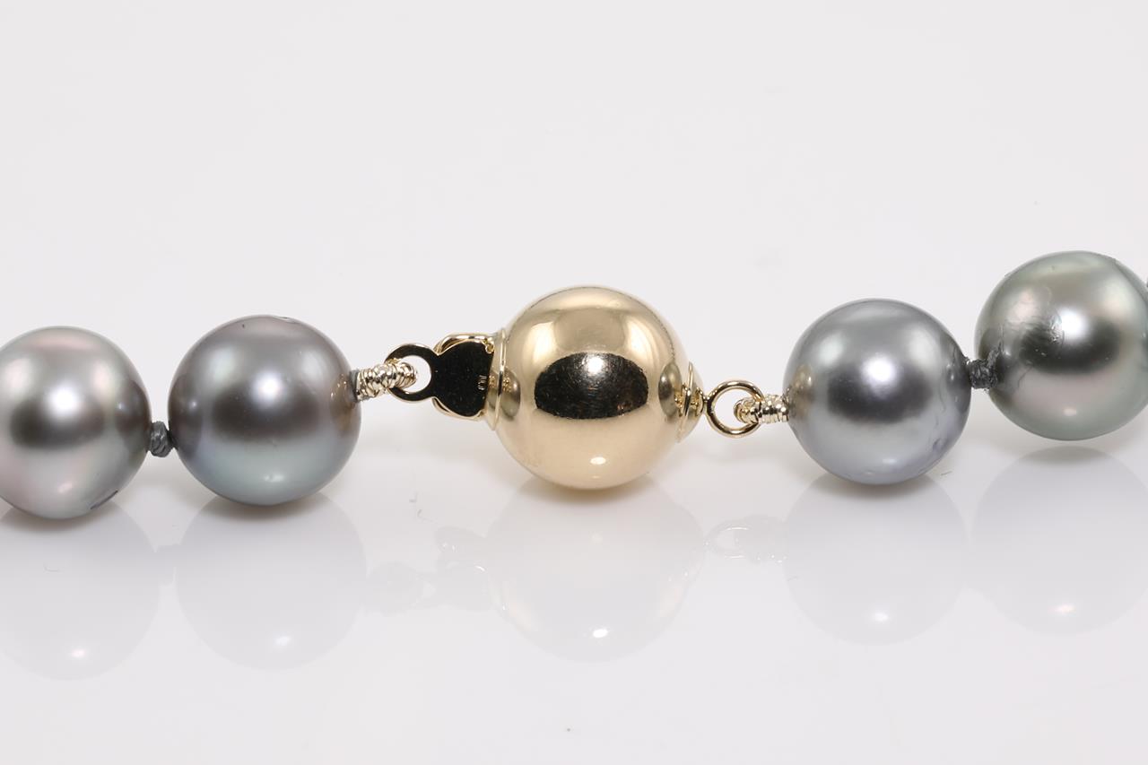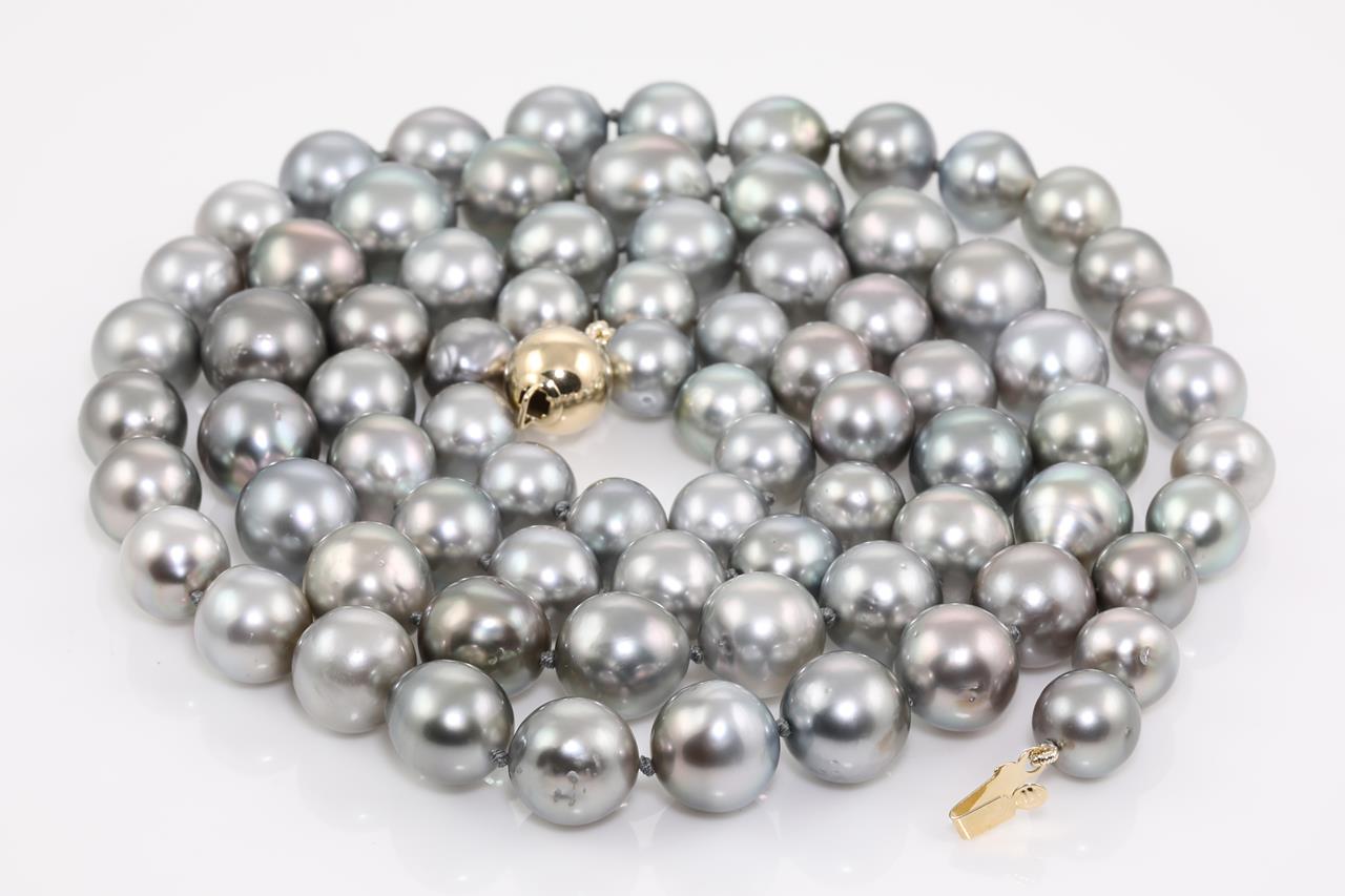 Pearl opera length necklace with silver Tahitian pearls of 9.2mm - 11.9mm. 14ct yellow gold clasp. Length: 90cm. Weight: 118.7g. (Pre-owned)
