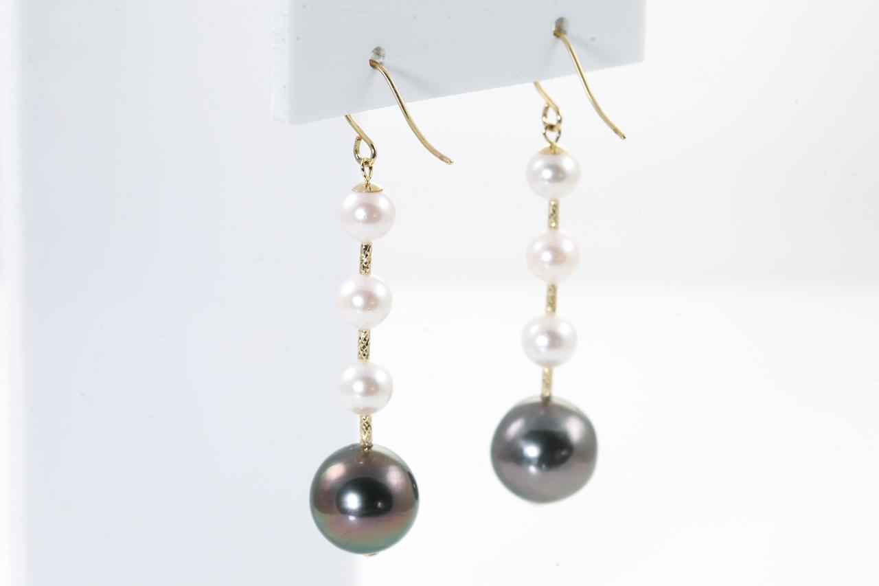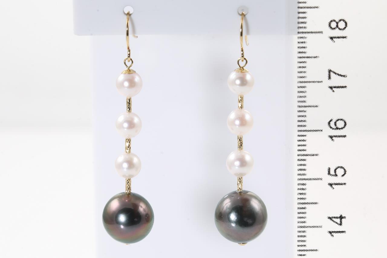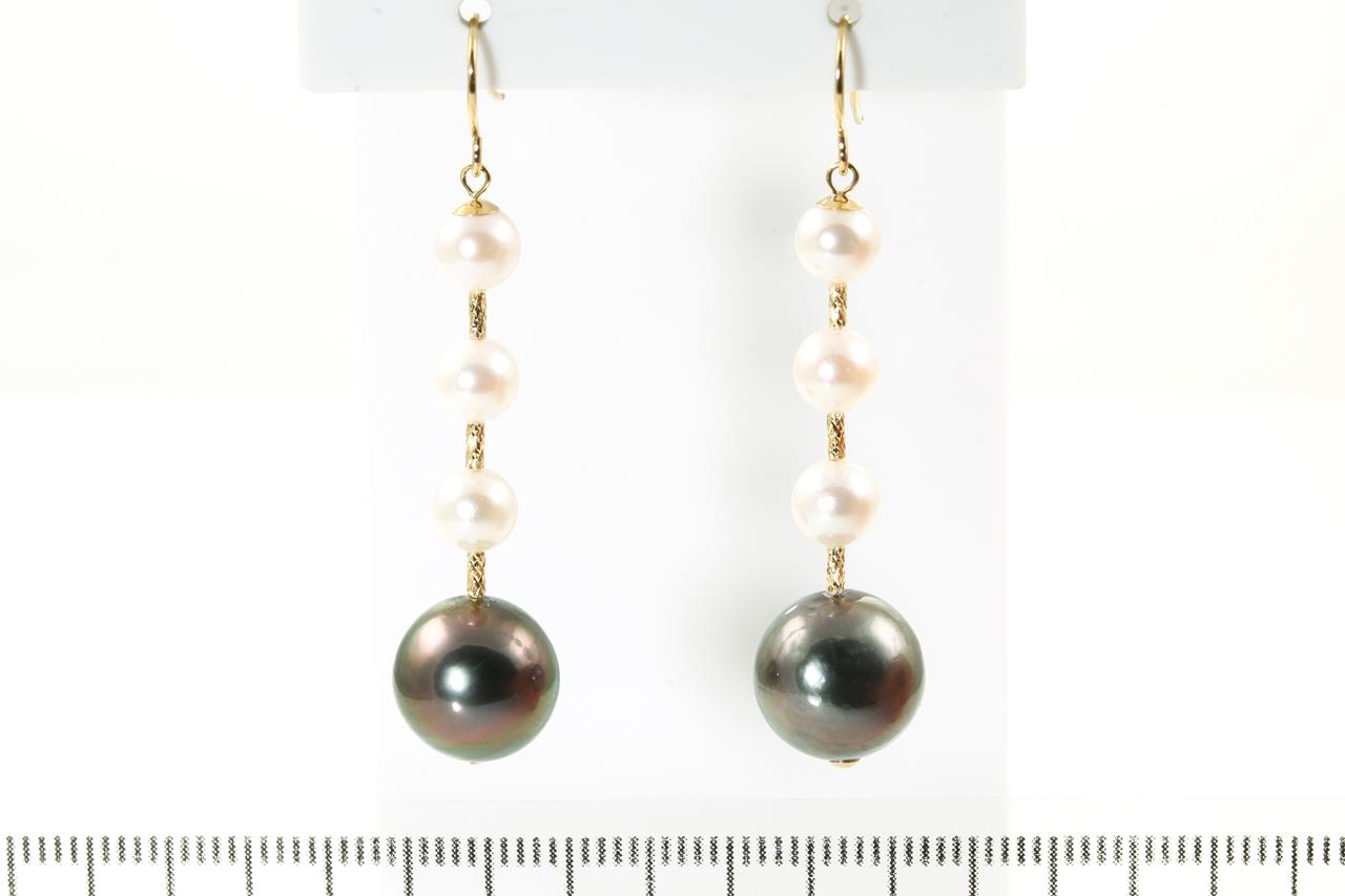 Pearl shepherds hook drop earrings with 2 Tahitian Pearls of 10mm and 6 Cultured Pearls of 5mm. 18ct yellow gold. Weight: 5.0g. (Pre-owned)