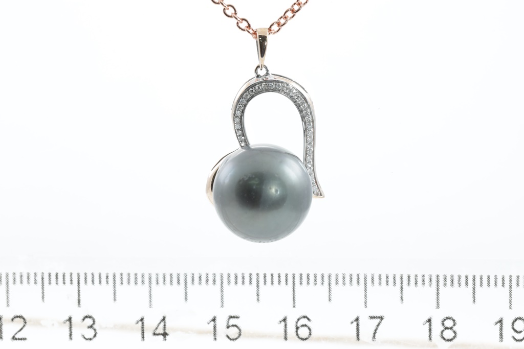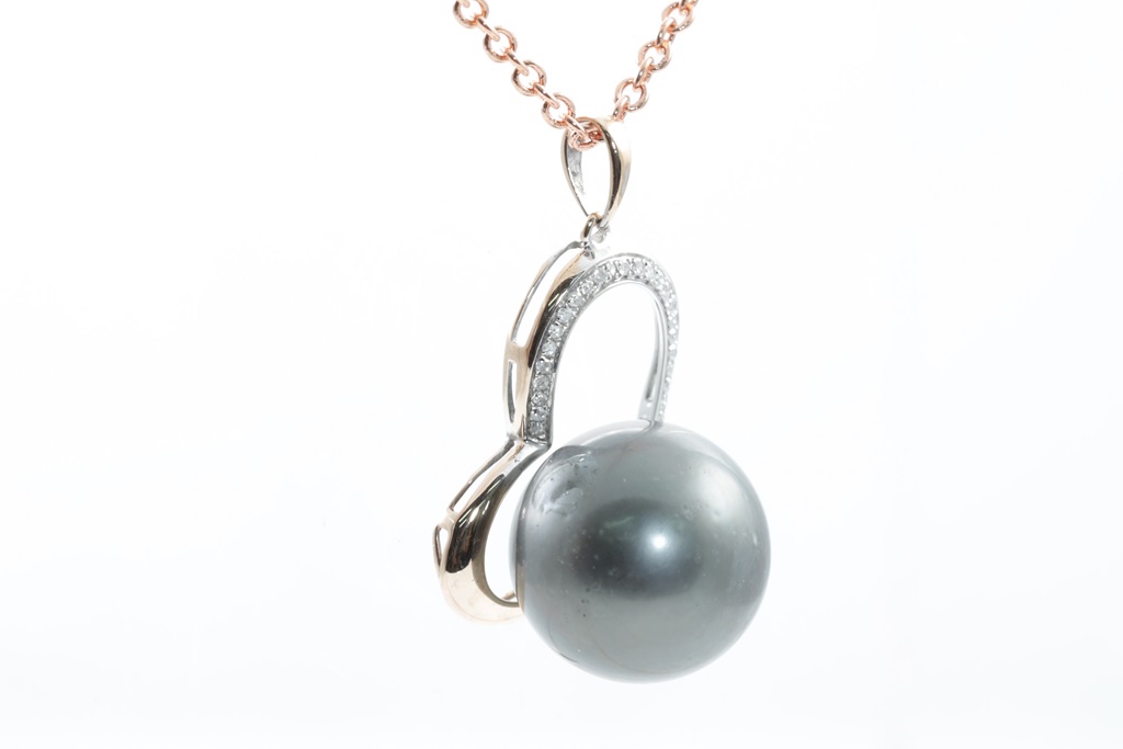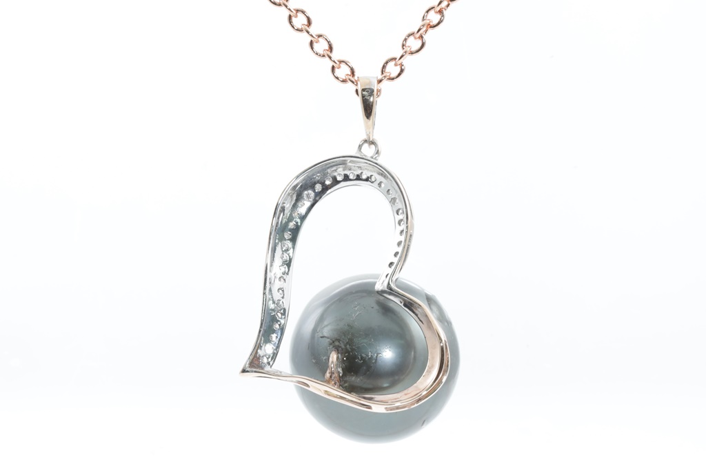 Heart shaped pendant with round Tahitian pearl of 13.5mm and round Diamonds totalling approximately 0.16cts. 9ct rose and white gold. Display chain (metal base). Weight 4.3g. (Pre-owned)