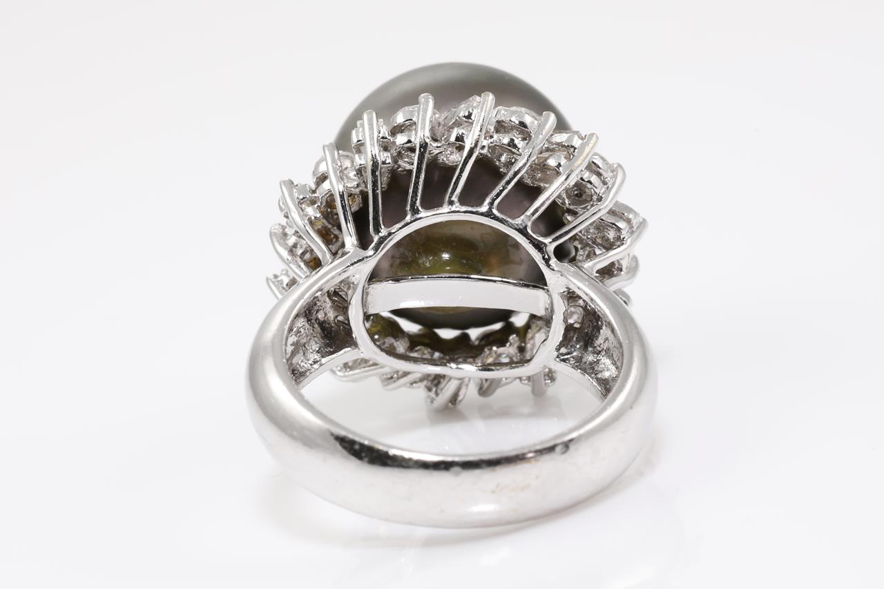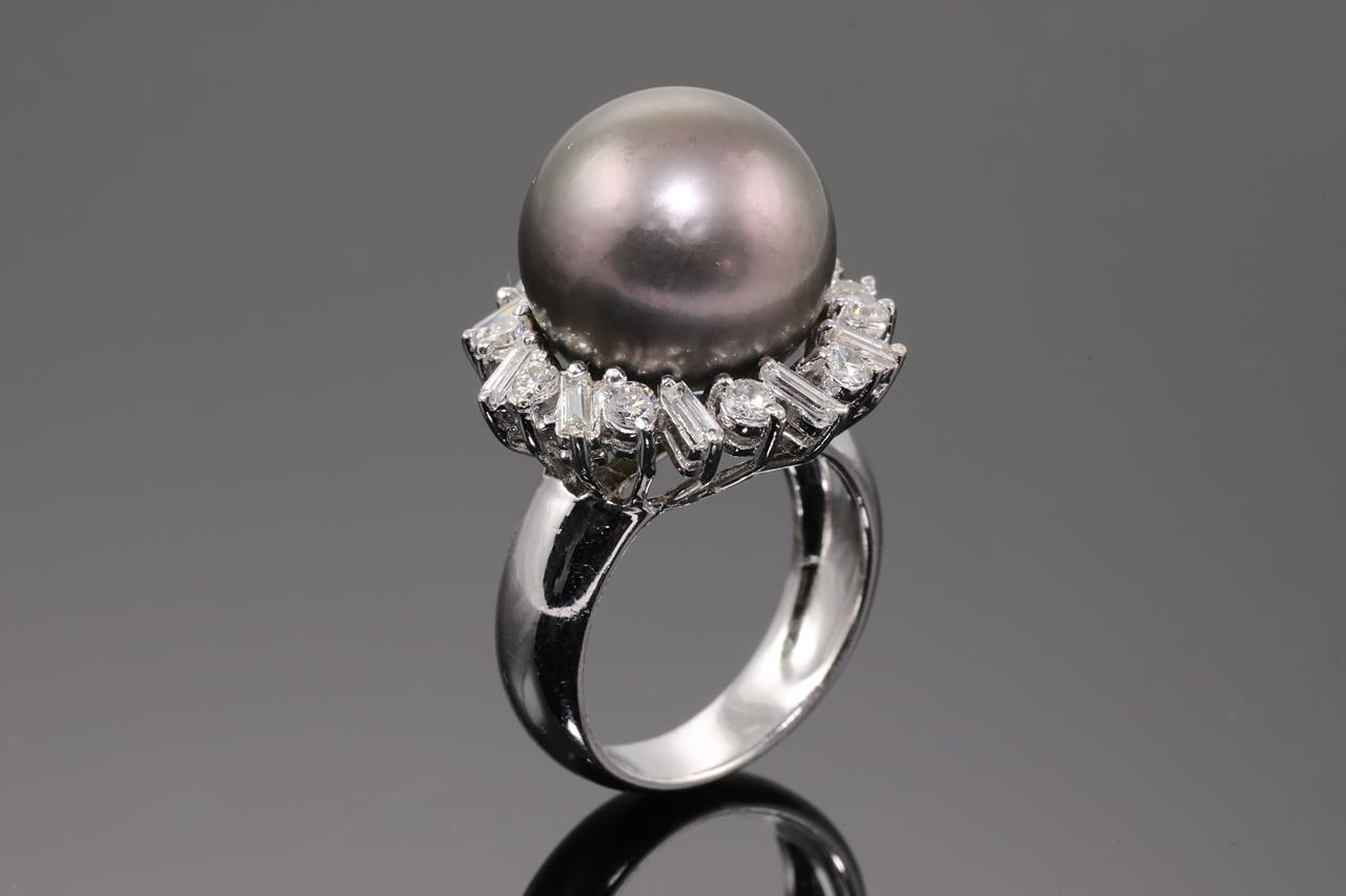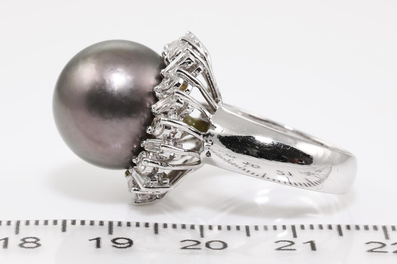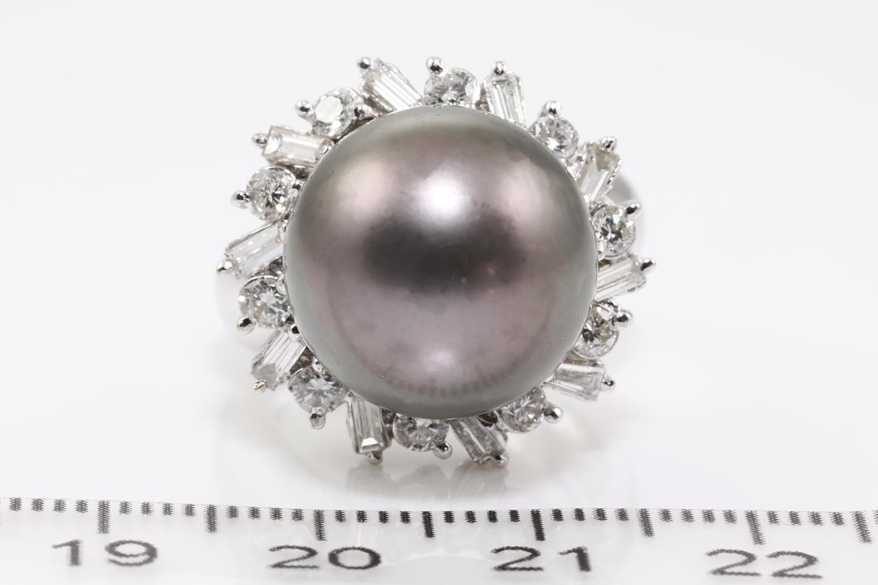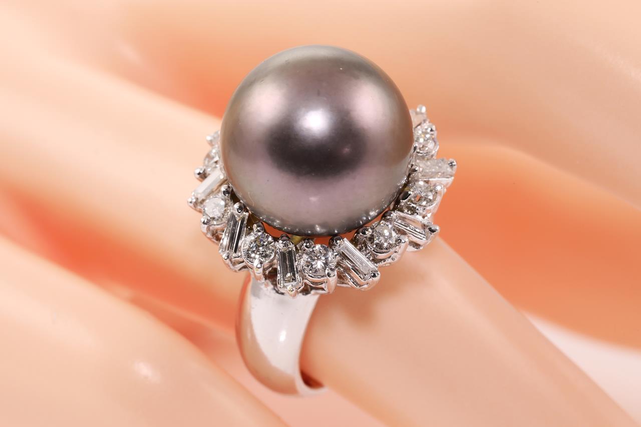Tahitian Pearl and Diamond Ring with 14.6mm Tahitian Pearl and baguette and round Diamonds totalling approximately 0.80cts (Estimated grading: G-H VS). 18ct white gold. Ring size L. Weight 13.7g. (Pre-owned)
