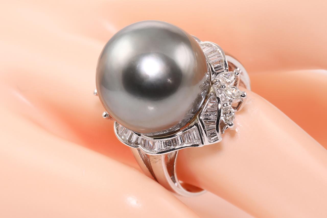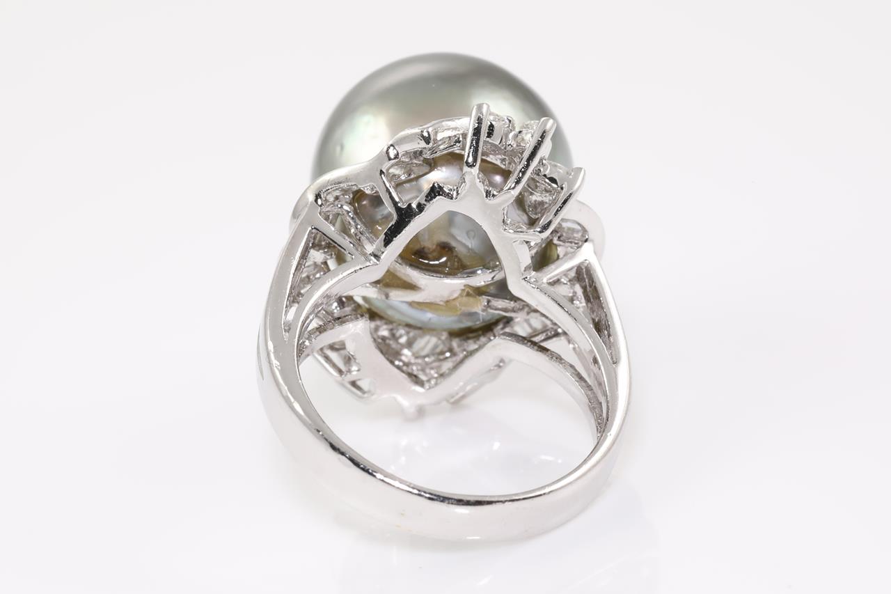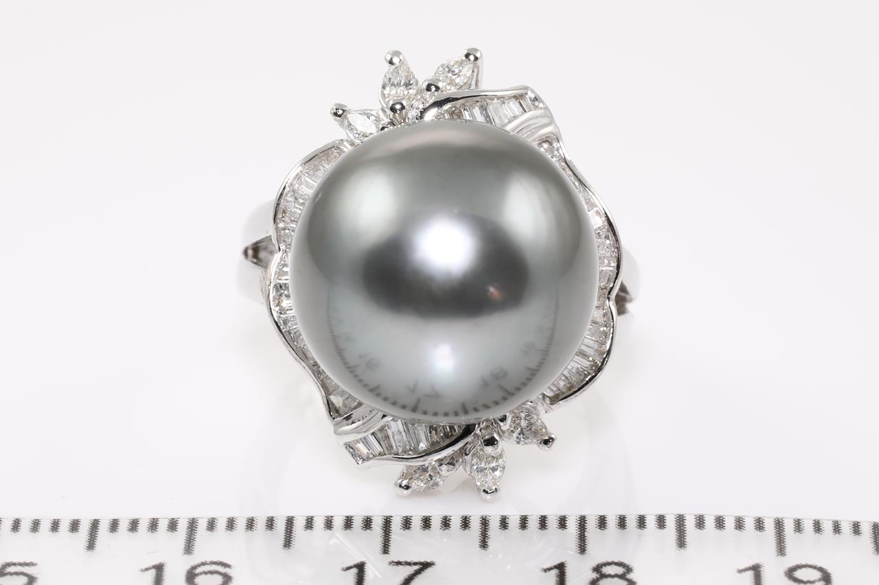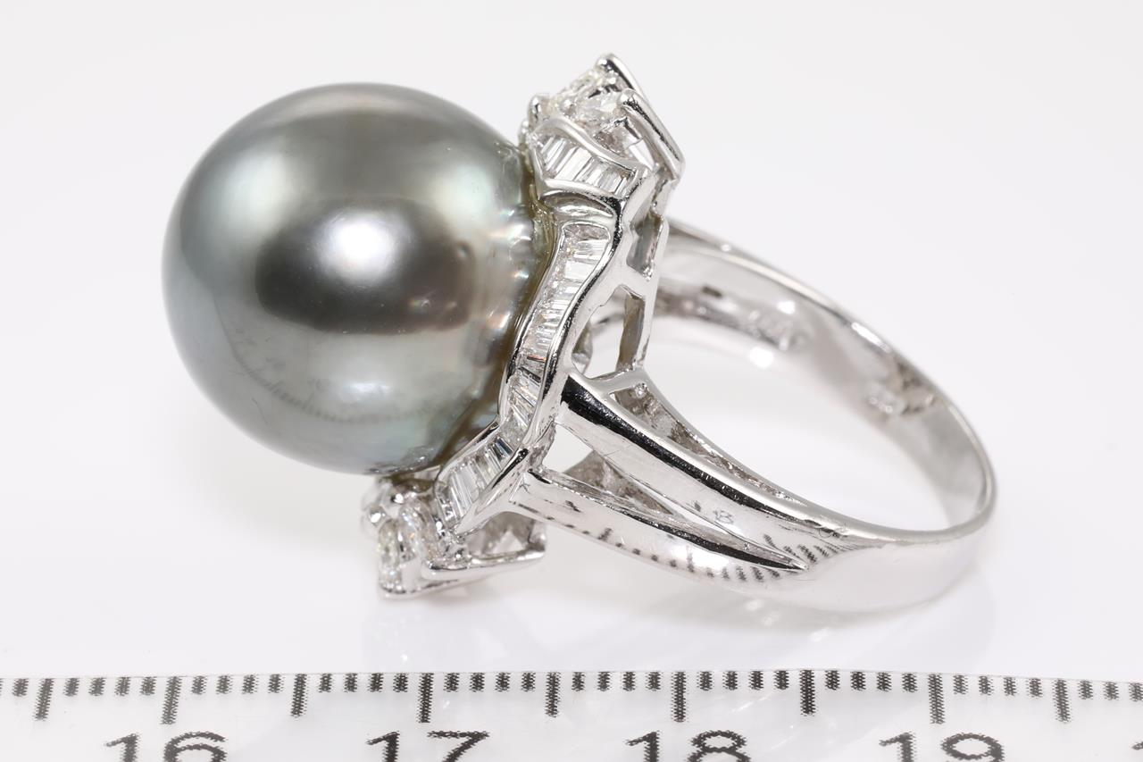 Pearl and Diamond Ring with Tahitian Pearl of 15.6mm and marquise and baguette Diamonds totalling approximately 0.65cts (Estimated grading: G-H VS). 18ct white gold. Ring size N. Weight 13.6g. (Pre-owned)