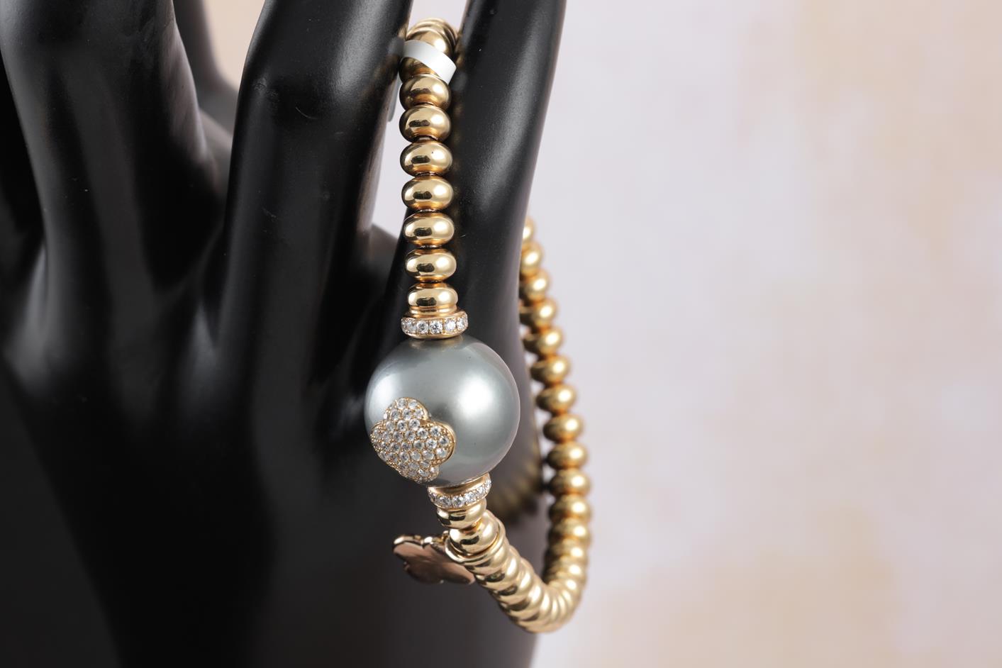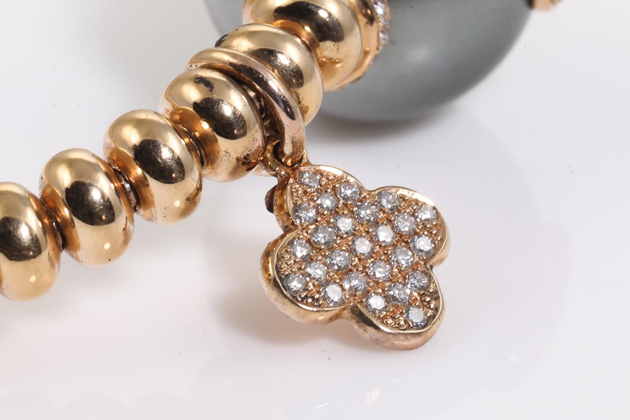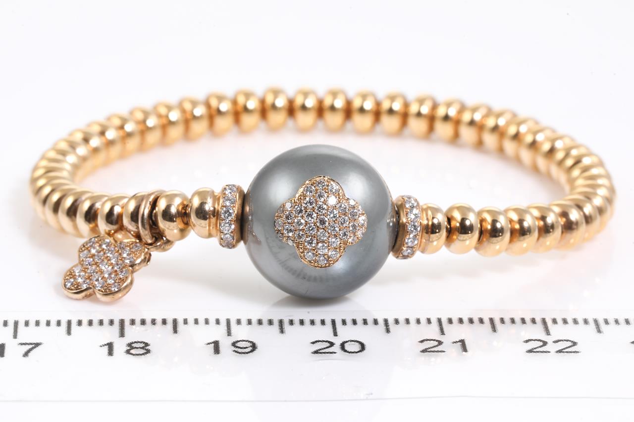 Tahitian Pearl and Diamond bracelet and a clover charm with 14.9mm Tahitian Pearl and round Diamonds totalling approximately 0.62cts (Estimated grading G-H VS) 18ct rose gold with flexible band. Circumference 16cm. Weight 21.4g. (As New)