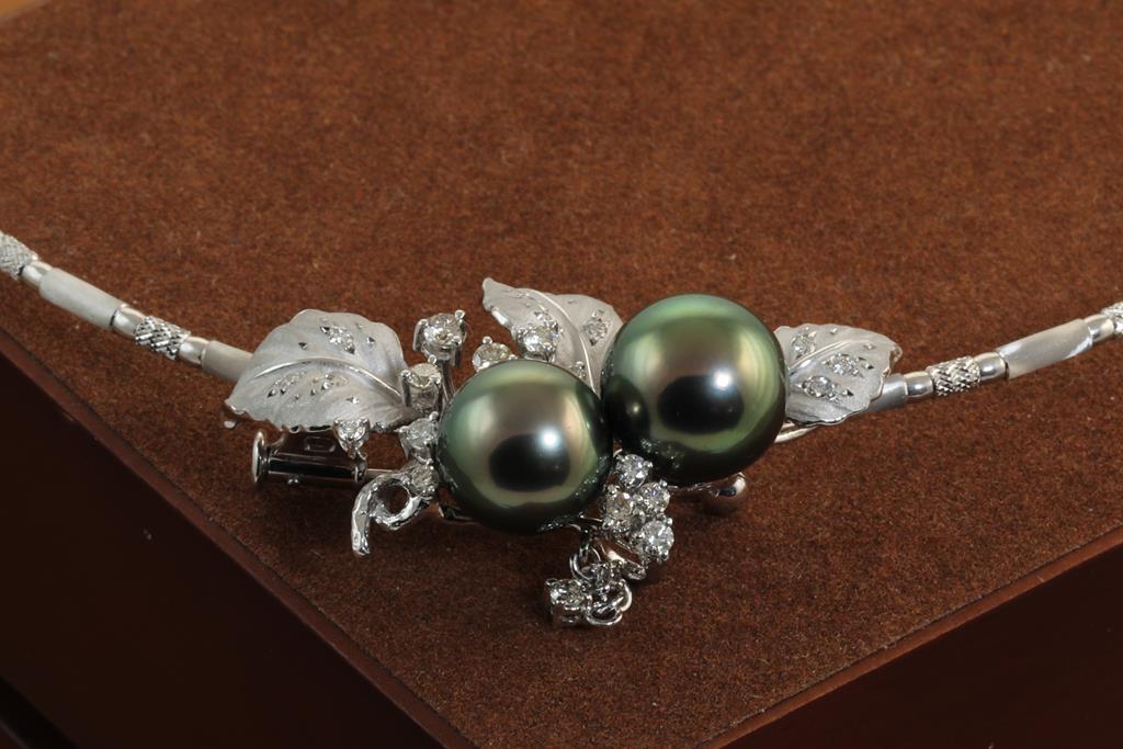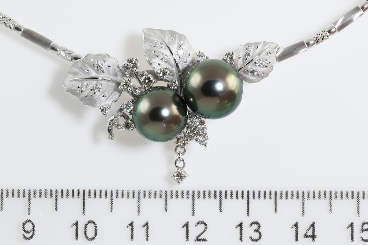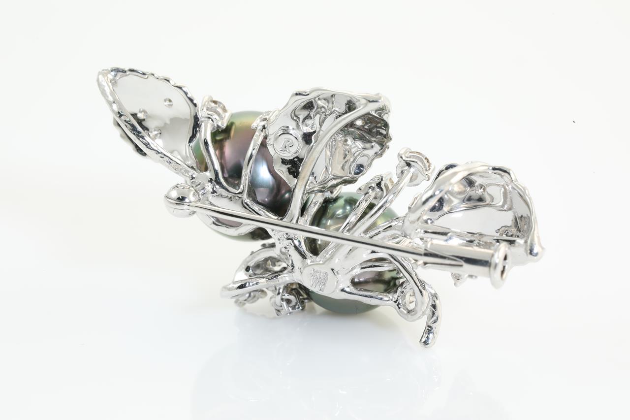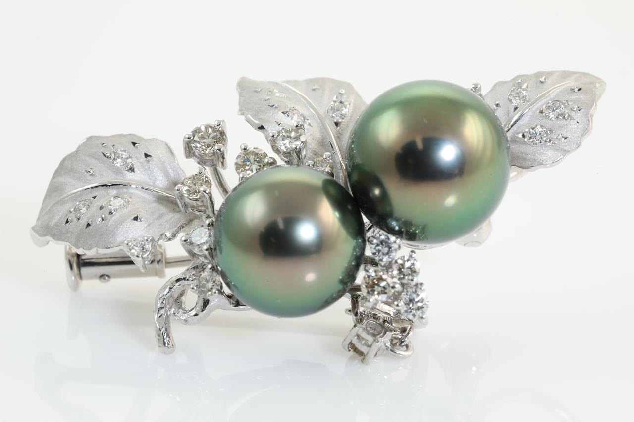 Pearl and Diamond brooch/pendant (detachable) with Tahitian Pearls of 10.0mm-11.0mm and Diamonds totalling 0.55cts (Estimated grading: H-J SI). 18ct white gold. Adjustable max length: 45cm. Weight: 18.0g (Pre-owned)
