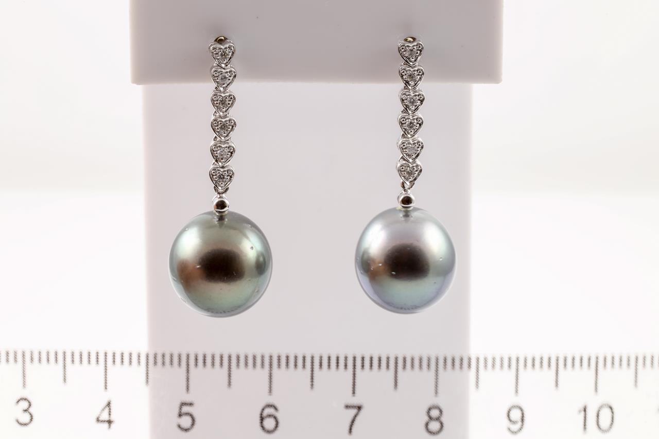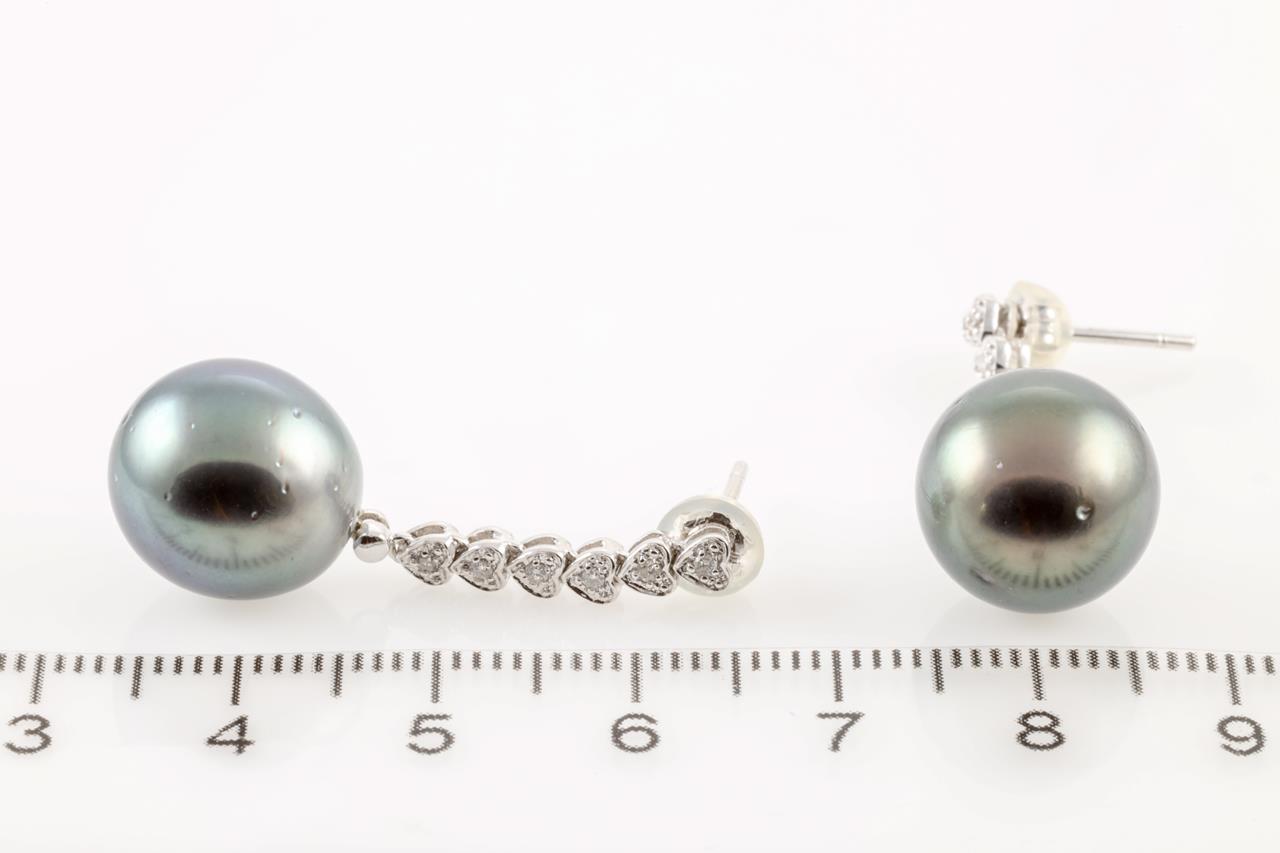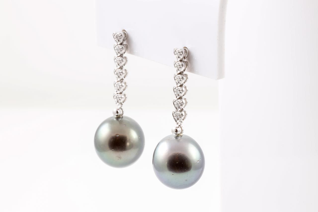 Pearl and Diamond earrings with Tahitian pearls of 12mm and Diamonds totalling approximately 0.12cts. 18ct white gold with gold & silicon backs. Weight: 7.9g (Pre-owned).