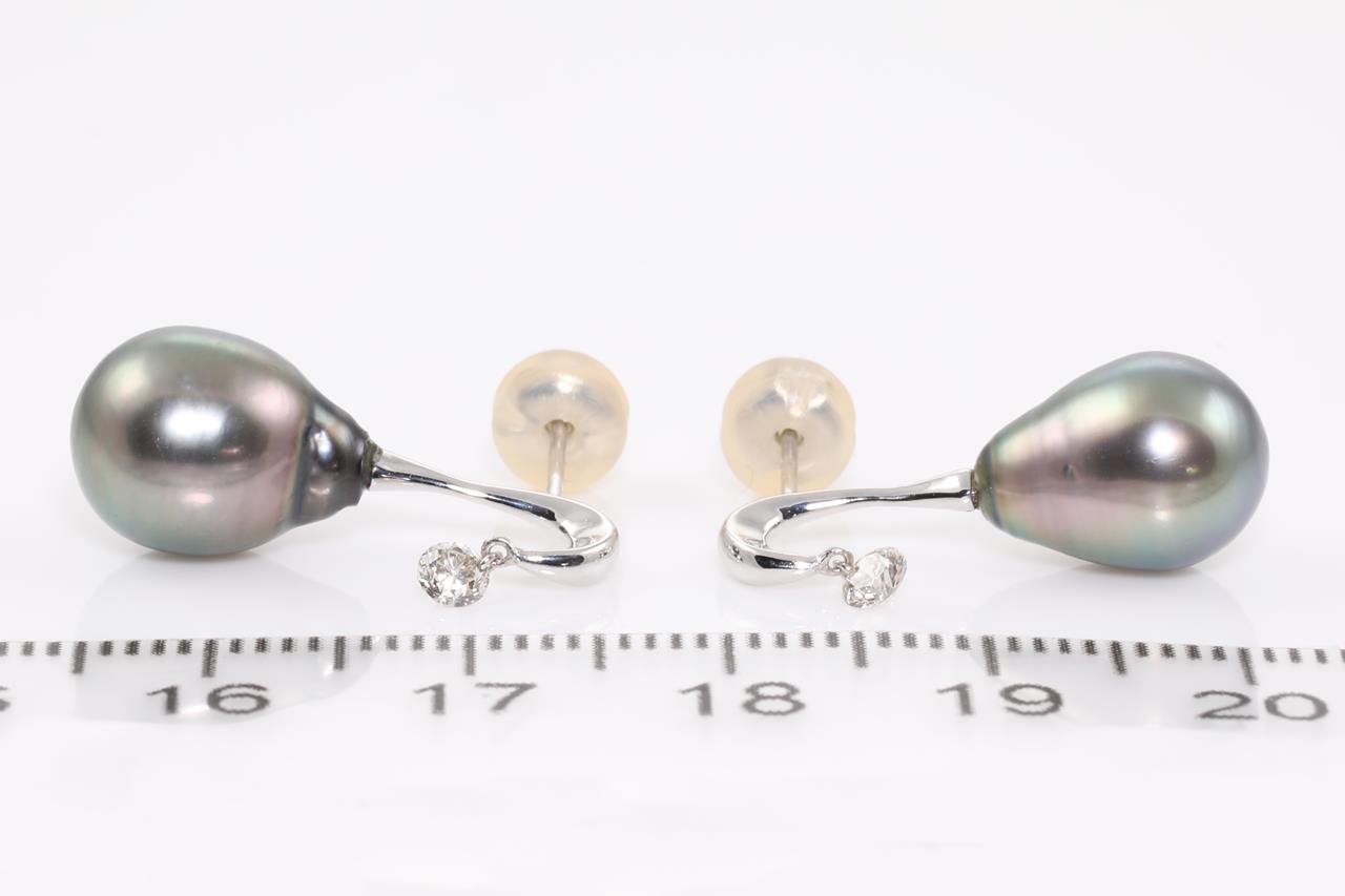 Pearl and Diamond earrings with drop shape Tahitian pearls of 8.7mm and round Diamonds totalling 0.20cts. 18ct white gold with silicon backs. Weight: 3.4g. (Pre-owned)